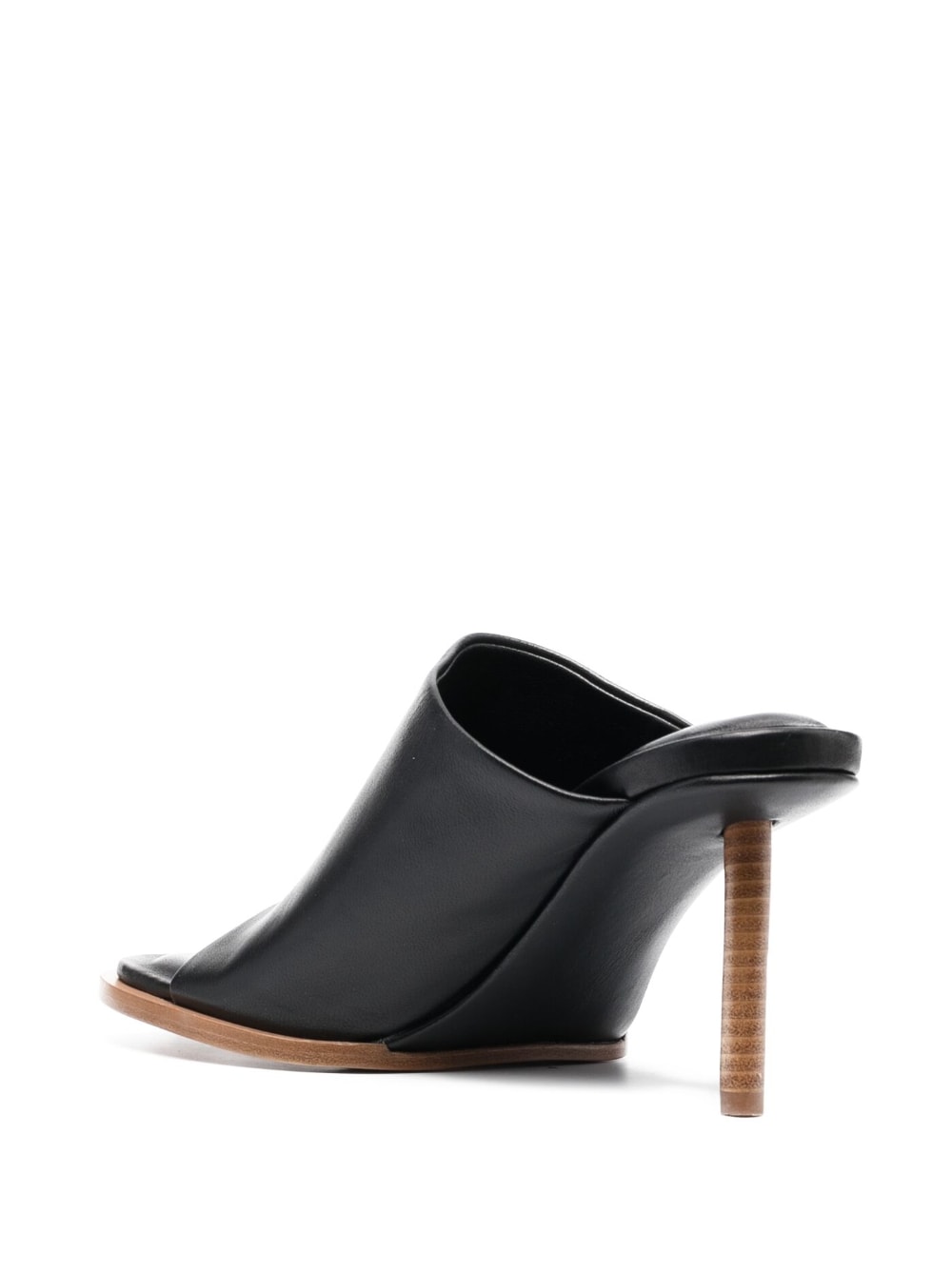 Les Mules Rond Carré leather mules from Jacquemus featuring black, calf leather, slip-on style, open toe, cushioned insole and high stiletto heel.