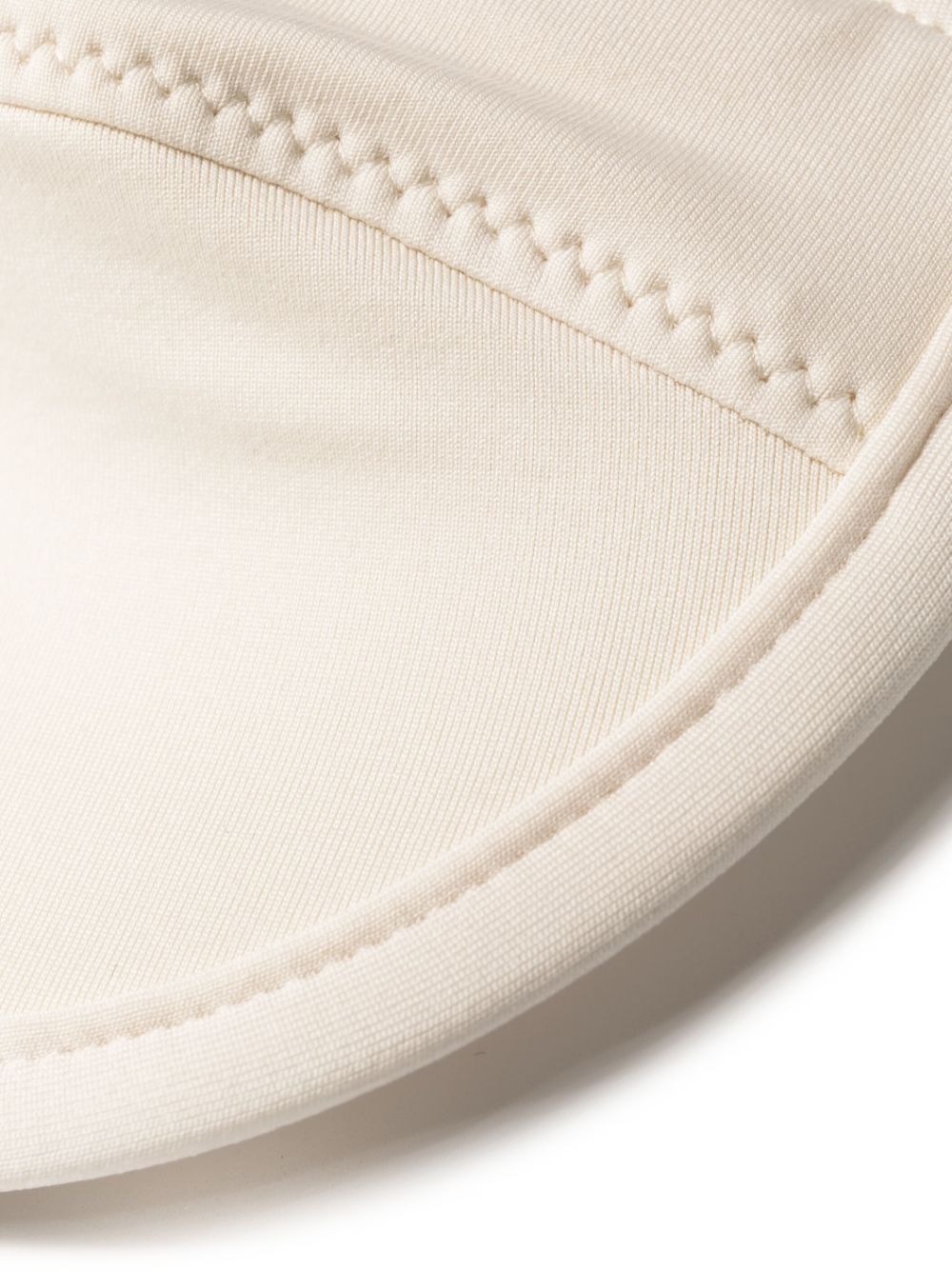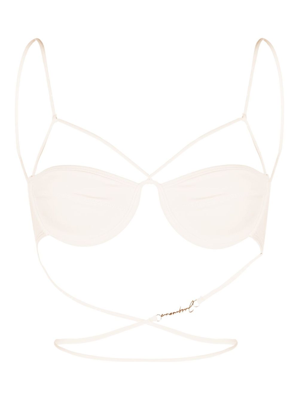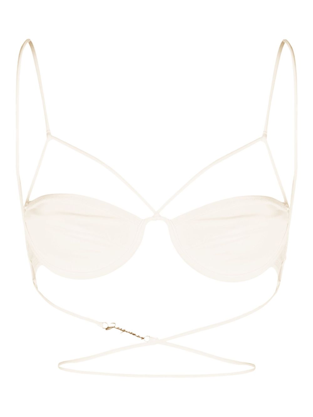 Le Haut de Maillot Signature bikini top from Jacquemus featuring milk white, recycled polyester blend, gold-tone logo plaque, underwire cup, elasticated straps and clasp fastening. Be mindful to try on swimwear over your own garments..