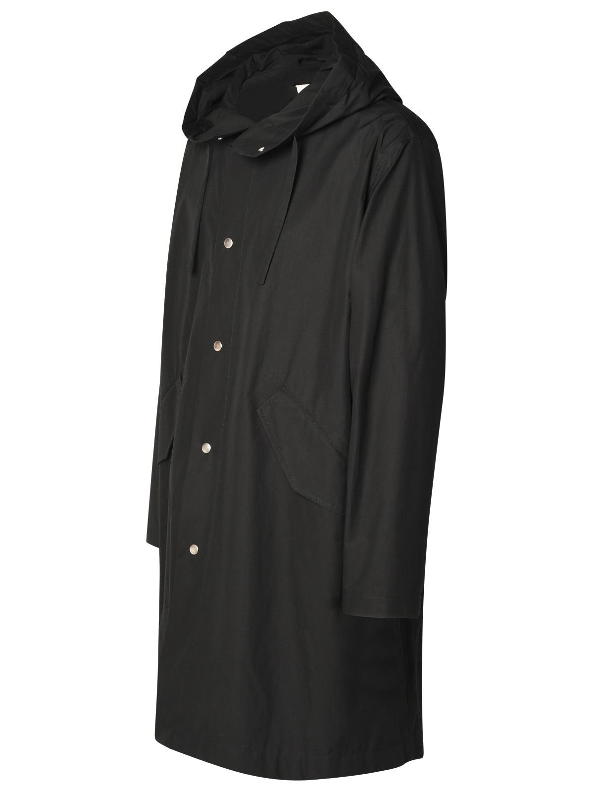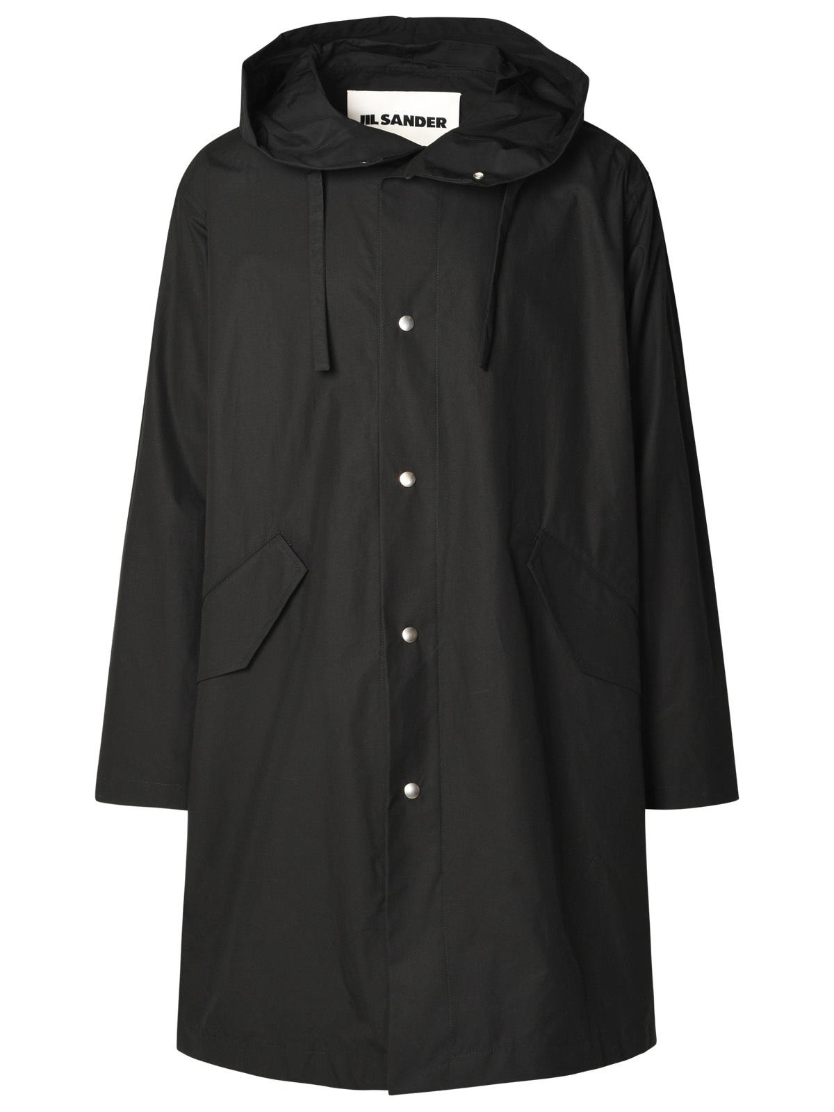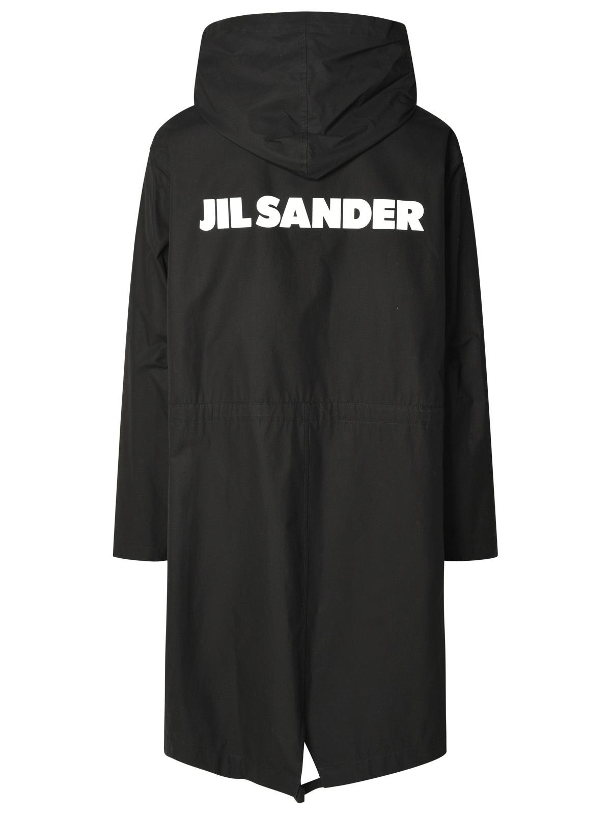 Over fit, high-neck hood with drawstring, front snap button closure, side flap pockets, inner drawstring at the waist, maxi 'Jil Sander' print on the back, snap button cuffs, lowered back hem with drawstring