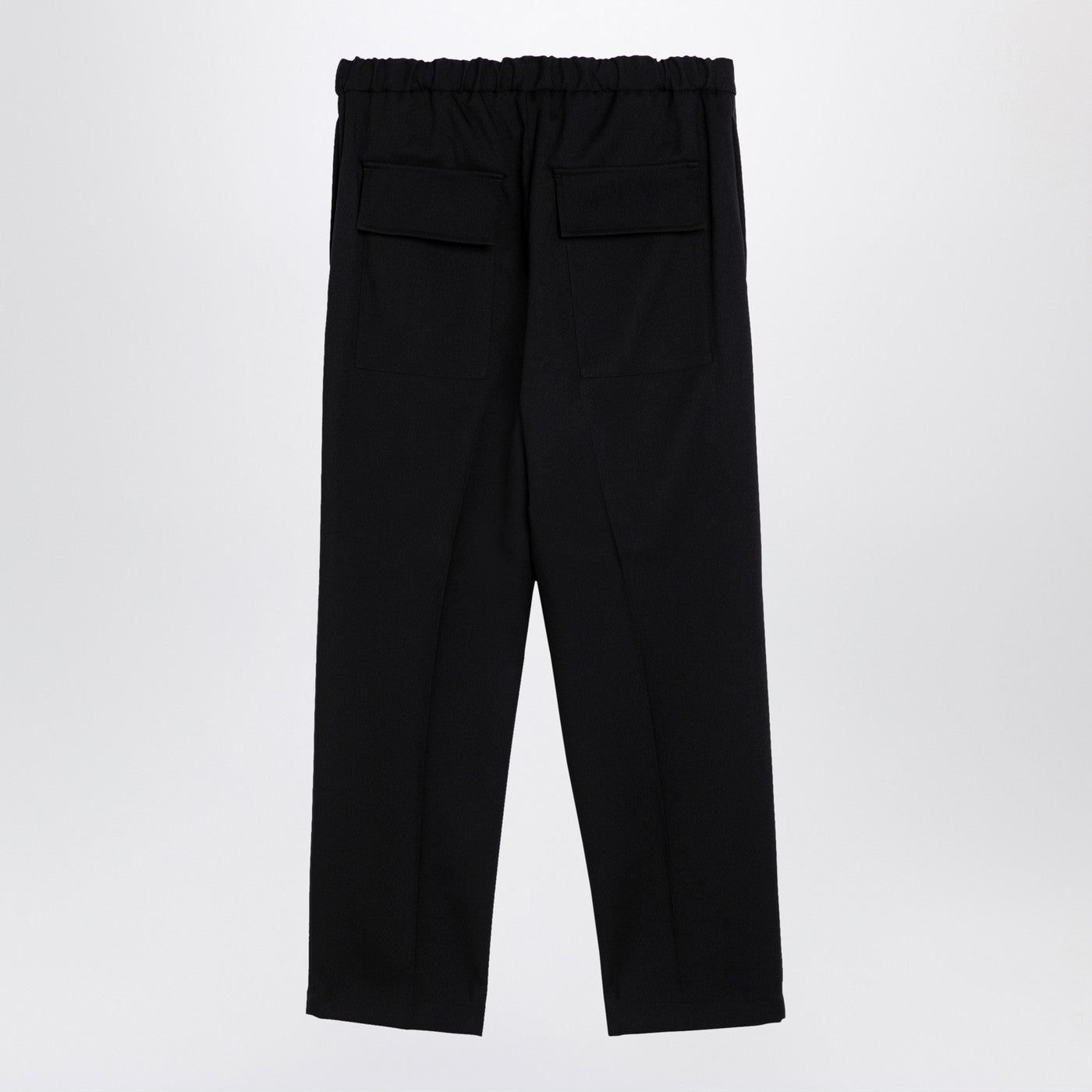Black Jil Sander regular trousers featuring an elasticated waistband, two side welt pockets, two back flap pockets and front darts.