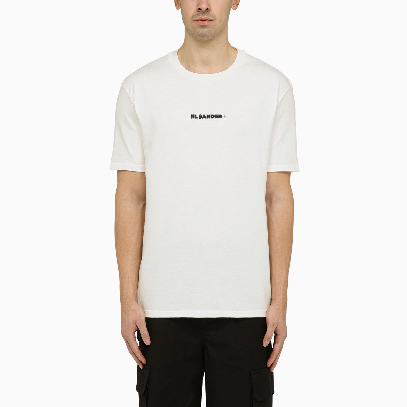 Porcelain-coloured cotton jersey regular T-shirt by Jil Sander with short sleeves and printed logo on the chest.