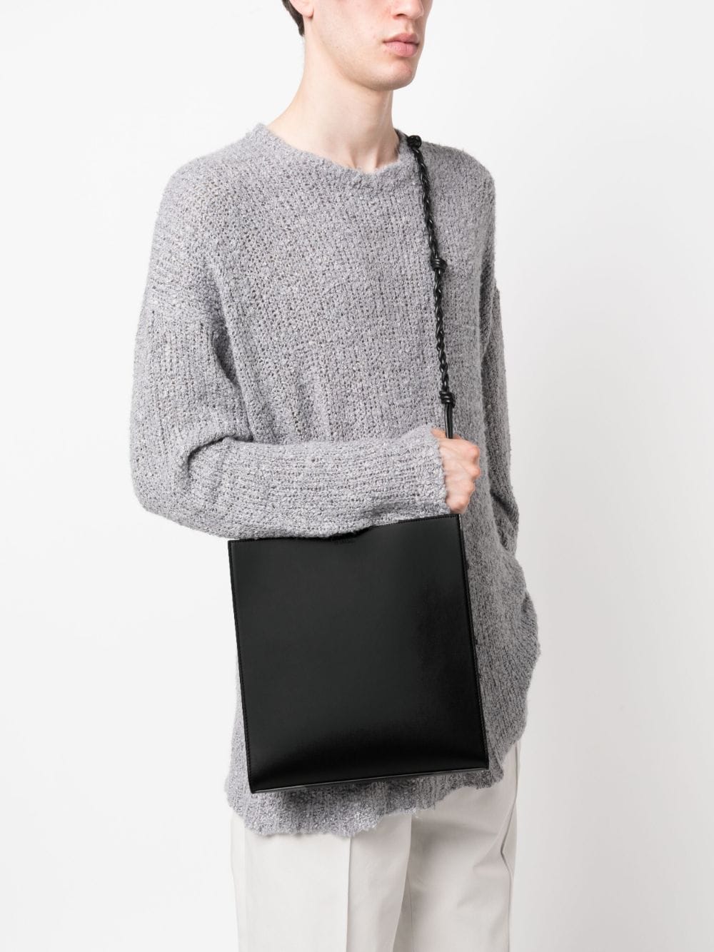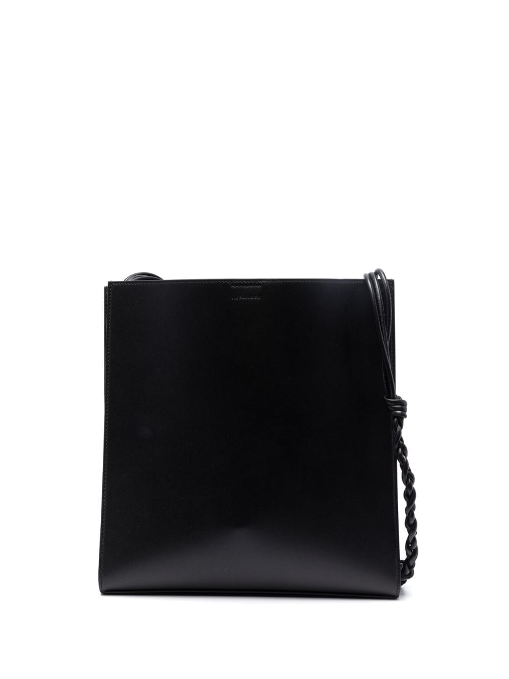 medium Tangle leather shoulder bag from JIL SANDER featuring black, calf leather, polished finish, embossed logo to the front, embossed internal logo, tonal stitching, rectangle shape, magnetic fastening, single braided shoulder strap, internal patch pockets and main compartment.