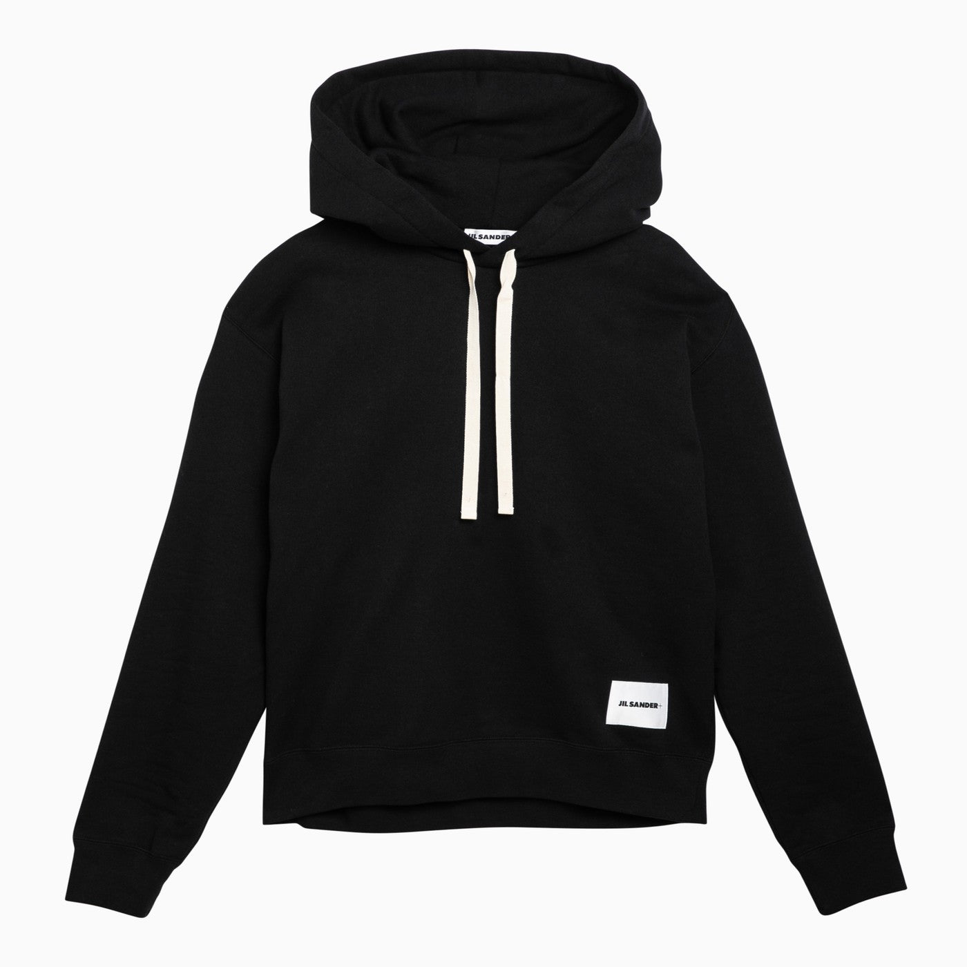Black cotton jersey loose sweatshirt by Jil Sander features an adjustable hood with drawstrings, long sleeves and a logo patch on the front.