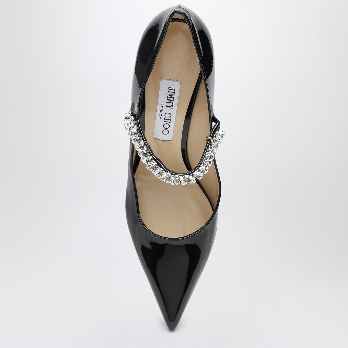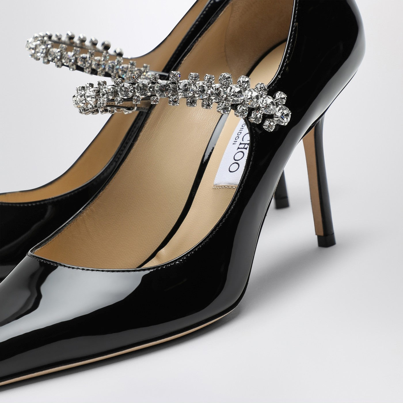 Black patent leather décolleté from Jimmy Choo featuring a crystal strap, pointed design, slim heel and leather sole.