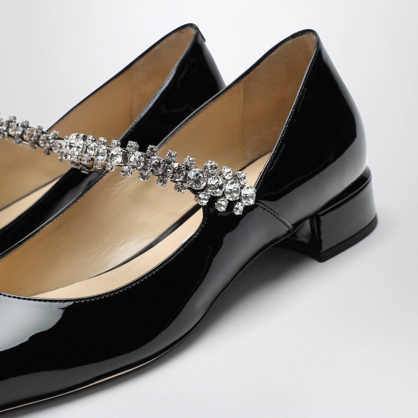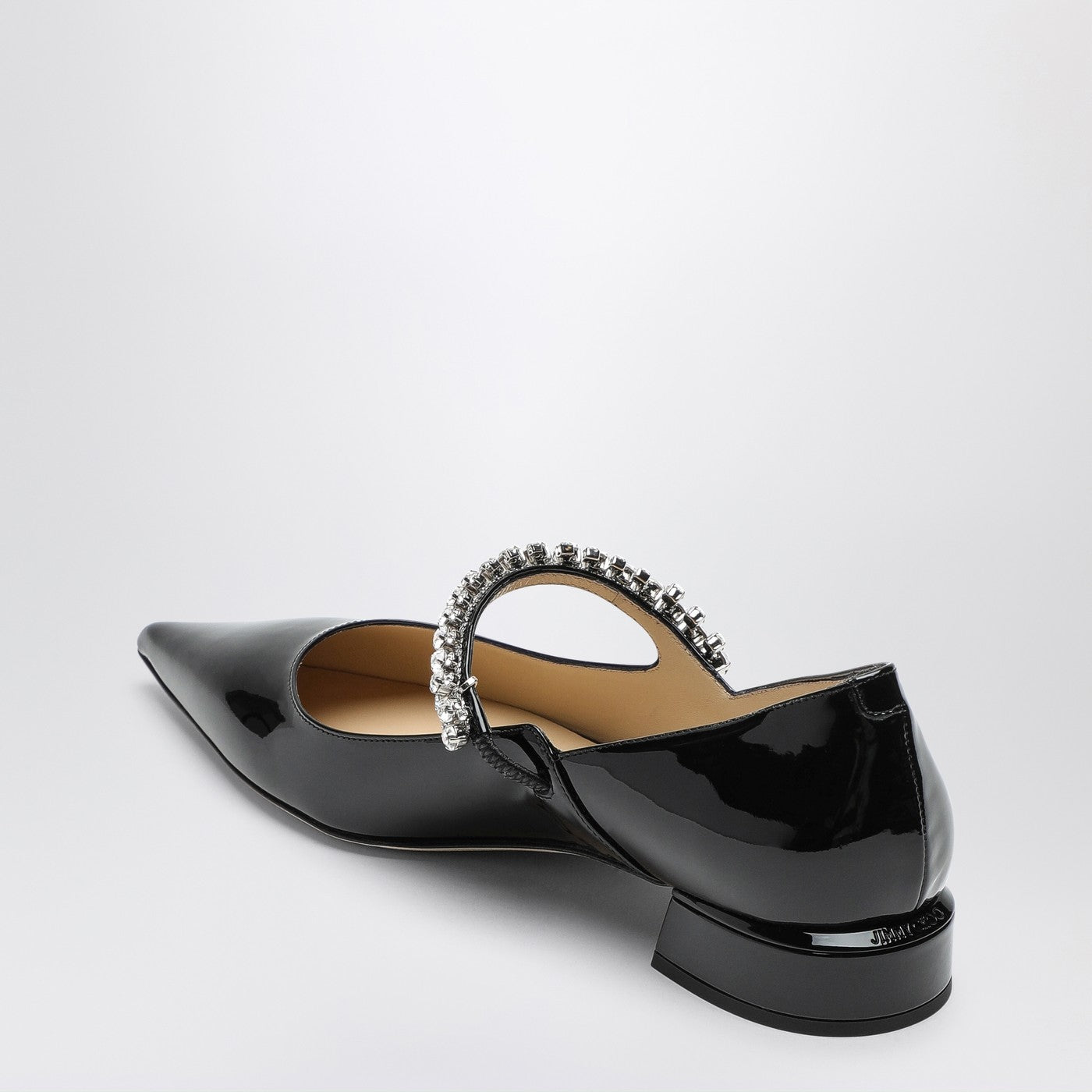 Ballerina shoes by Jimmy Choo in black patent leather featuring a crystal strap, a pointed design and a leather sole.