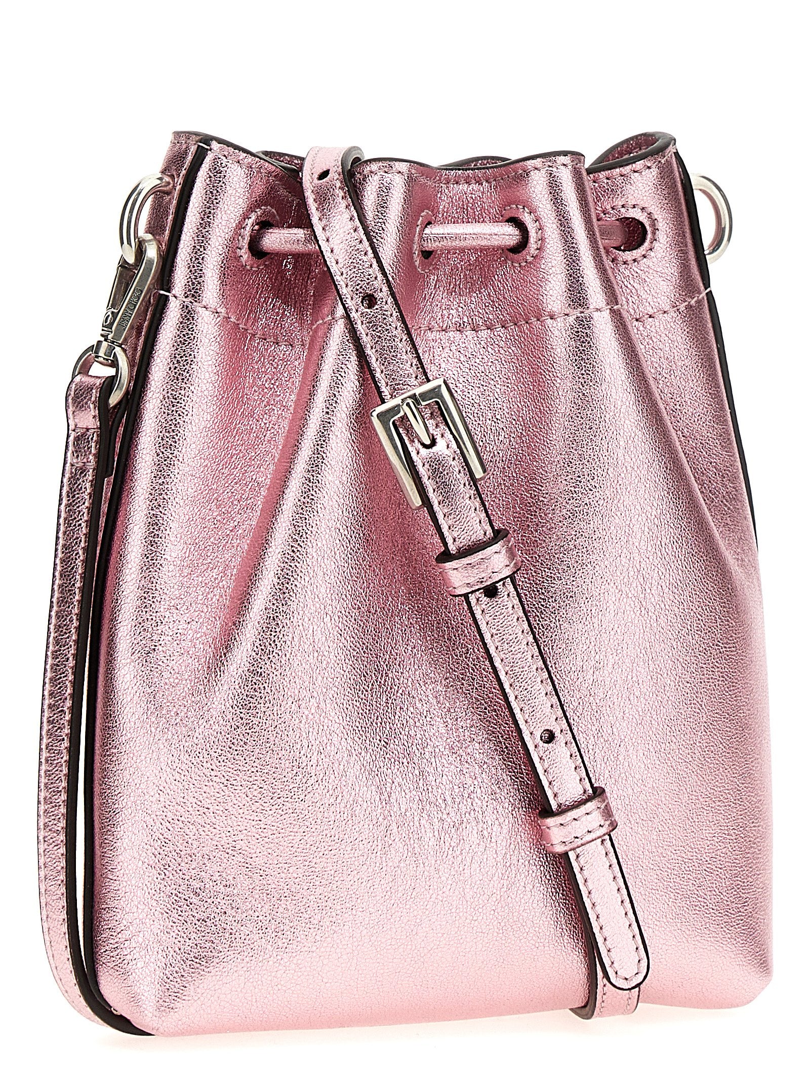 'Bon Bon' bucket bag in shiny metallic leather with drawstring closure, adjustable and removable leather shoulder strap.