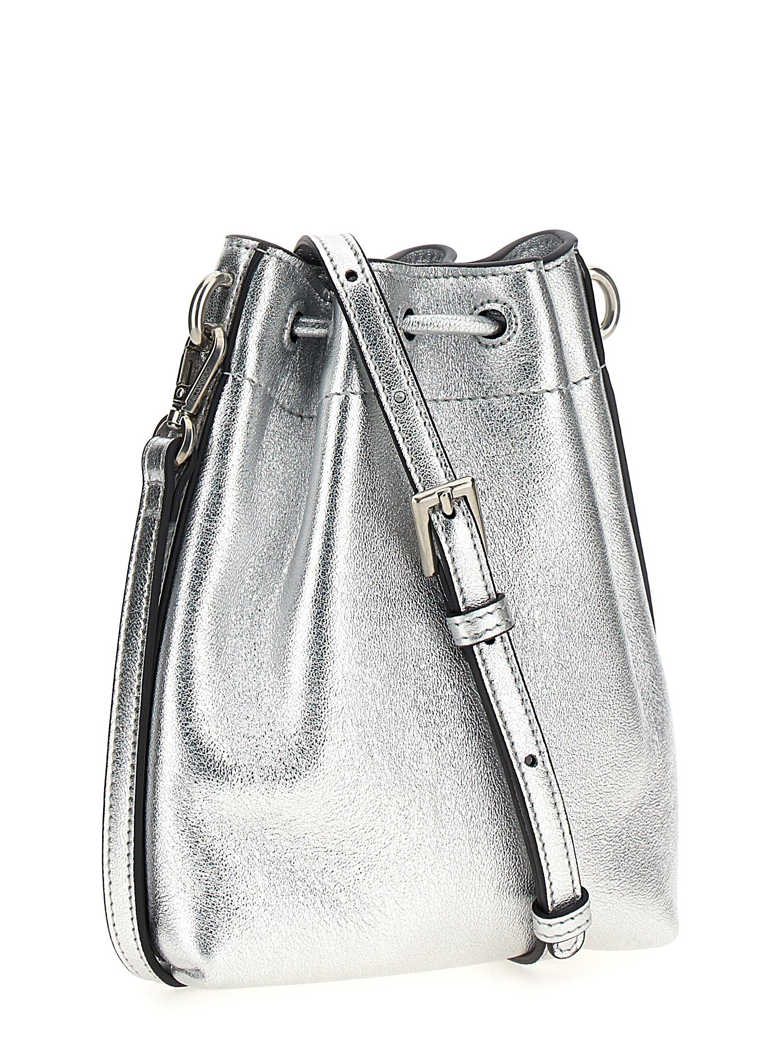 'Bon Bon' bucket bag in shiny metallic leather with drawstring closure, adjustable and removable leather shoulder strap.