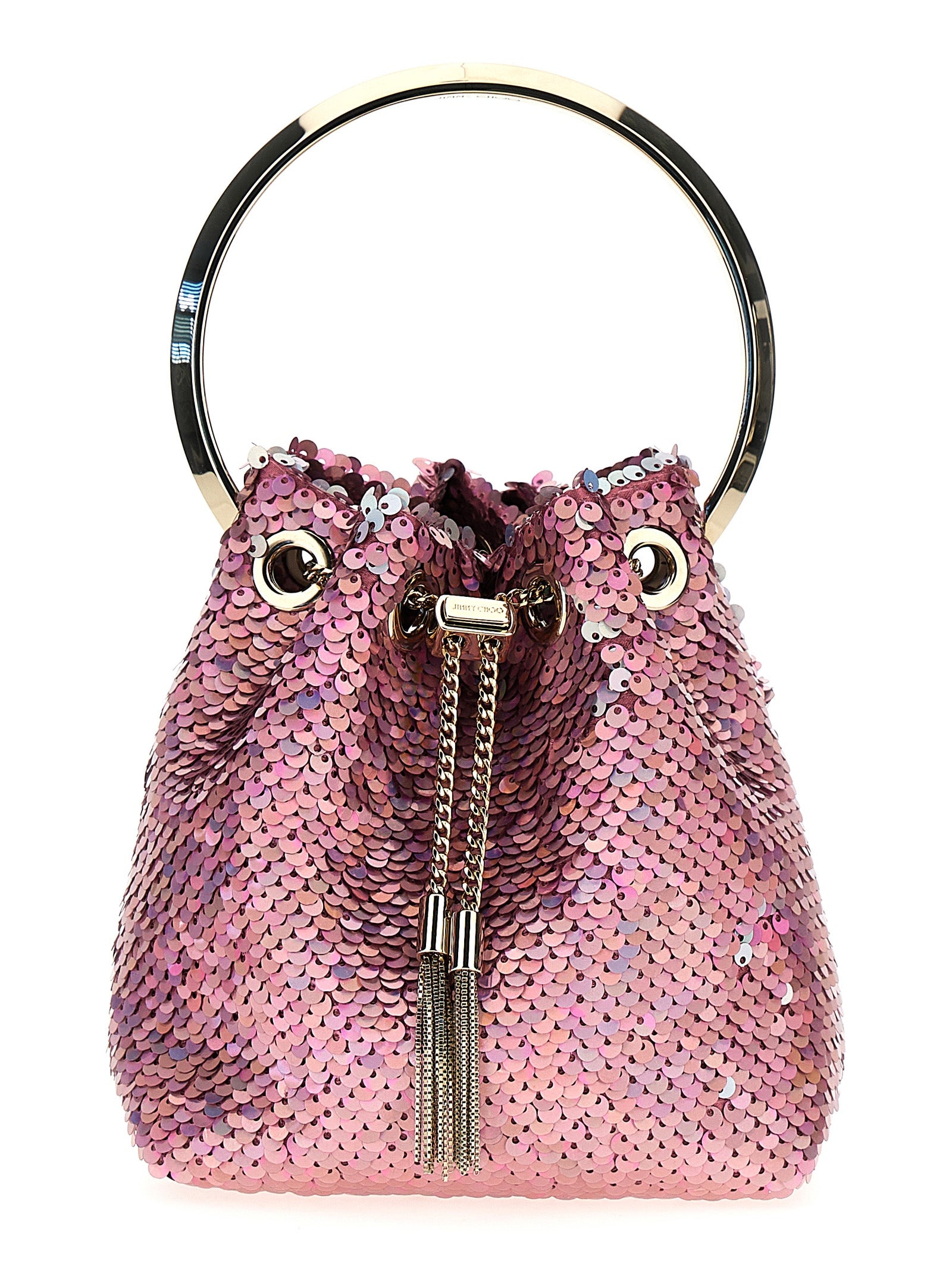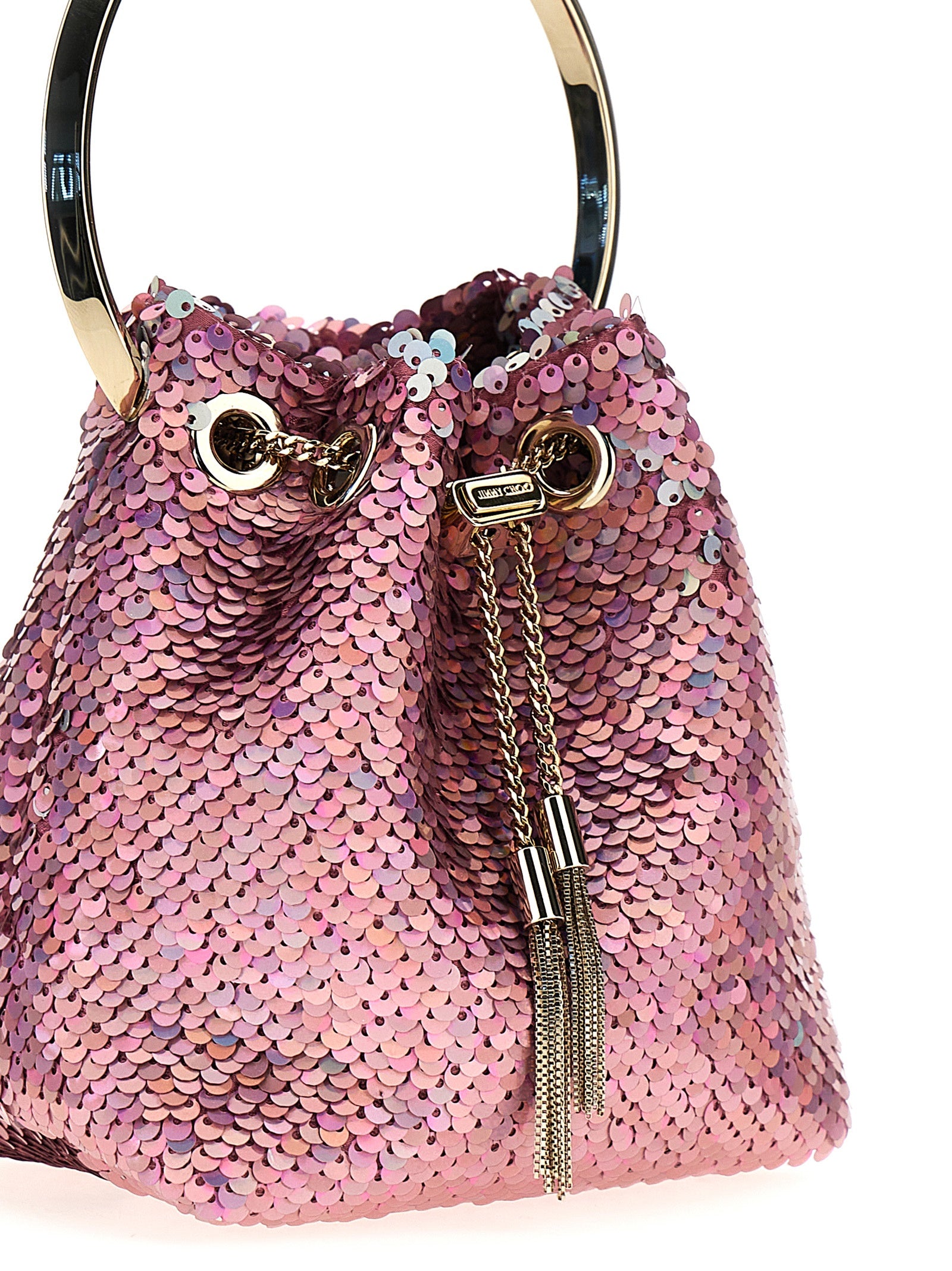 Bon Bon bucket bag in fabric covered with sequins, circular metal handle, metal drawstring with tassels, and removable chain shoulder strap.