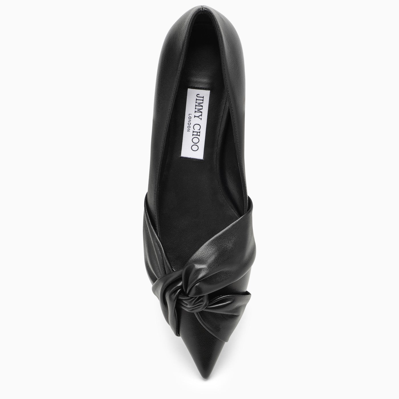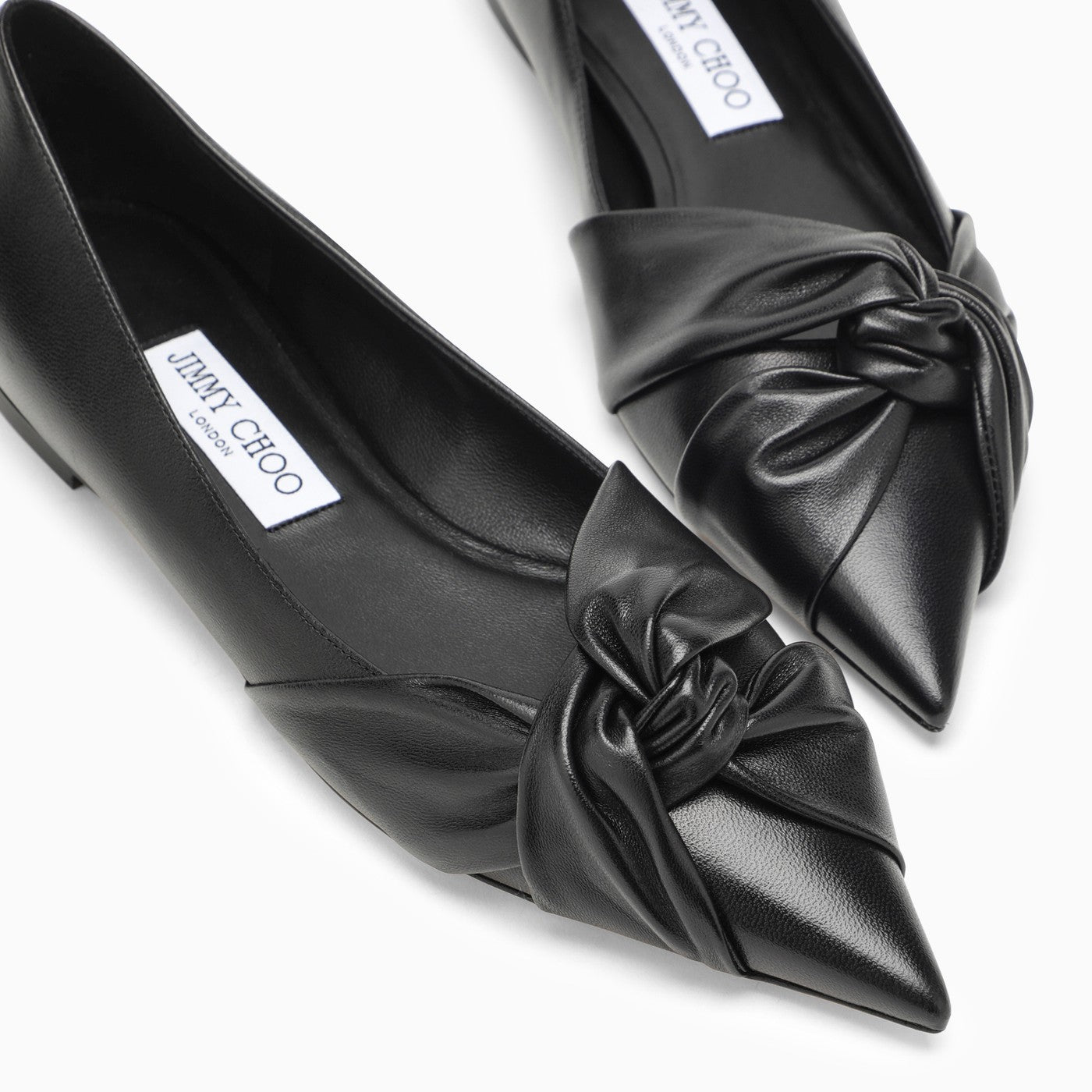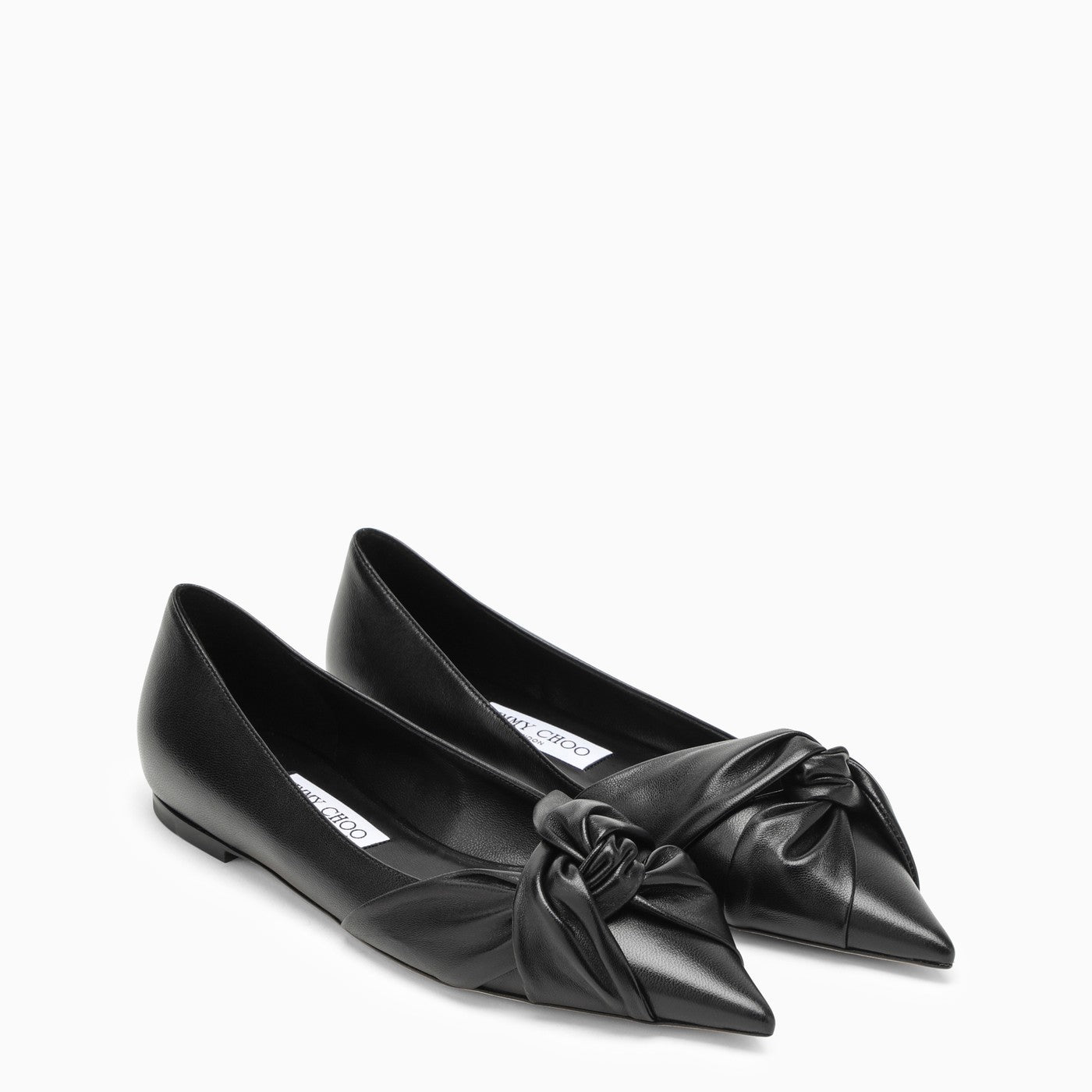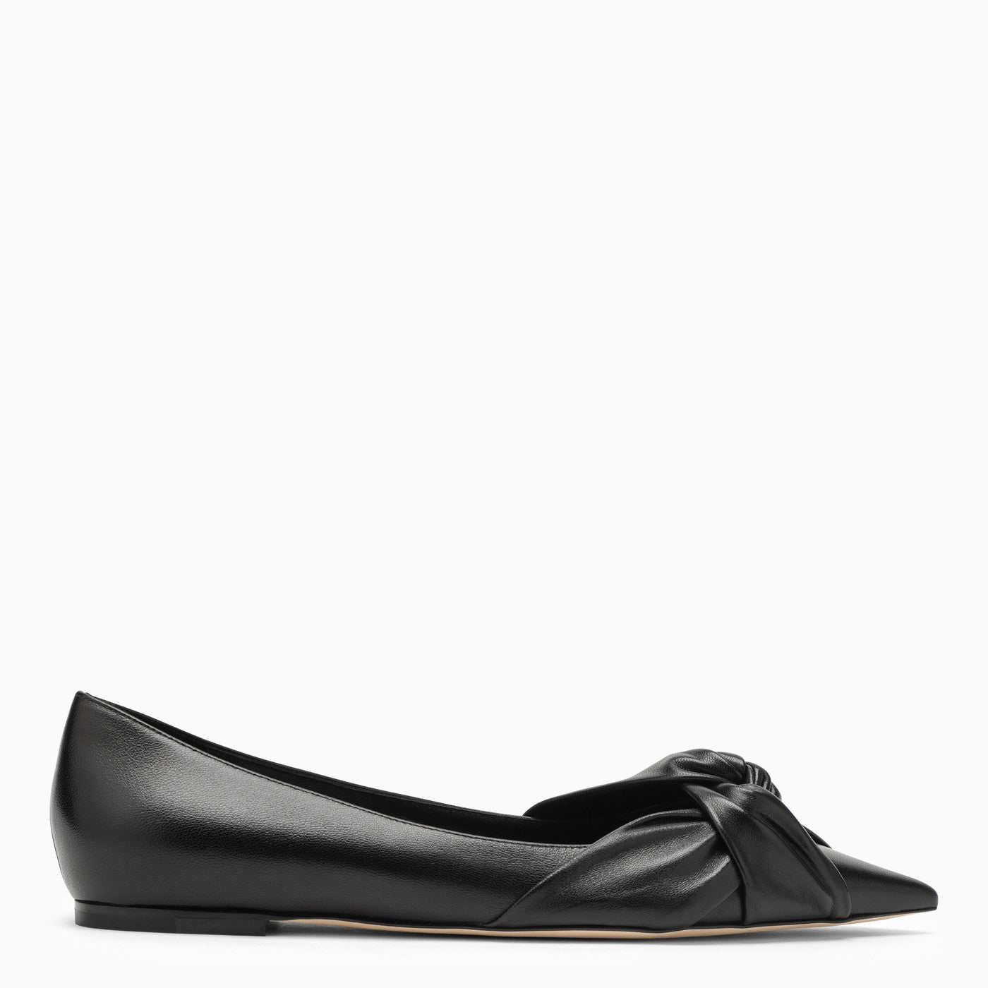Black leather ballerina by Jimmy Choo featuring a pointed toe design, a knot on the front and a leather sole.