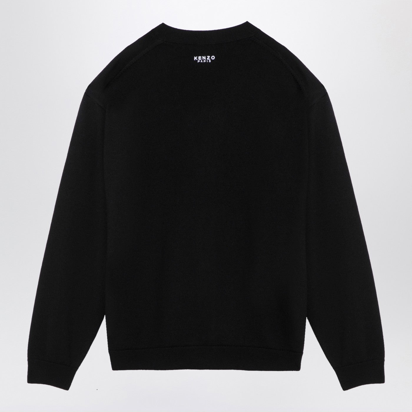 Black wool cardigan from Kenzo featuring a V-neck, long sleeves, a front button fastening, a logo patch on the chest, contrasting embroidered lettering on the back and ribbed hems.
