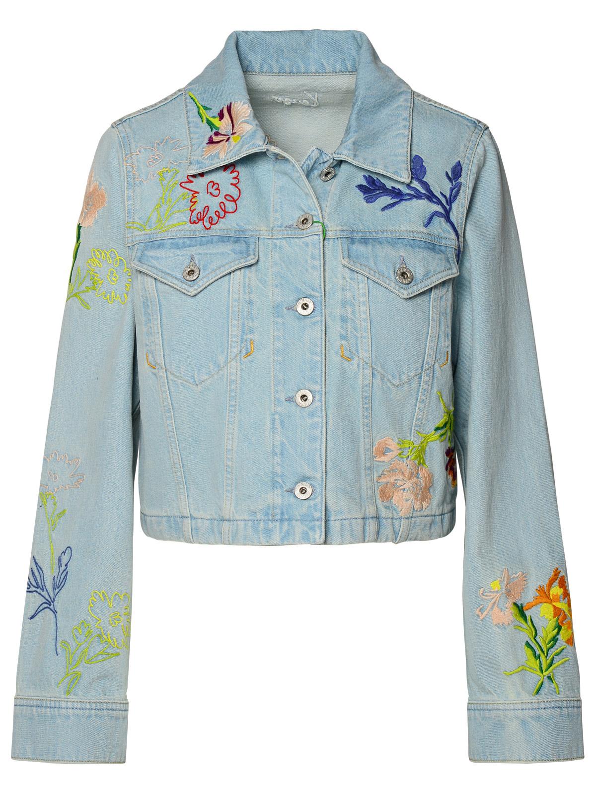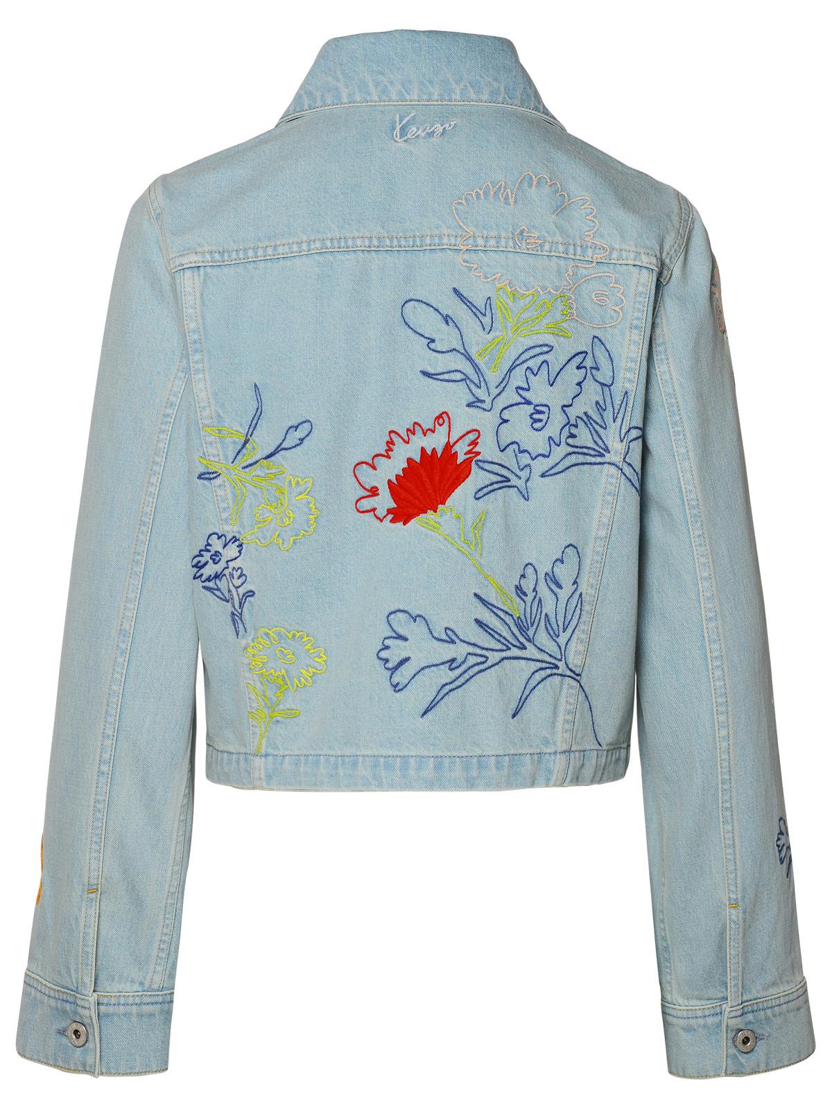 Japanese denim jacket with 'Kenzo Drawn Flowers' embroidery, classic collar, front button closure, flap patch pockets on the chest, logo embroidery on the back, button cuffs