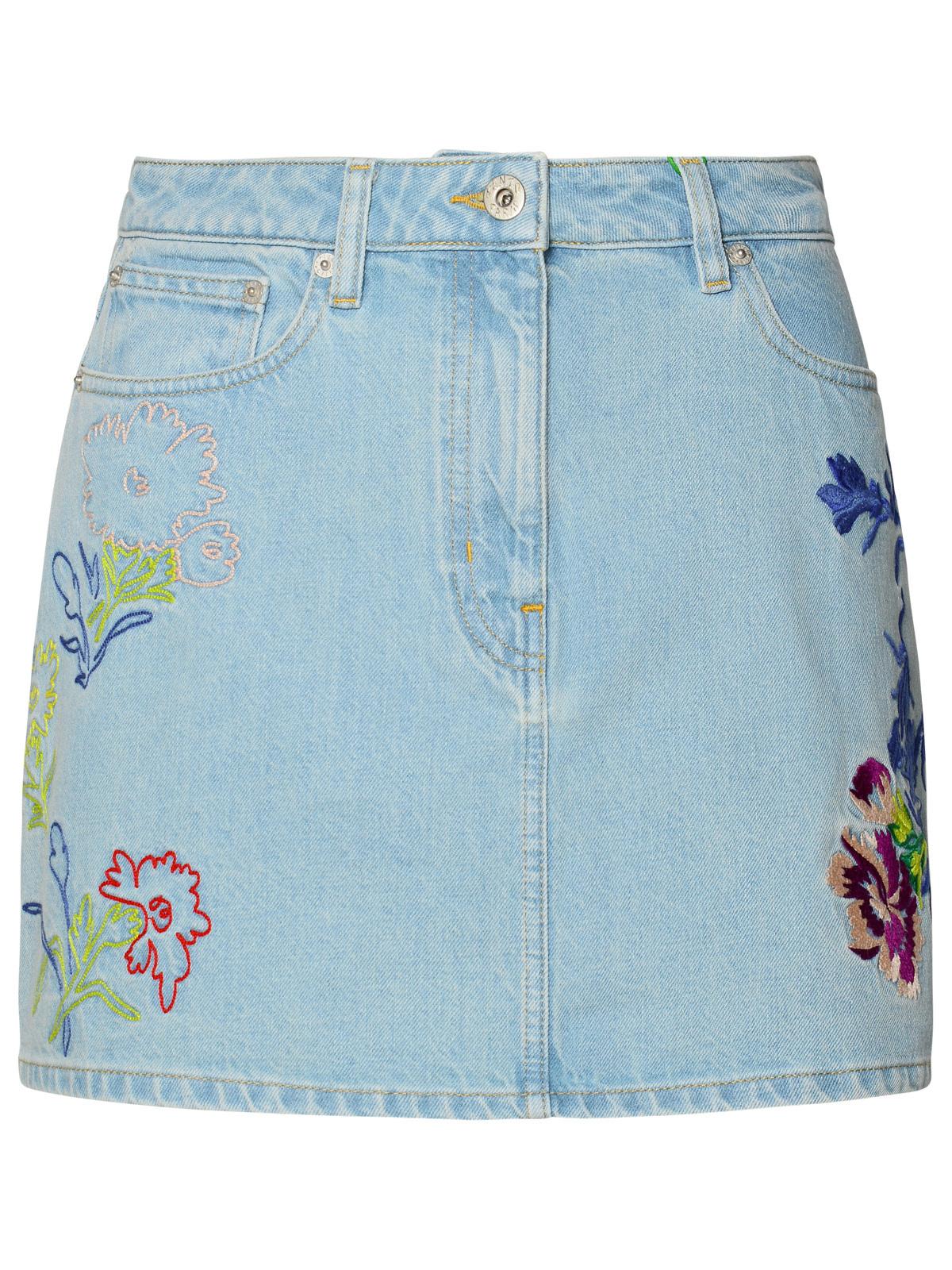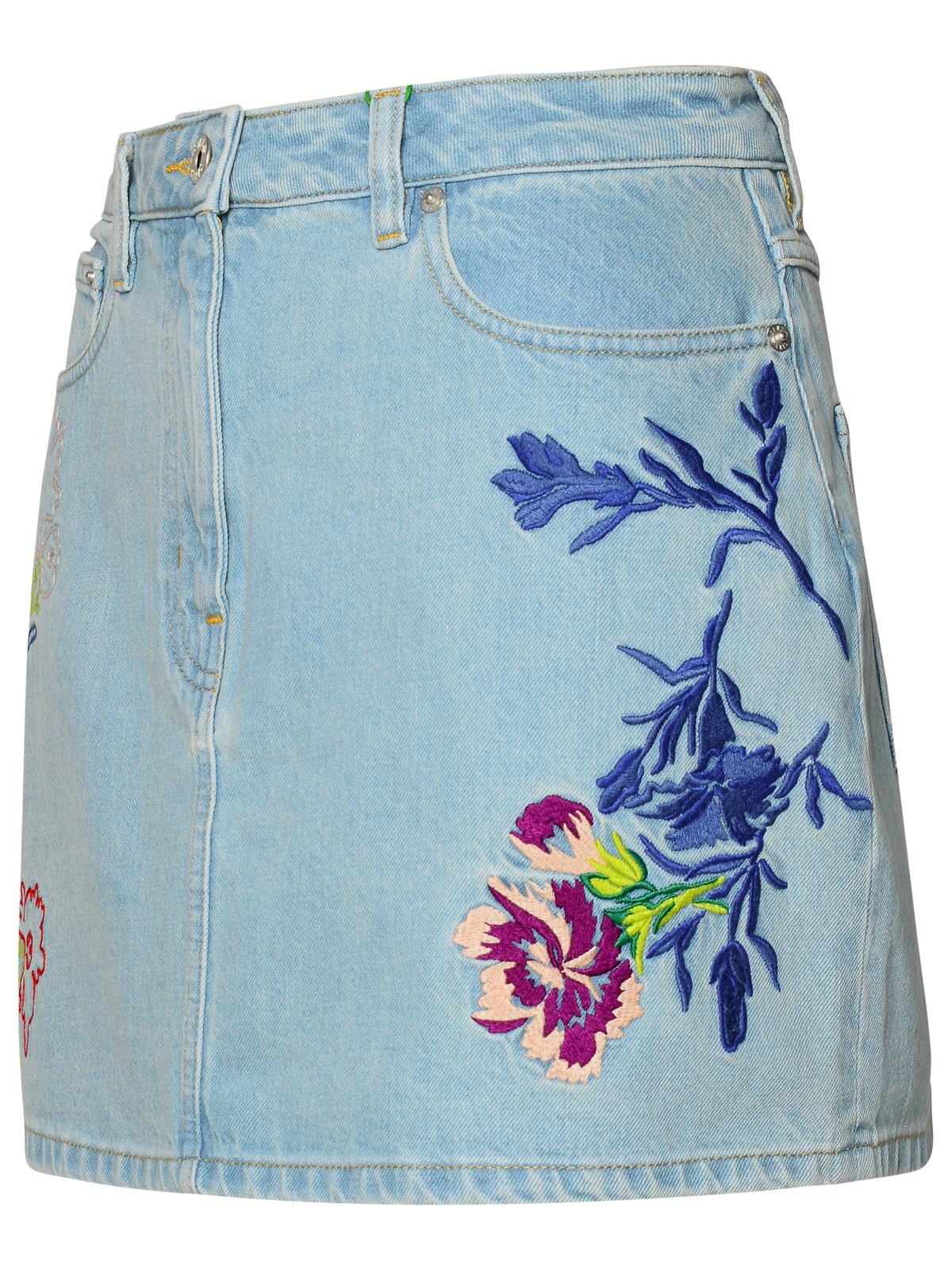 Japanese denim miniskirt with 'Kenzo Drawn Flowers' embroidery, belt loops at the waist, zip and button closure, five pockets, logo embroidery on the back pocket
