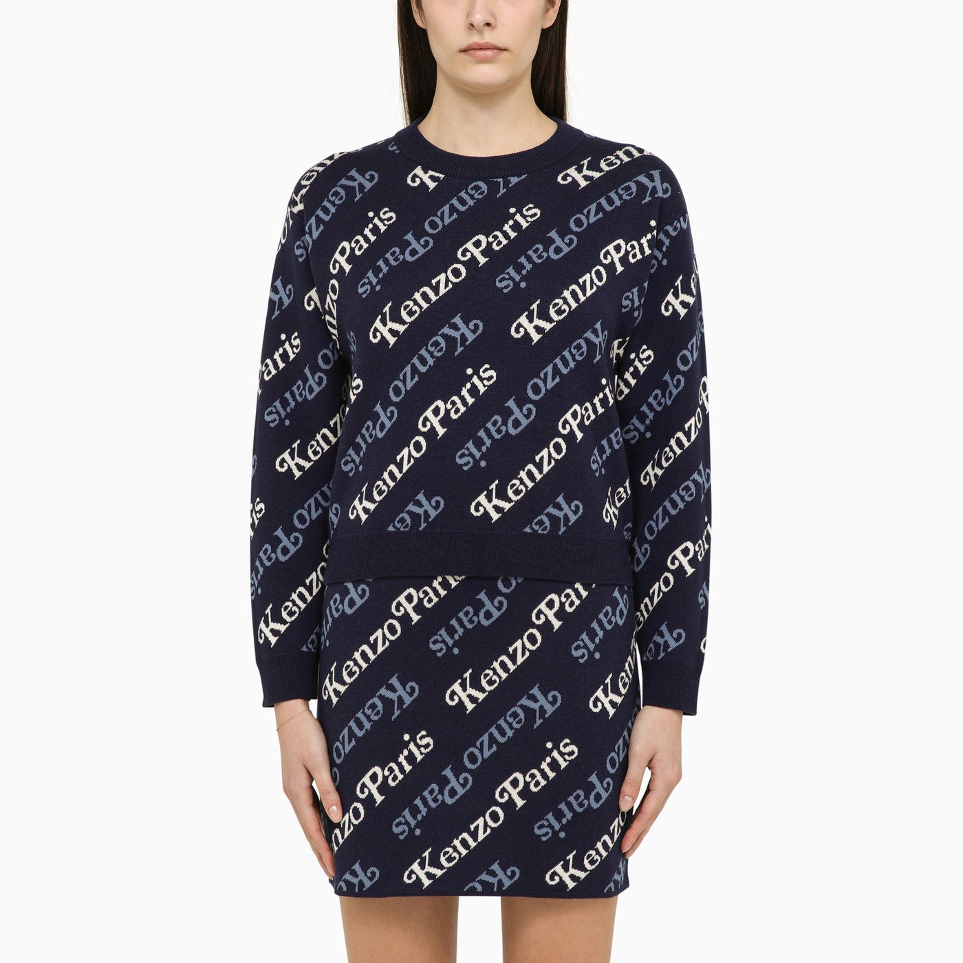Midnight blue wool and cotton crew-neck sweater from Kenzo featuring an all over contrasting lettering logo, long sleeves, a straight hem and ribbed hems.