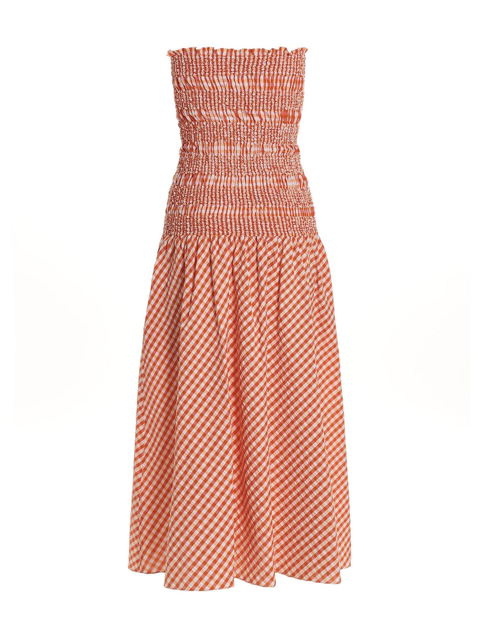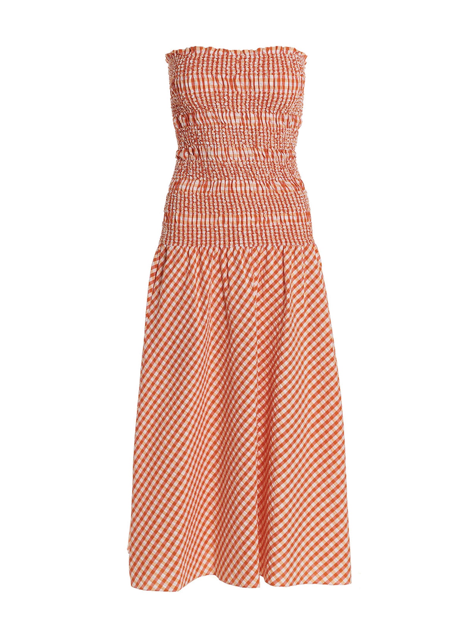 All over vichy cotton print dress featuring an off-the-shoulder style with a smock stitch top and pockets.