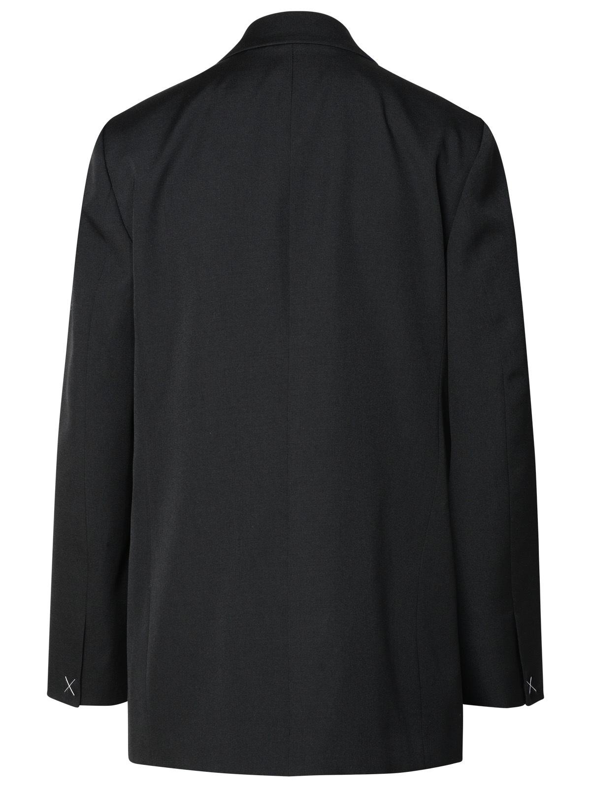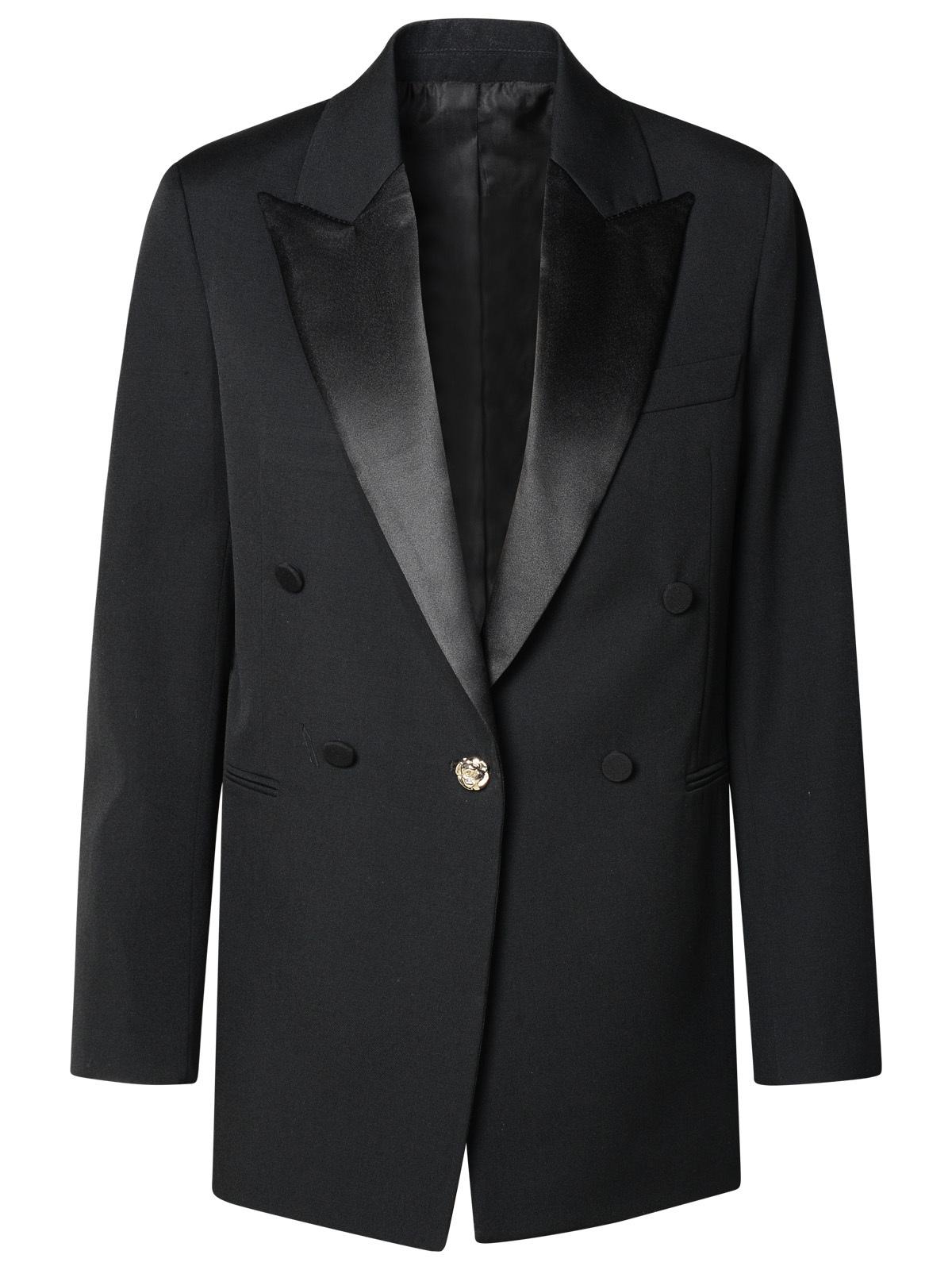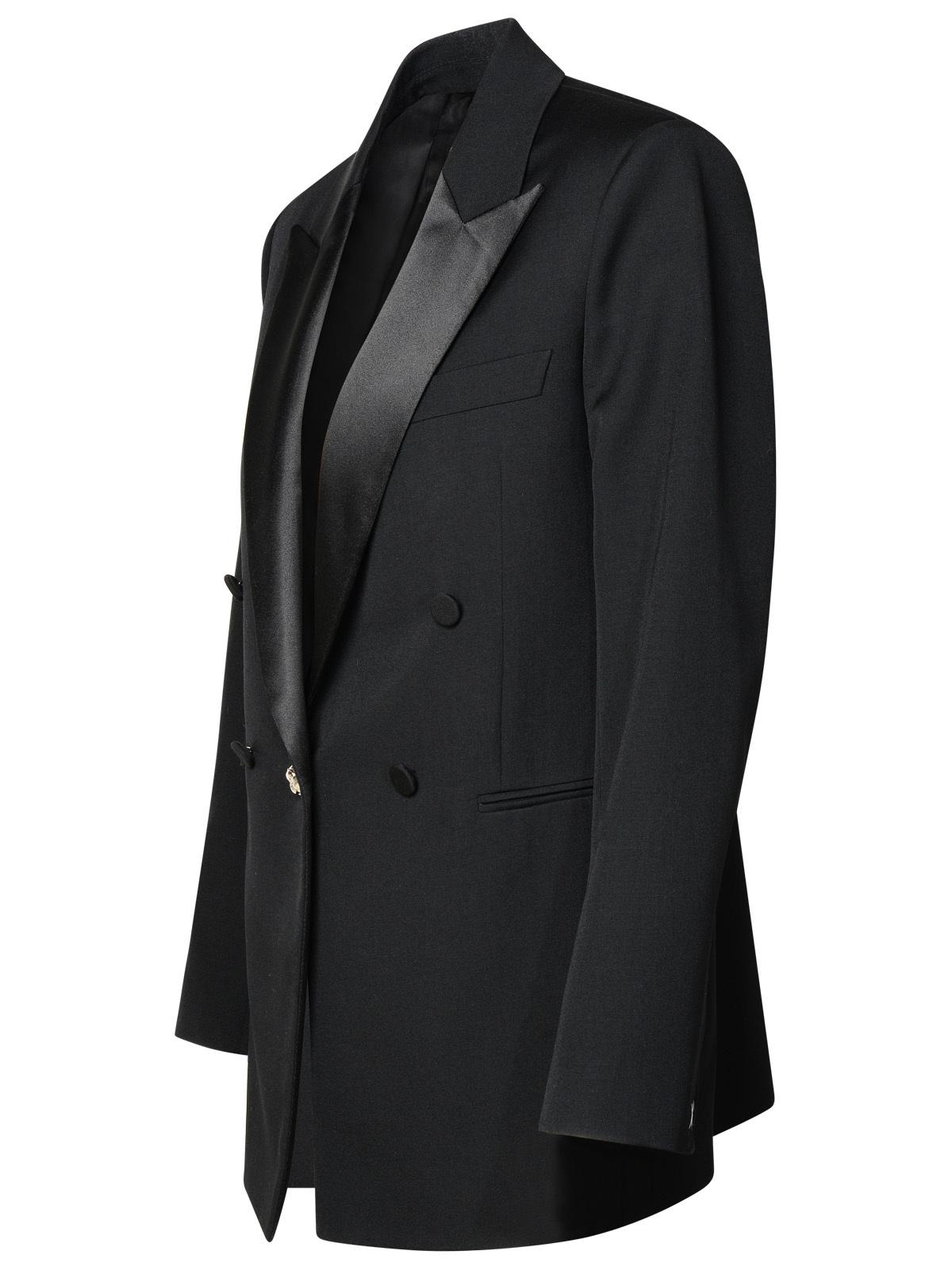 Double-breasted braided wool blazer with satin lapel collar, chest welt pocket, covered buttons, side welt pockets, inner welt pockets