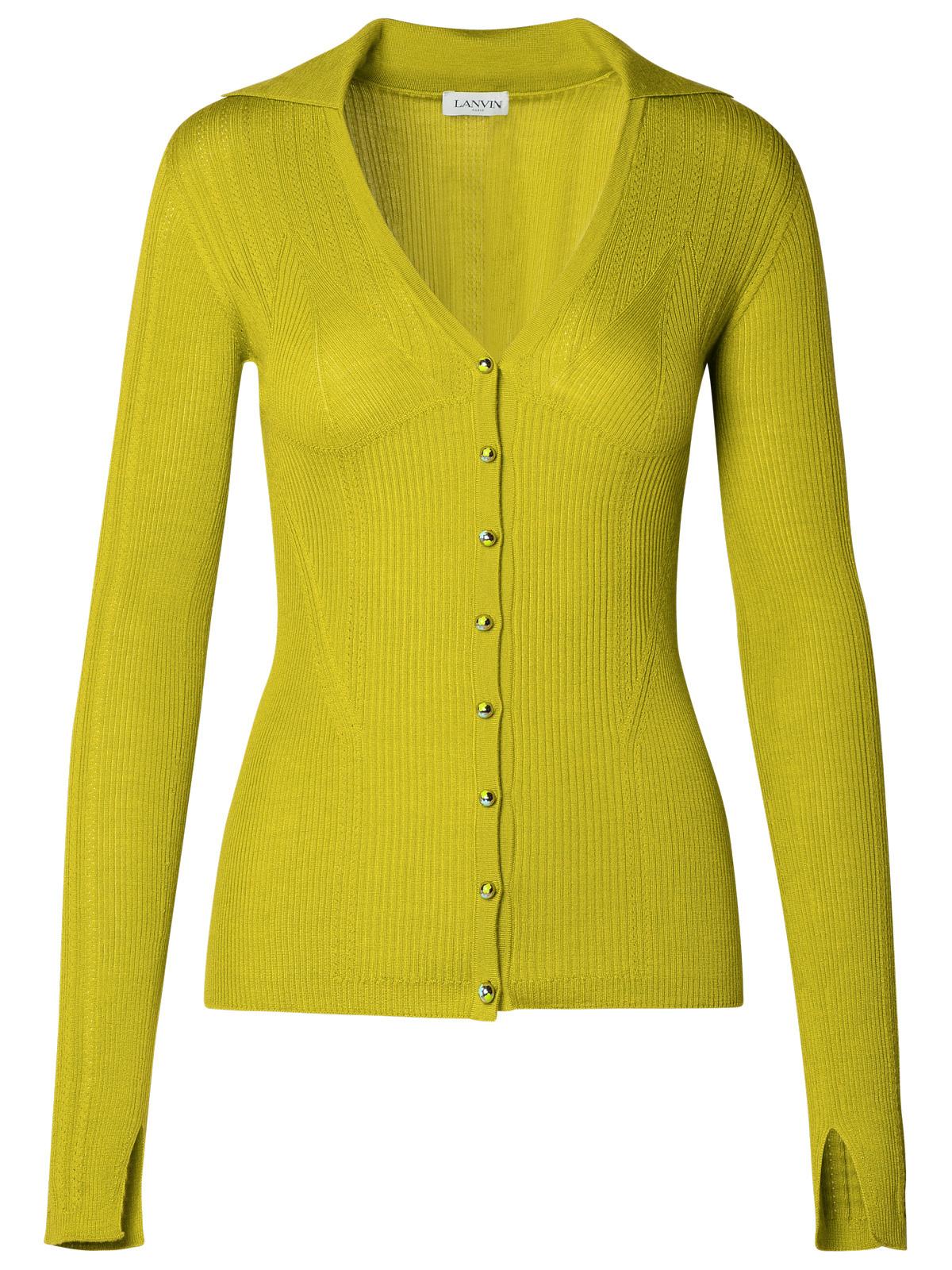 Cashmere and silk knit blend, ribbed neck, V-neck, front button closure.
