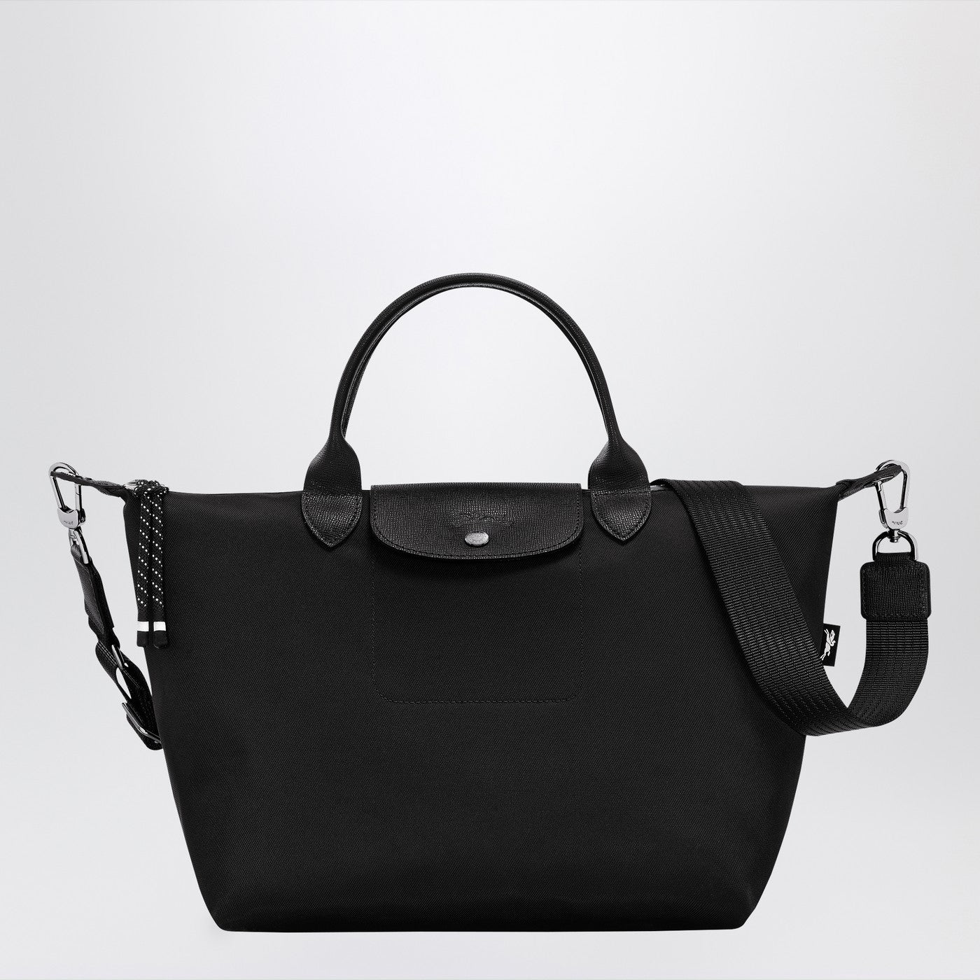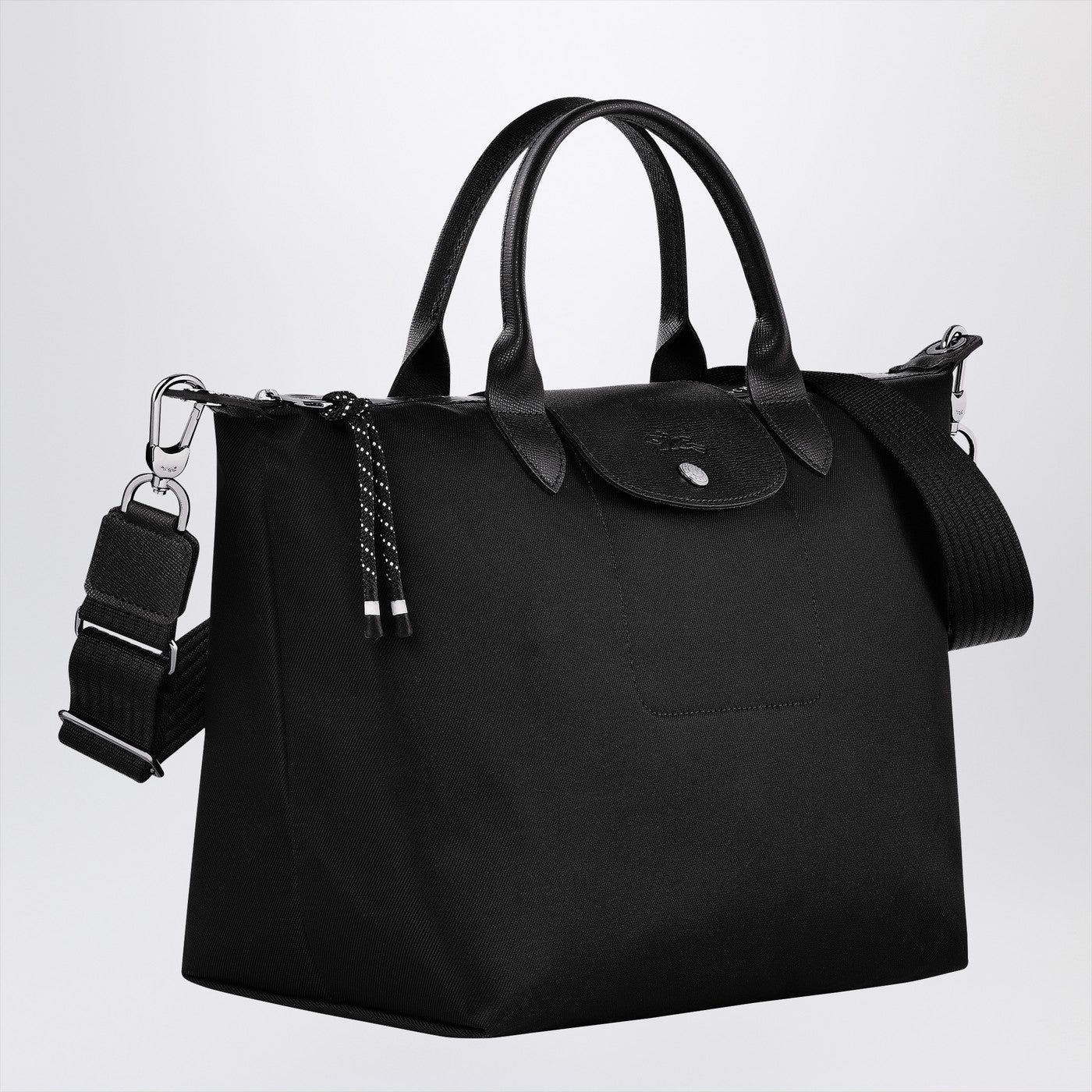 Large black recycled polyamide canvas bag by Longchamp with two top handles, adjustable and removable shoulder strap, book closure with magnet, zip fastening, two interior flat pockets and a main compartment.