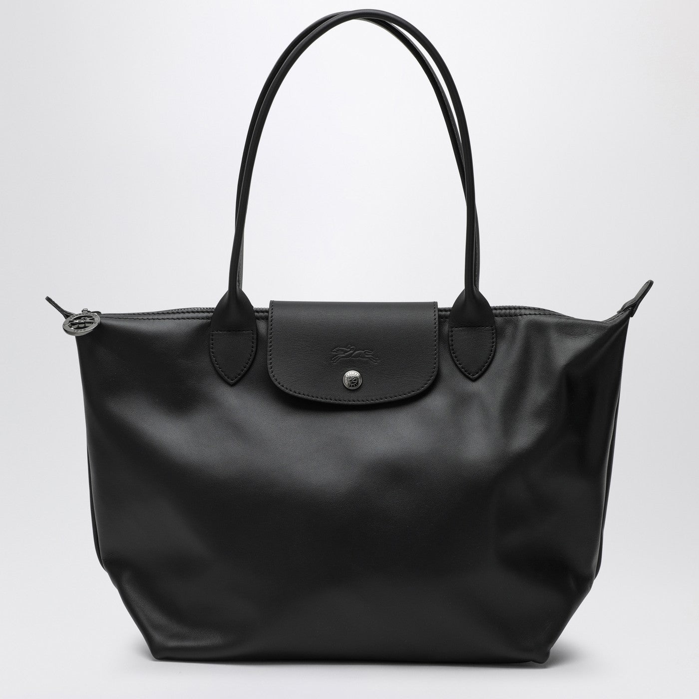 Black leather Longchamp medium-sized shopping bag, featuring two top handles, a book closure with magnetic button and zip, two interior flat pockets, one of which is zipped, and an embossed logo on the front.
