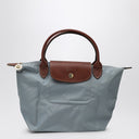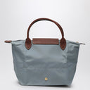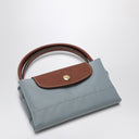 Small handbag by Longchamp in Steel-coloured econyl recycled polyamide canvas with brown leather details, featuring two top handle, foldover top with magnetic closure, zipper closure and main compartment.