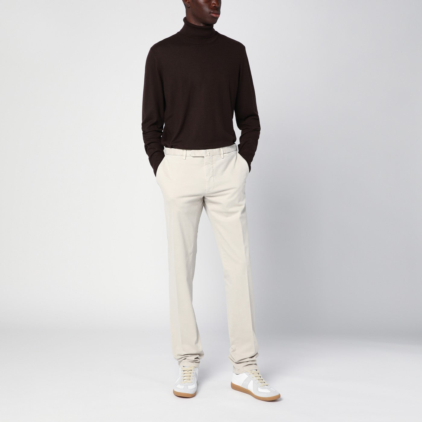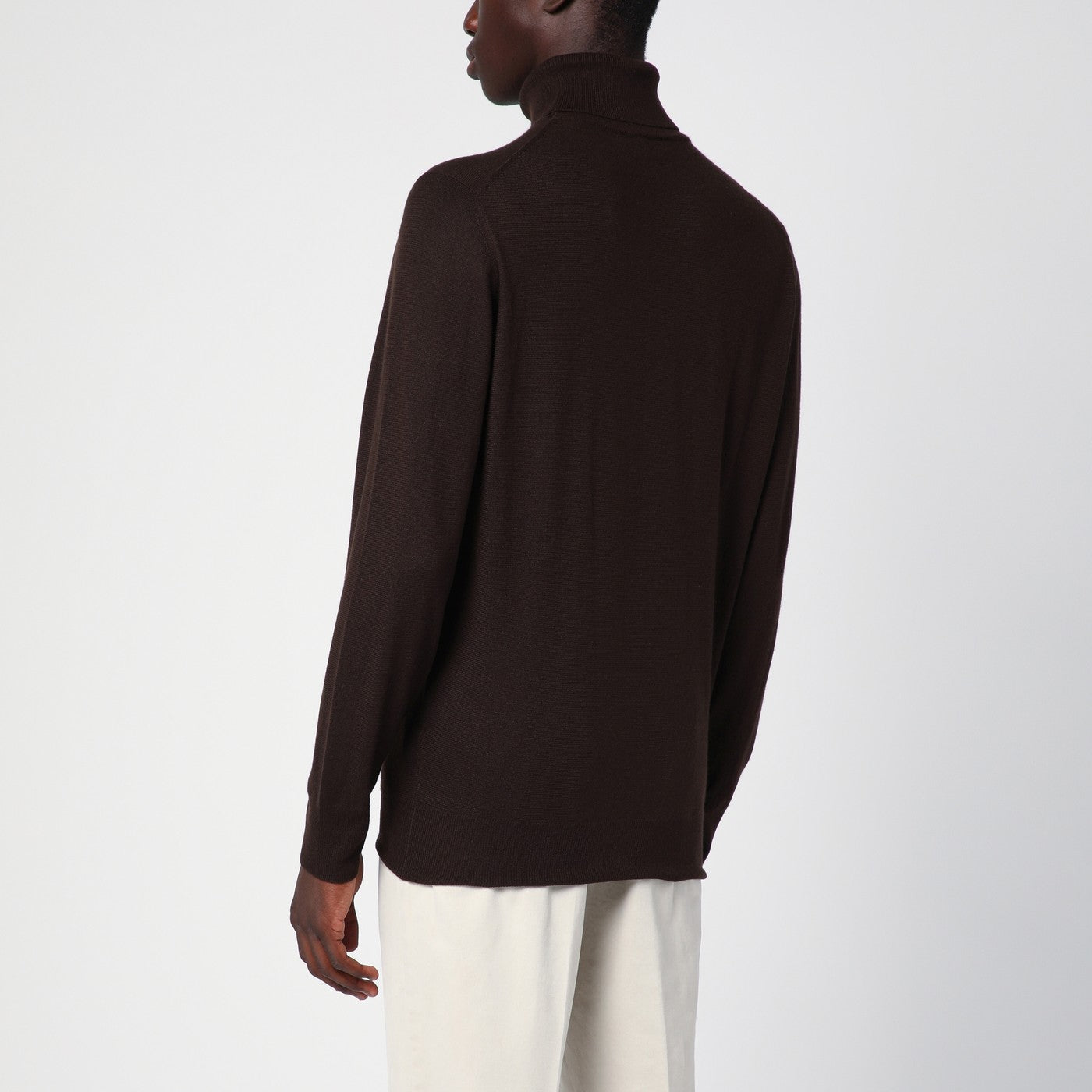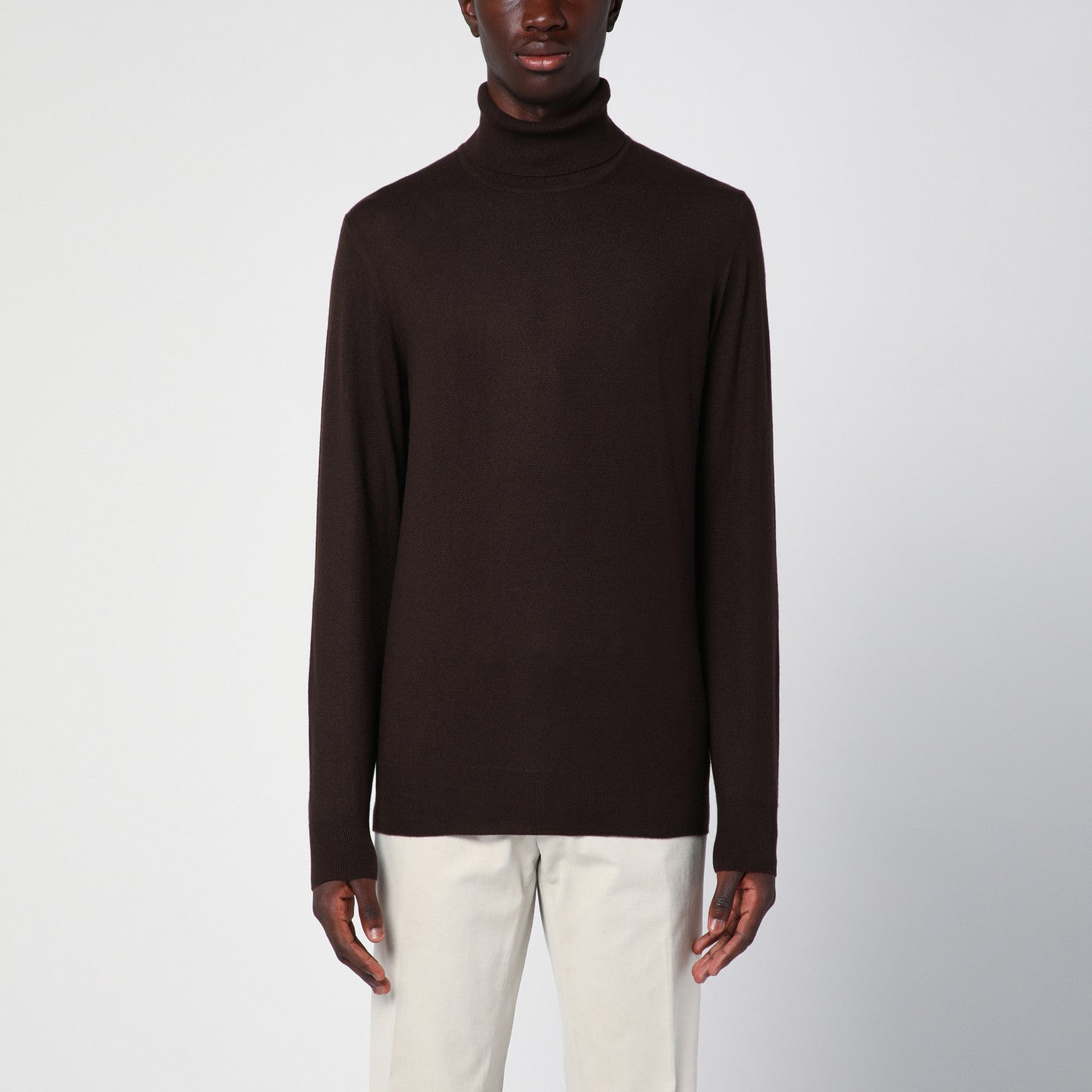 Brown cashmere sweater from Loro Piana featuring a high collar, long sleeves, ribbed hems and a straight hem.