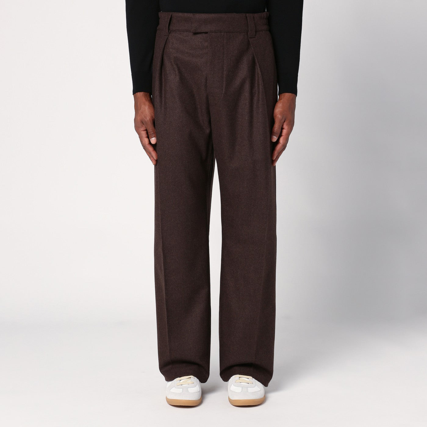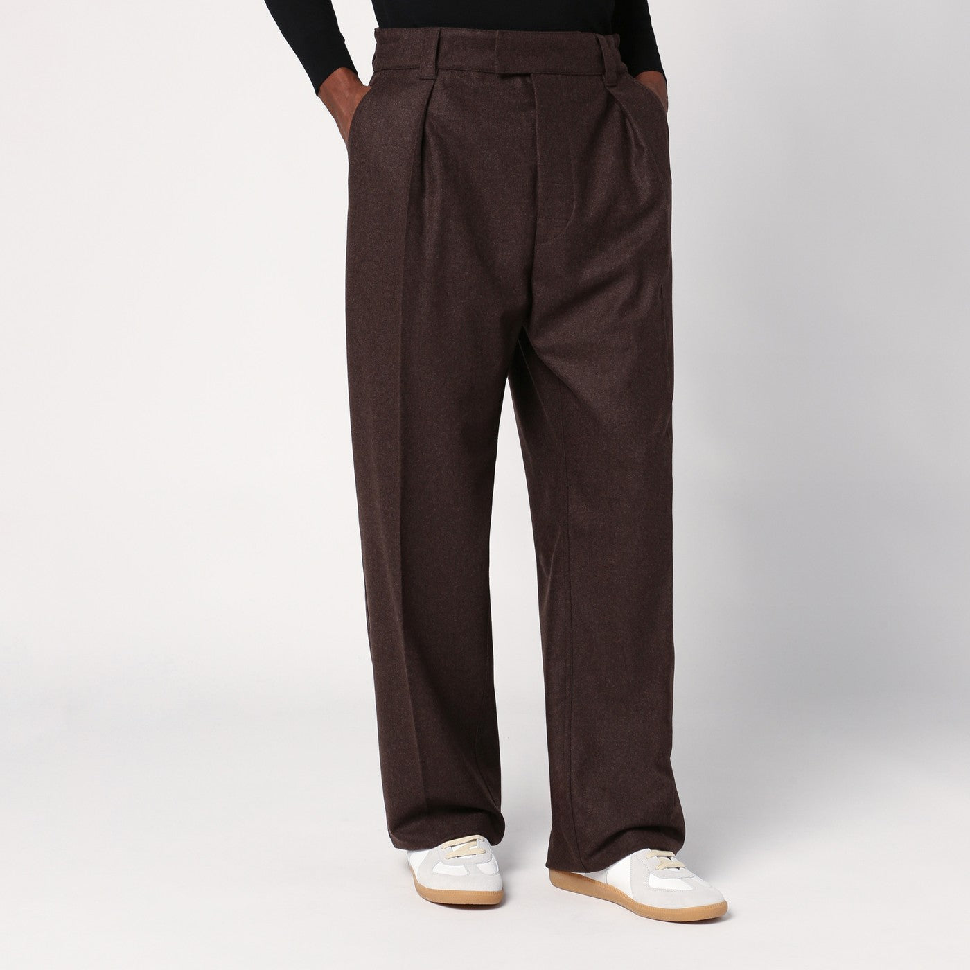 Brown virgin wool and cashmere trousers from Loro Piana featuring an elasticated waistband with belt loops, a front zip and hook-and-eye fastening, two side welt pockets, two back welt pockets and front darts.