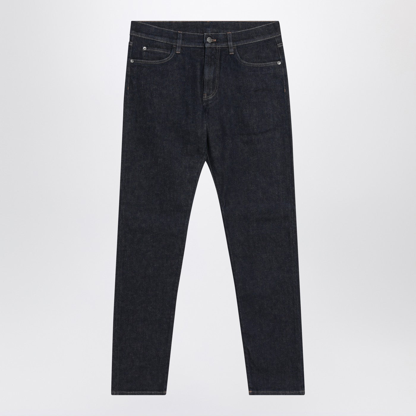 Loro Piana jeans in dark blue cotton denim, featuring a front zip and button closure, belt loops, five classic pockets, visible stitching, and a back logo patch.