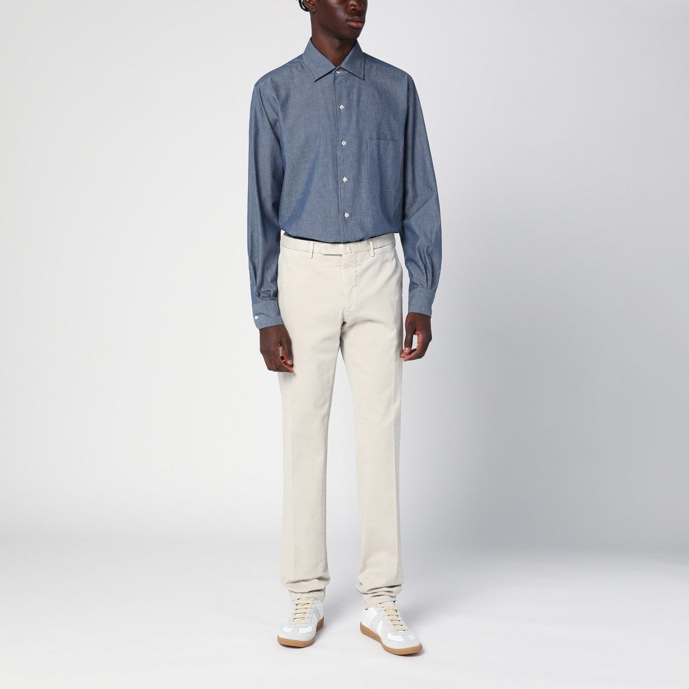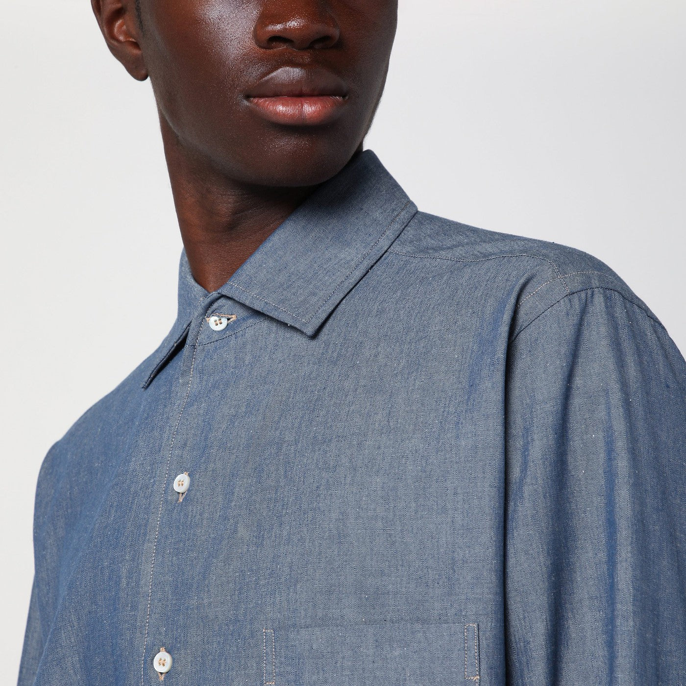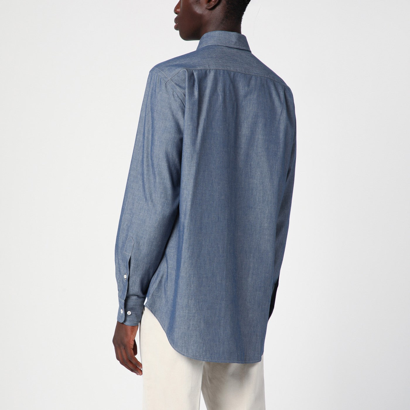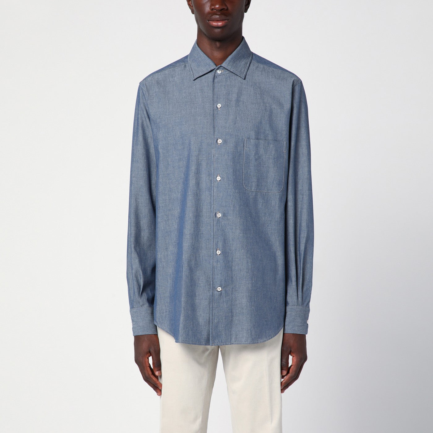 Light blue mélange cotton and cashmere blend shirt from Loro Piana featuring a classic collar, a front button placket, long sleeves with buttoned cuffs, a patch pocket on the chest and a curved hem.