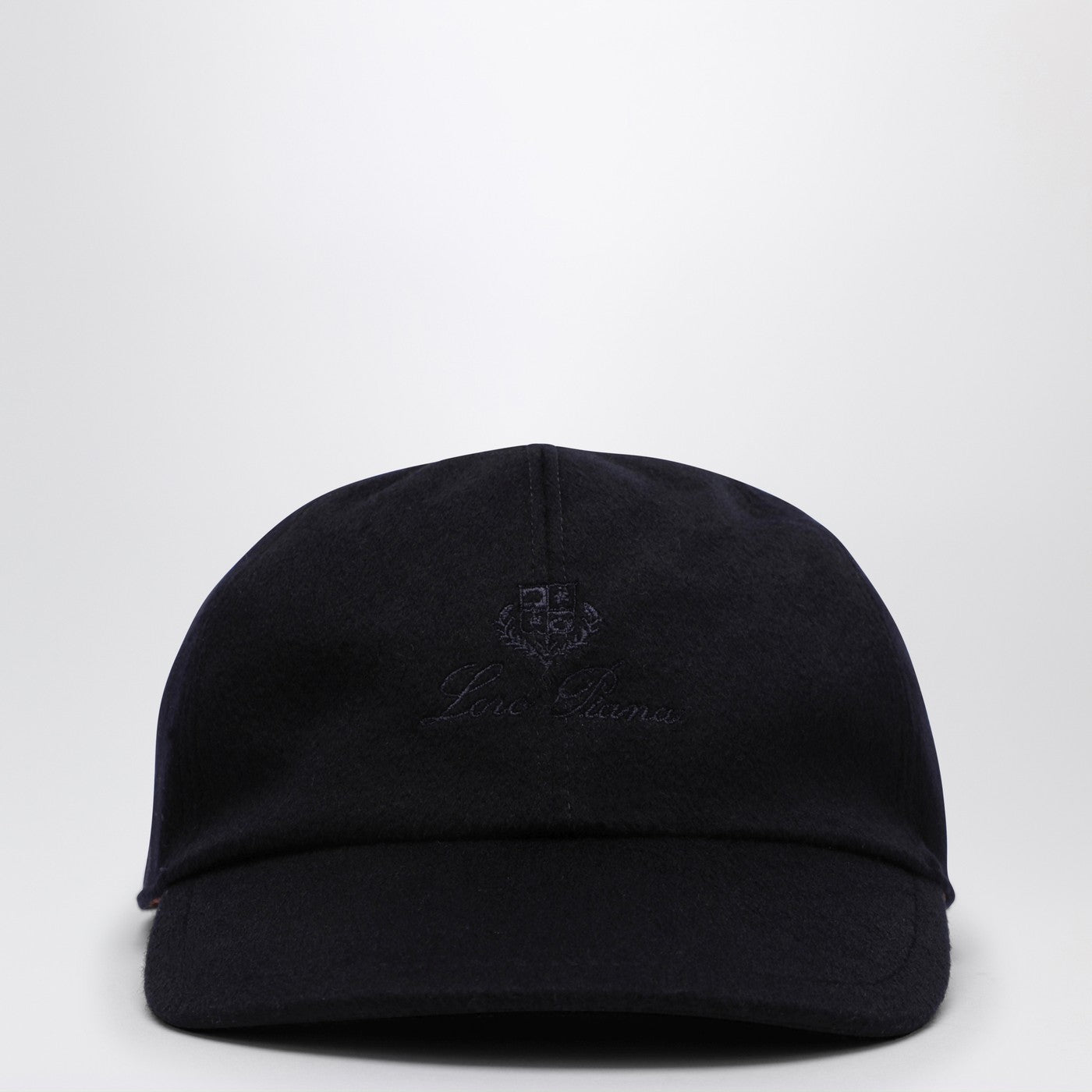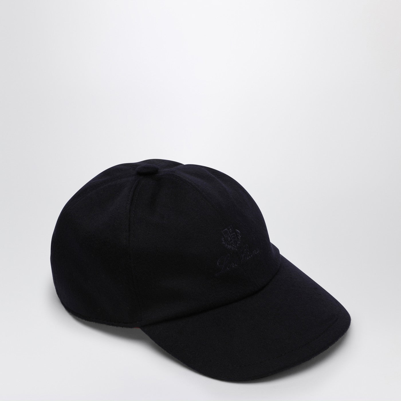 Navy blue cashmere cap with visor by Loro Piana, featuring tone-on-tone front logo embroidery and elastic back.