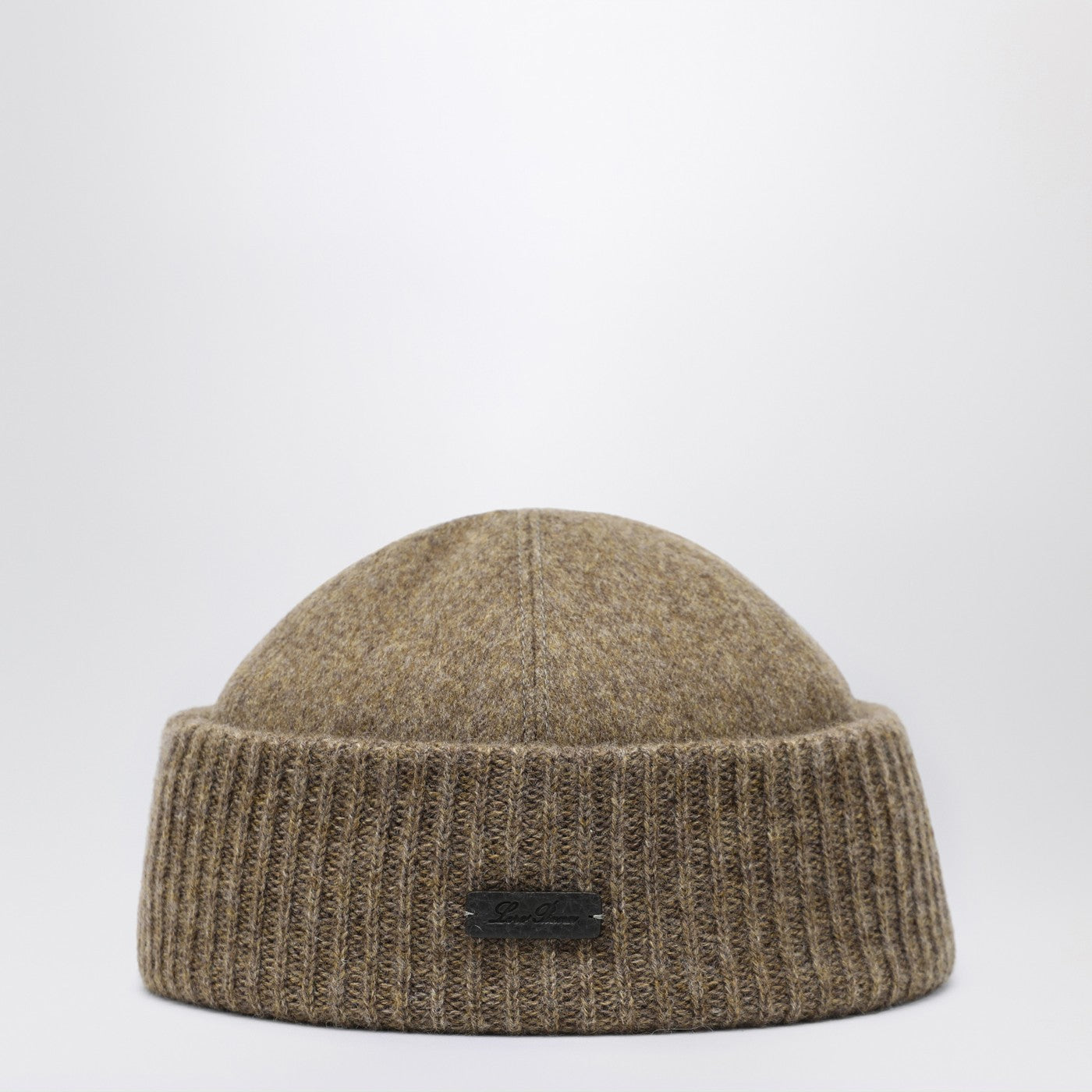 Loro Piana cashmere hat in Tundra Mélange colour, featuring a ribbed cuff design, cotton blend lining, and a small leather patch with embossed logo lettering.
