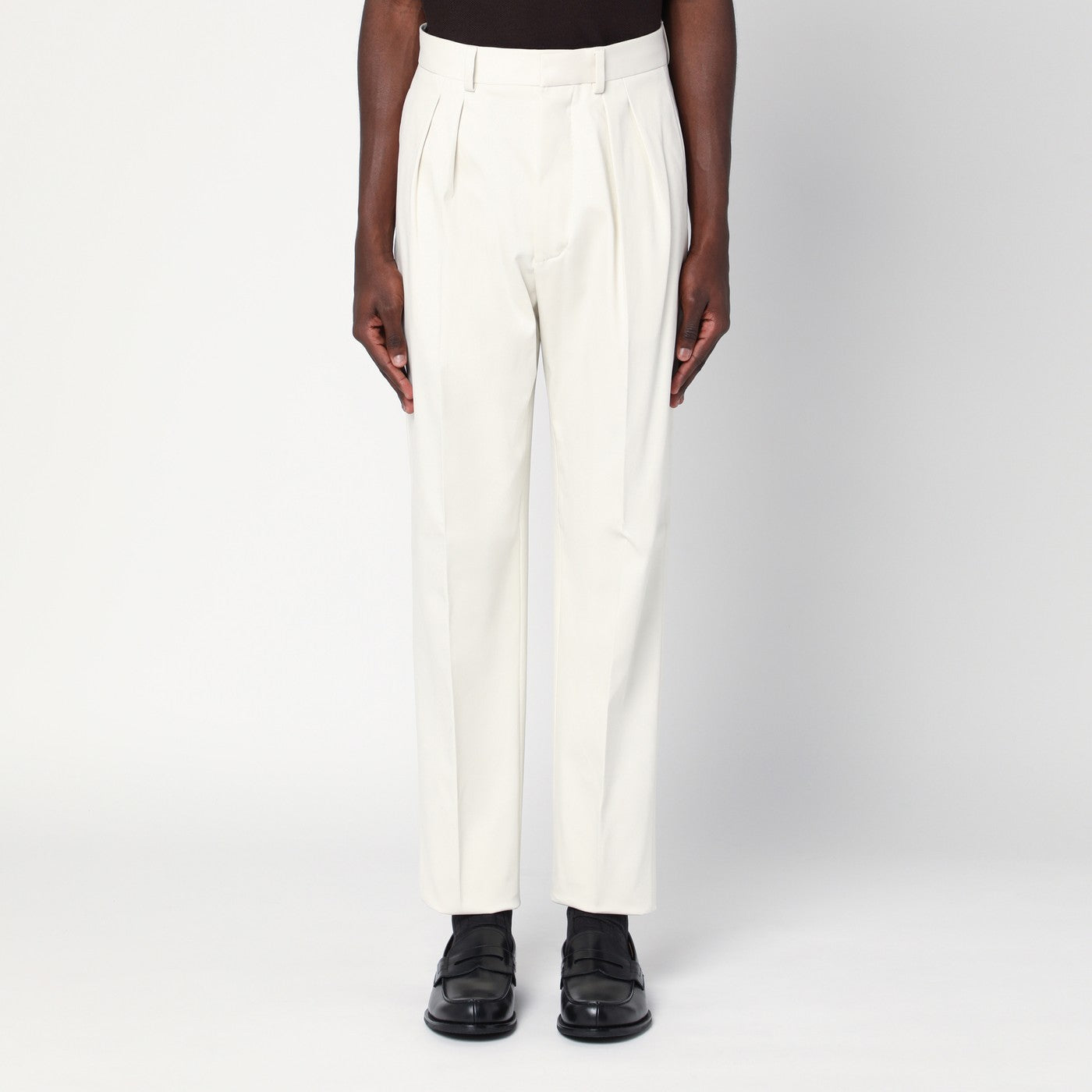 Loro Piana white cotton trousers, characterized by a front zip closure and hook, belt loops, front pleats, two side welt pockets, and two back welt pockets with button.
