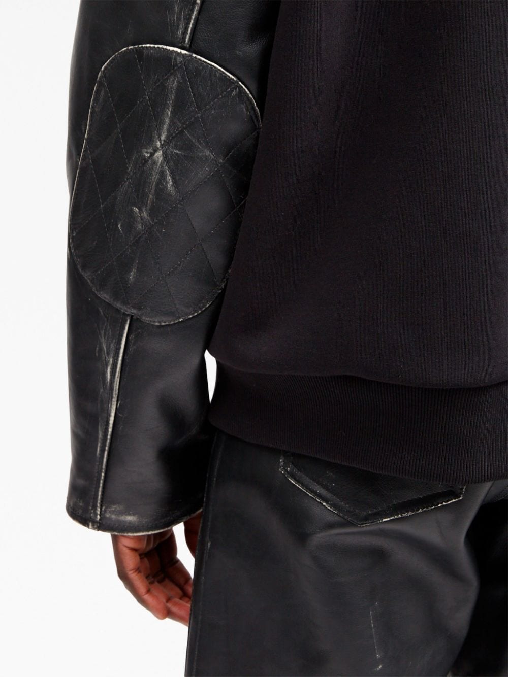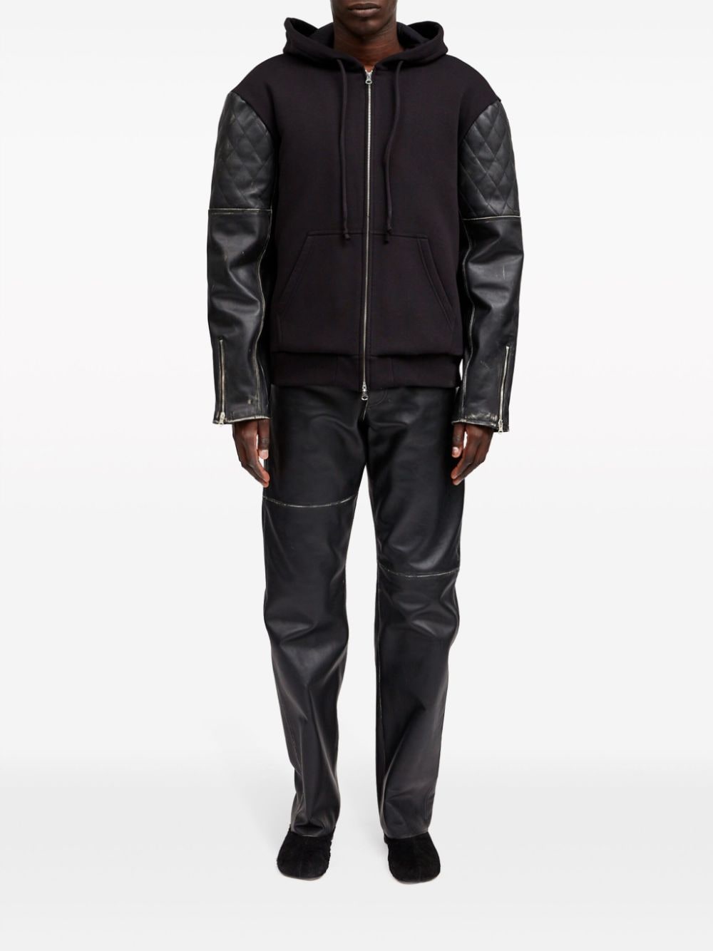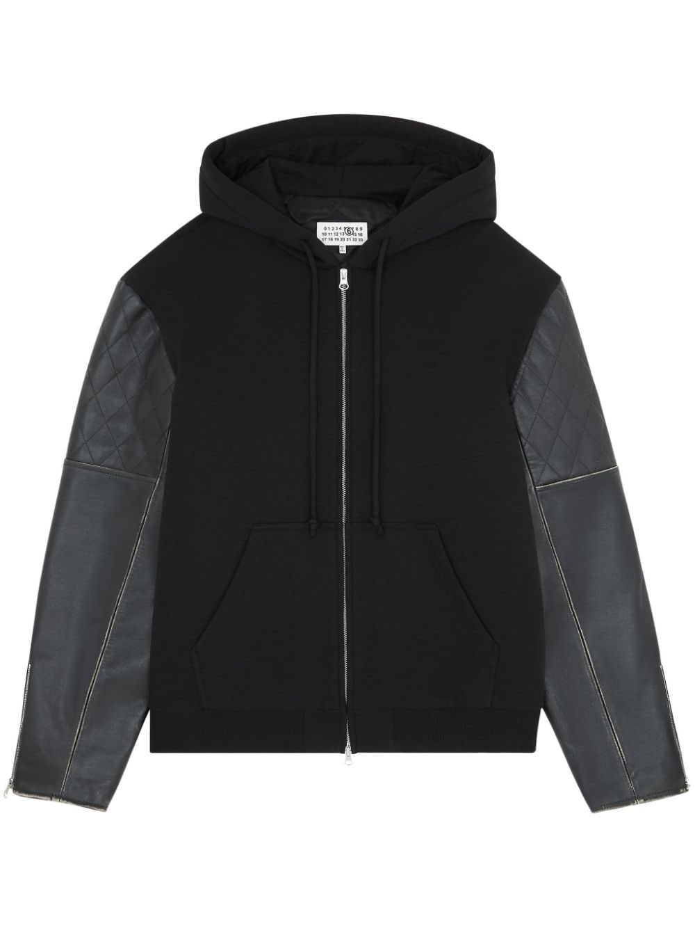 zip-up hooded jacket from MM6 Maison Margiela featuring black, cotton blend, front zip fastening, panelled design, decorative stitching, two front pouch pockets, drawstring hood, long sleeves and straight hem.