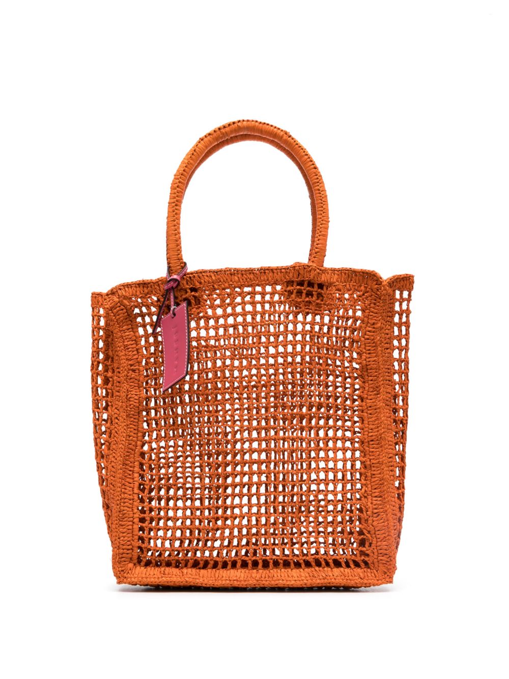 logo-tag raffia tote bag from MANEBI featuring carrot orange, raffia, woven raffia design, transparent design, logo tag, two rolled top handles and main compartment.