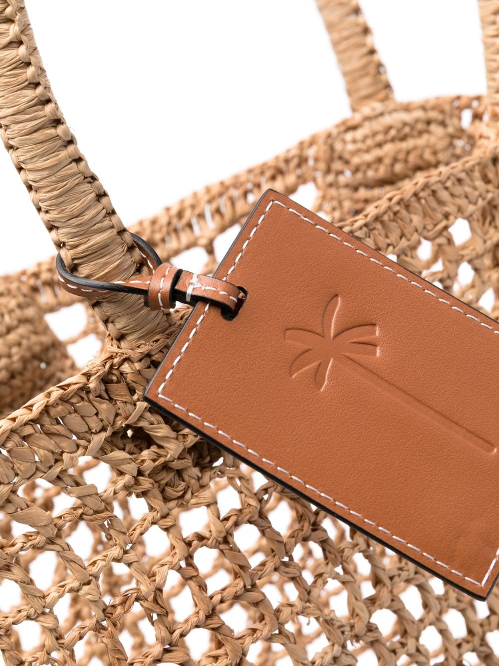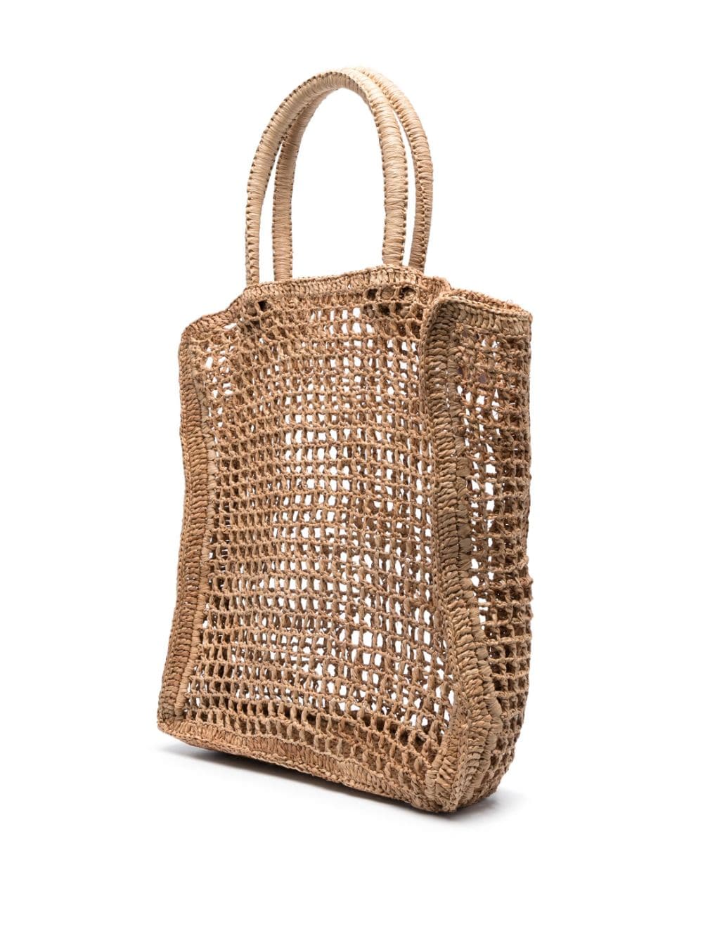 logo-tag raffia tote bag from MANEBI featuring beige, woven raffia design, transparent design, logo tag, two rolled top handles, rectangle shape and main compartment.