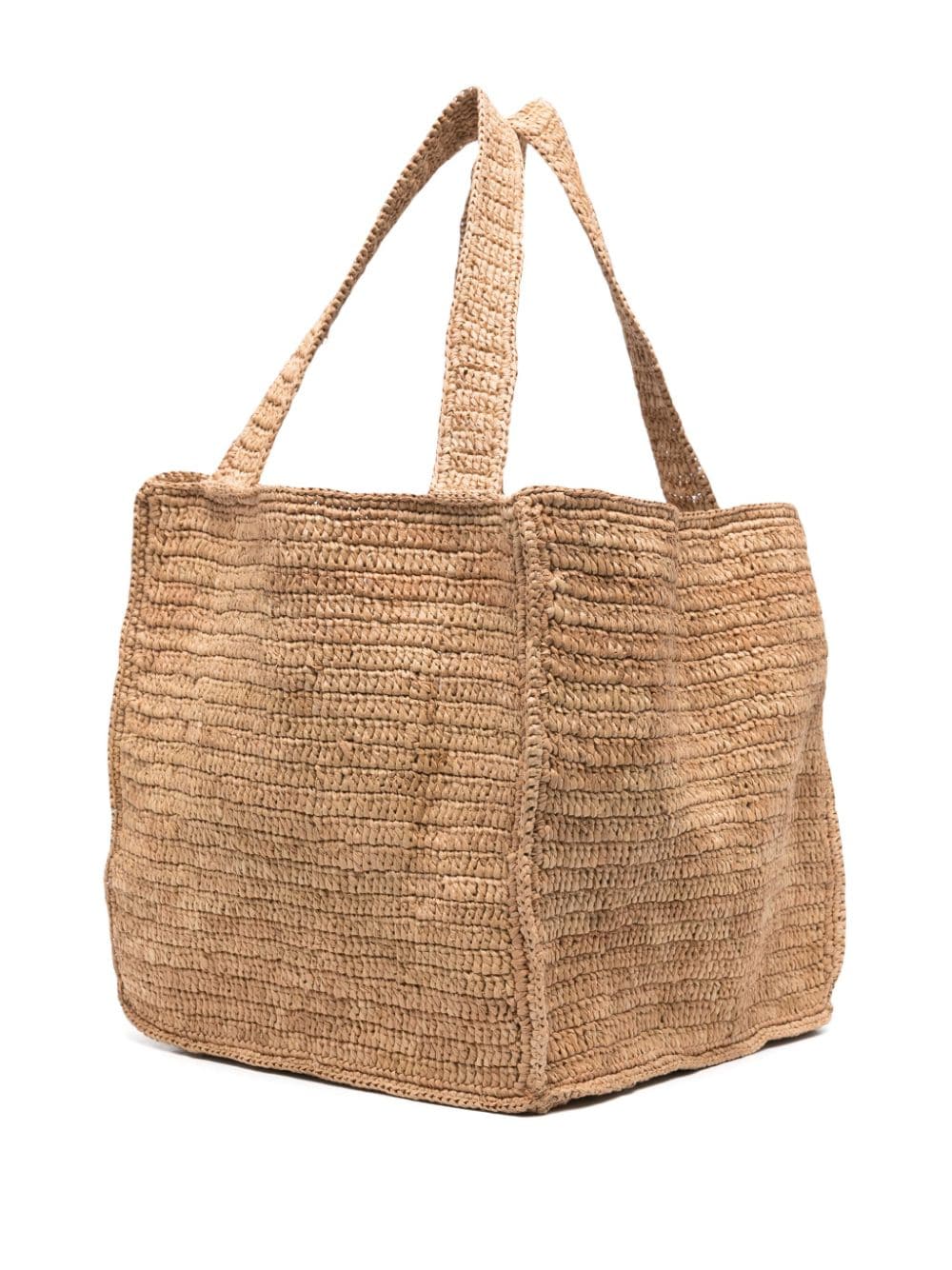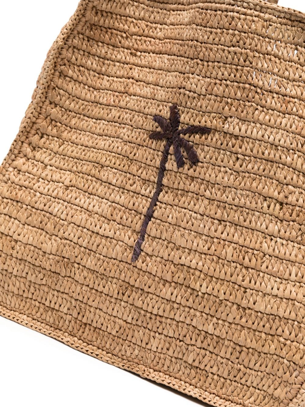 beige woven raffia design two flat top handles embroidered logo to the front main compartment internal patch pocket internal logo patch unlined open top