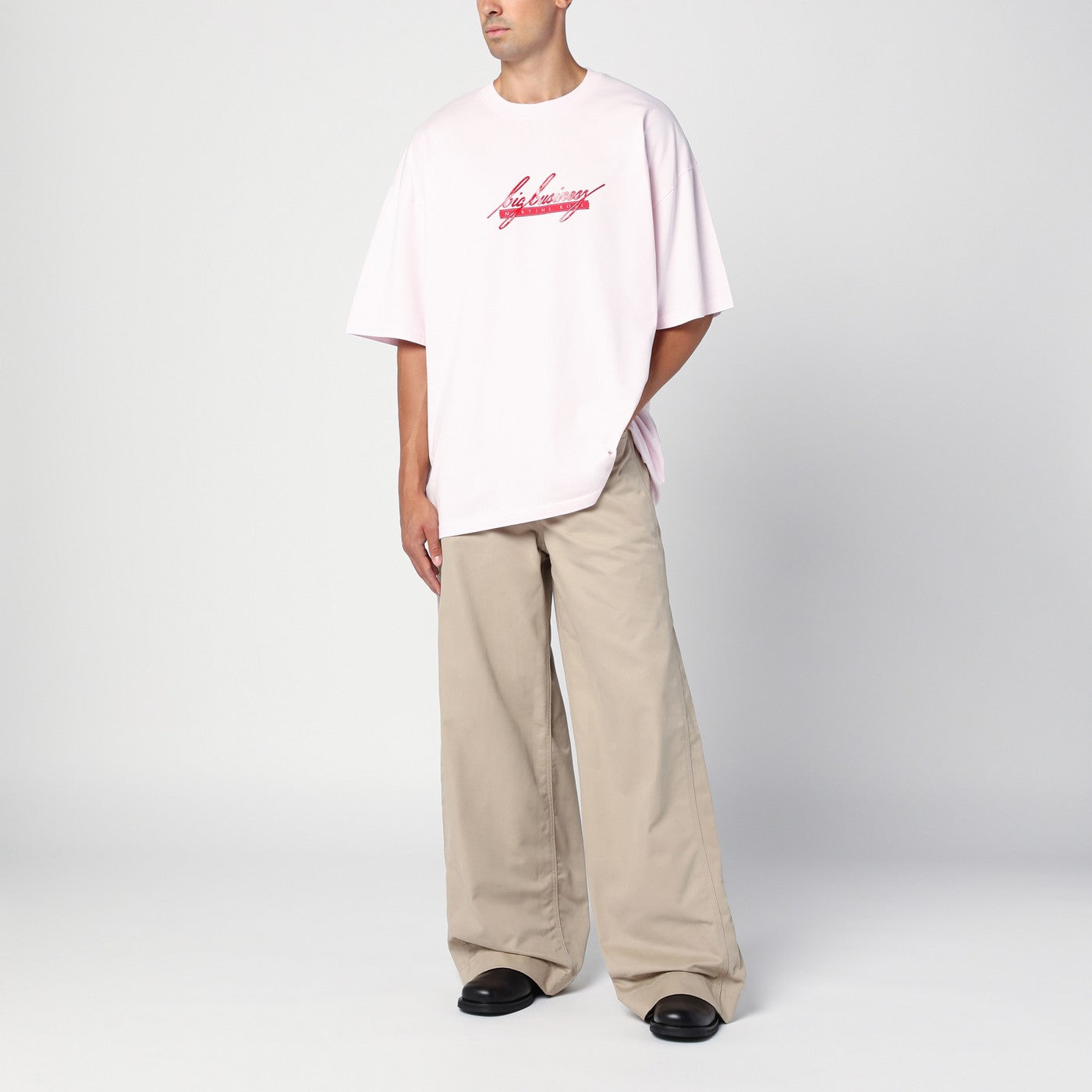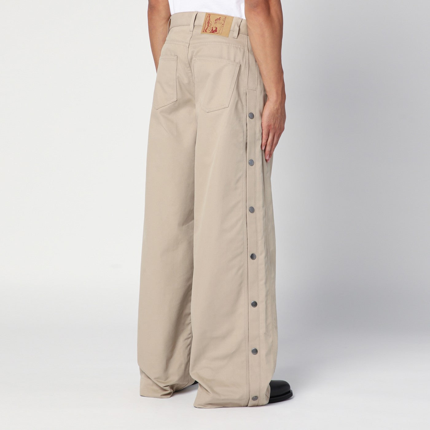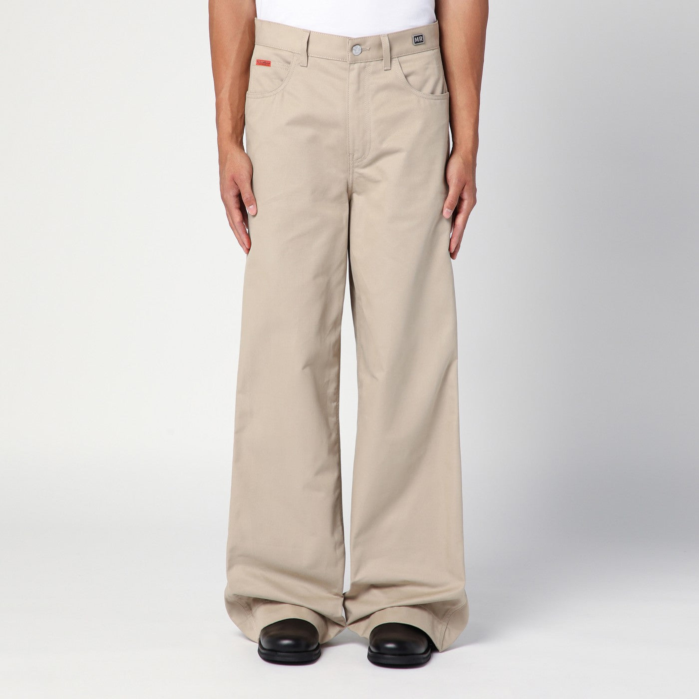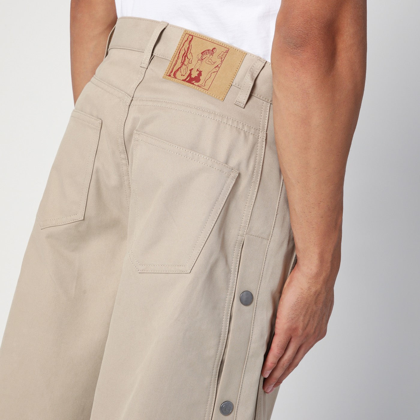 Beige cotton denim loose-fitting jeans by Martine Rose, feature five classic pockets, belt loops, side button band, back logo patch and small logo plaque on the front.