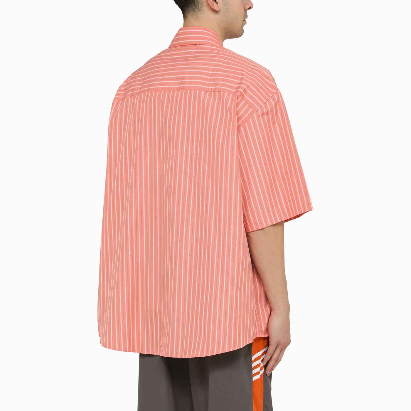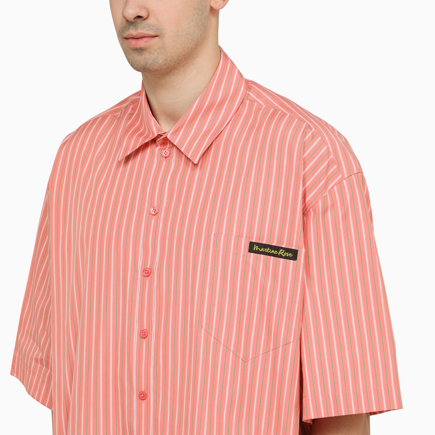 Pink and green striped cotton shirt by Martine Rose featuring a classic collar, front button placket, short sleeves, patch pocket on the chest with lettering logo plaque and logo patch on the bottom edge.