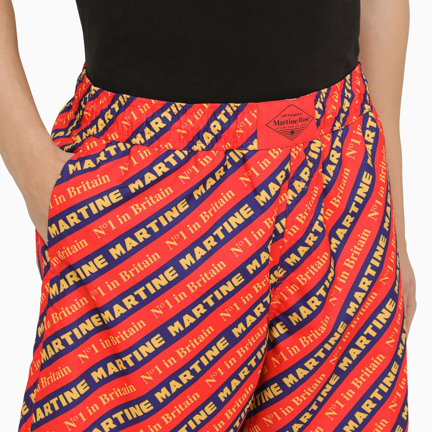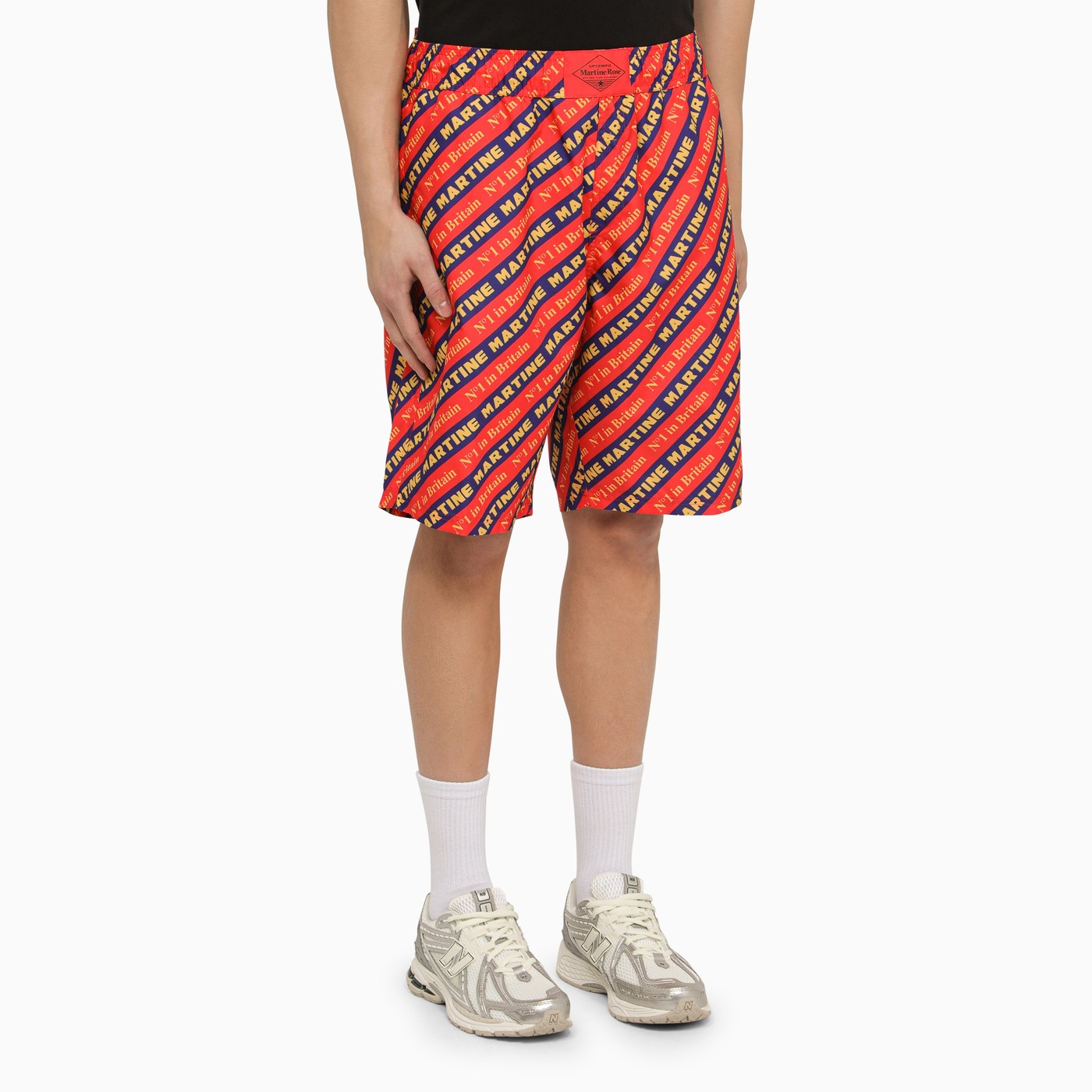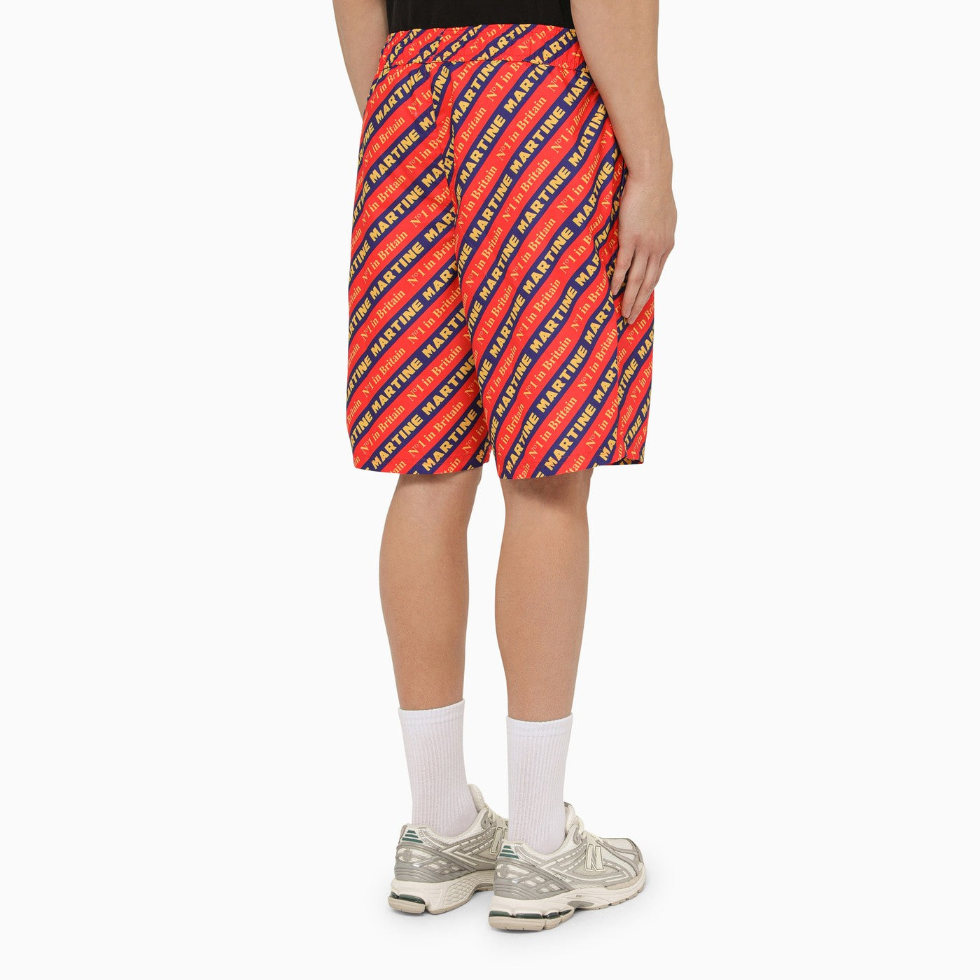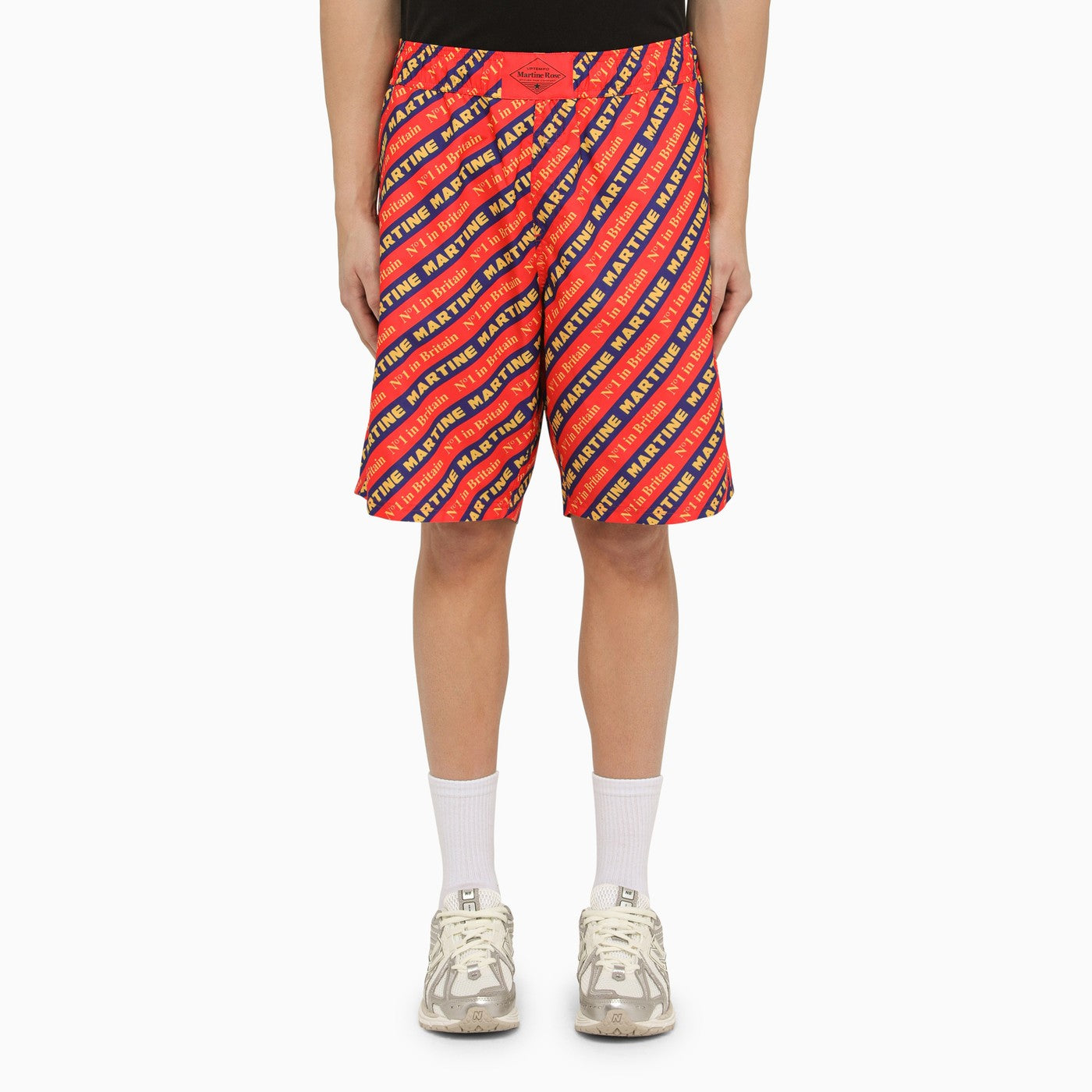 Red Bermuda shorts with all-over lettering logo print by Martine Rose, featuring an elasticated waistband with concealed drawstring, two side welt pockets and front logo patch.