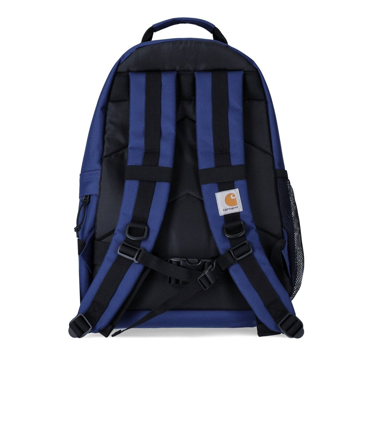 Carhartt Wip Kickflip backpack made of water-repellent recycled polyester canvas in shades of blue and black. It features a main compartment and an upper zip pocket, adjustable buckles, and elastic lace on the front. Side pockets, one with a zip and one in mesh, padded shoulder straps, and logo patch on the front. Measures 45x29x19 cm. Composition: 97% recycled polyester, 3% polyurethane.