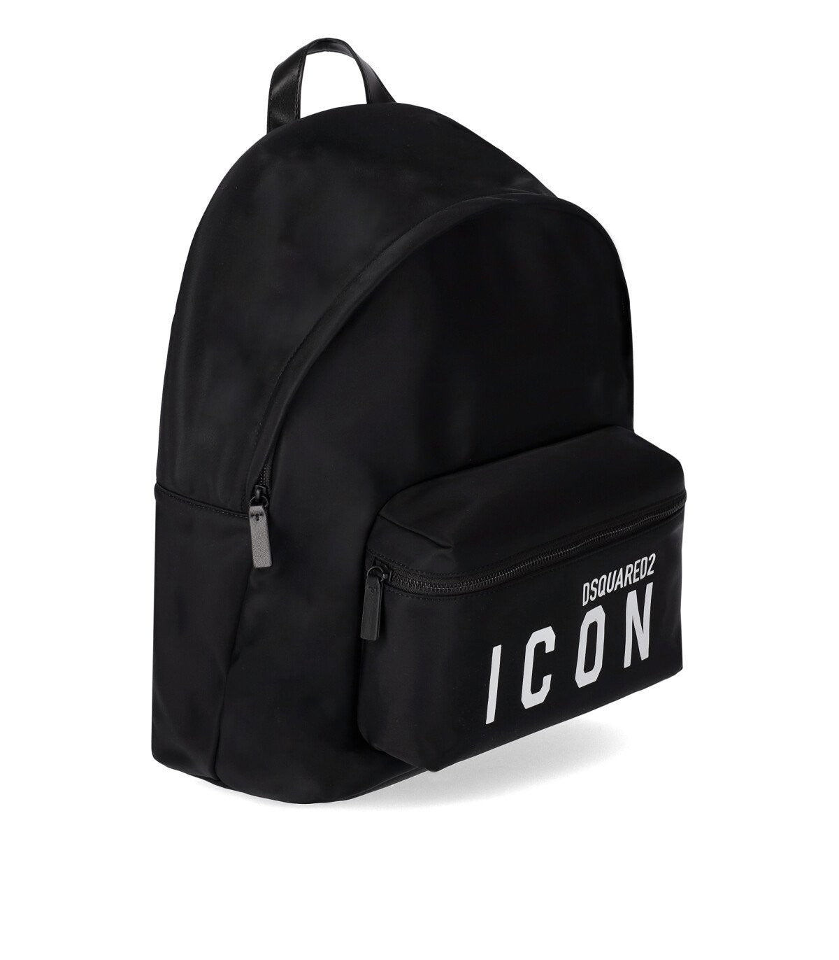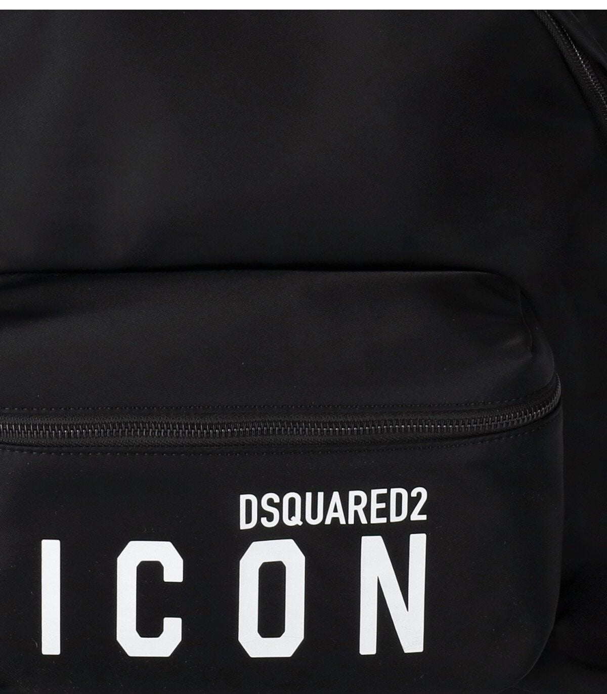 Be Icon backpack by Dsquared2 made of black nylon, featuring a large compartment with zip and slip pockets. Leather finishes, external pocket with contrasting printed logo. Padded, adjustable shoulder straps. Measures 45x34x26 cm. Composition: 100% polyester.