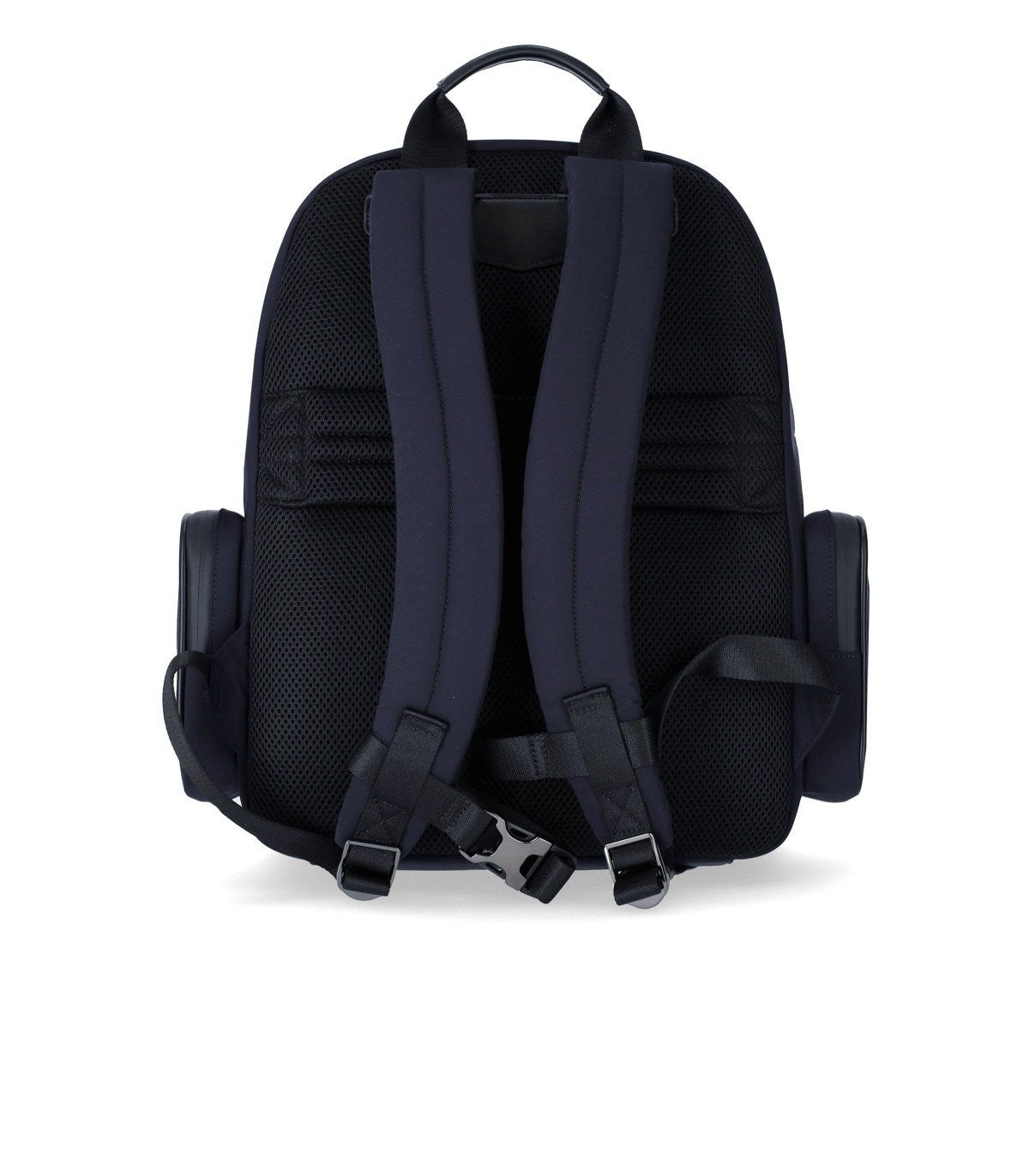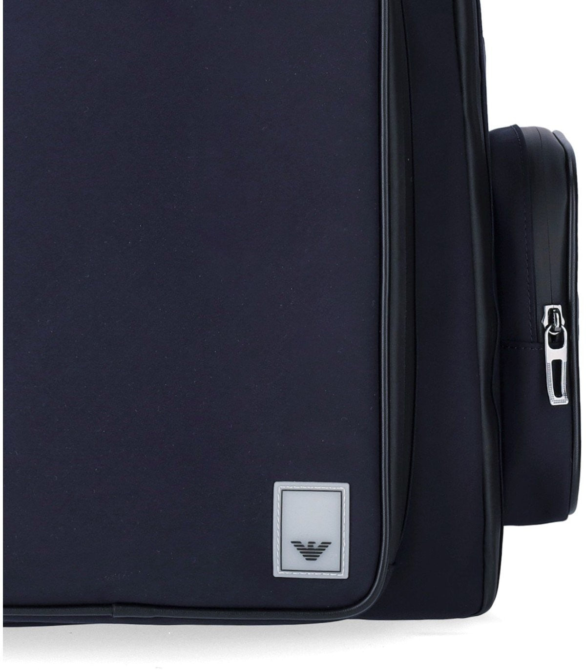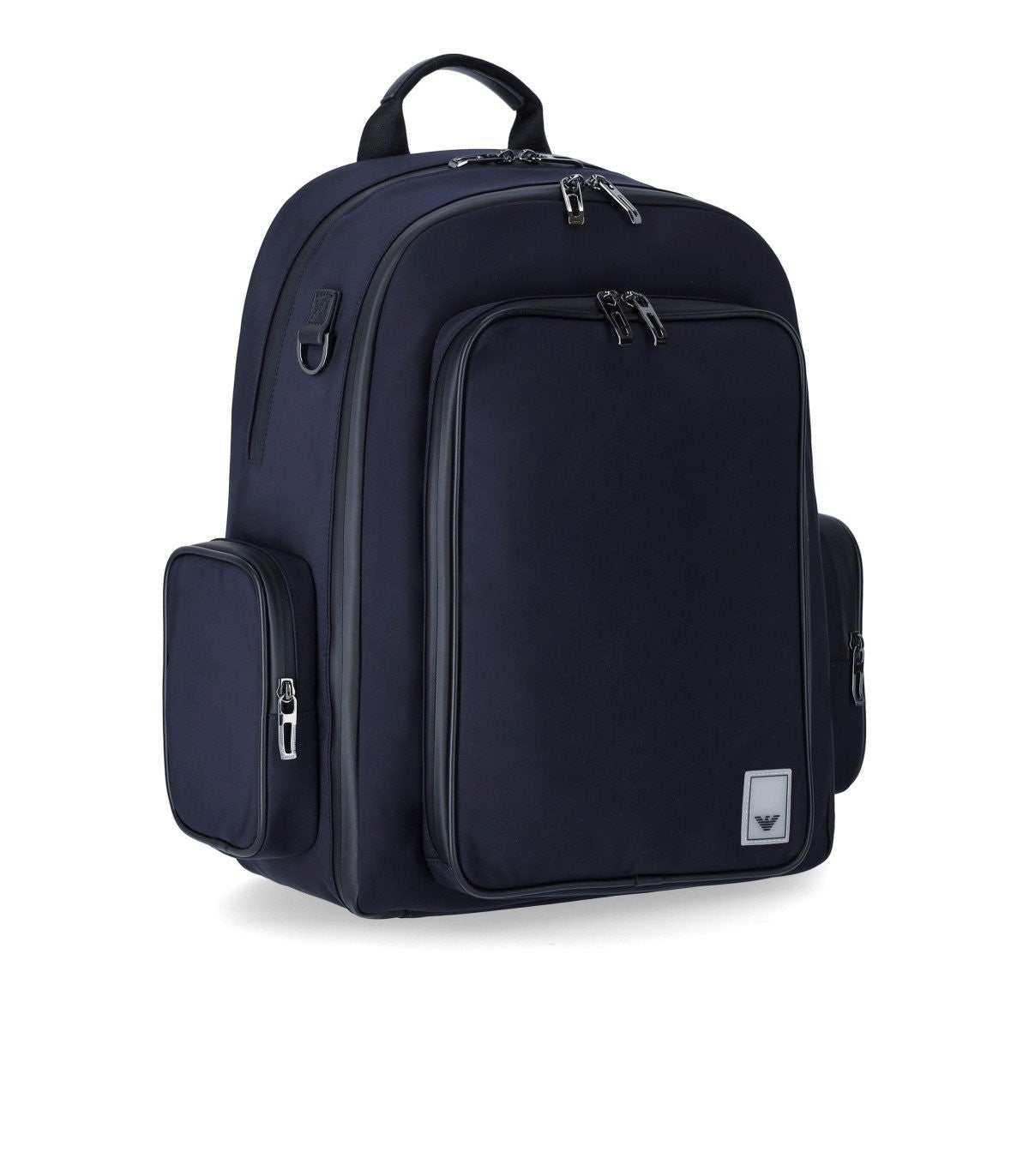 Emporio Armani backpack made of navy blue nylon, equipped with numerous thermo-sealed zip pockets and compartments for cards and a laptop. Rubber logo patch on the front, regenerated leather inserts, padded mesh back and adjustable shoulder straps. Measures 30x40x15 cm. Composition: 100% polyester.