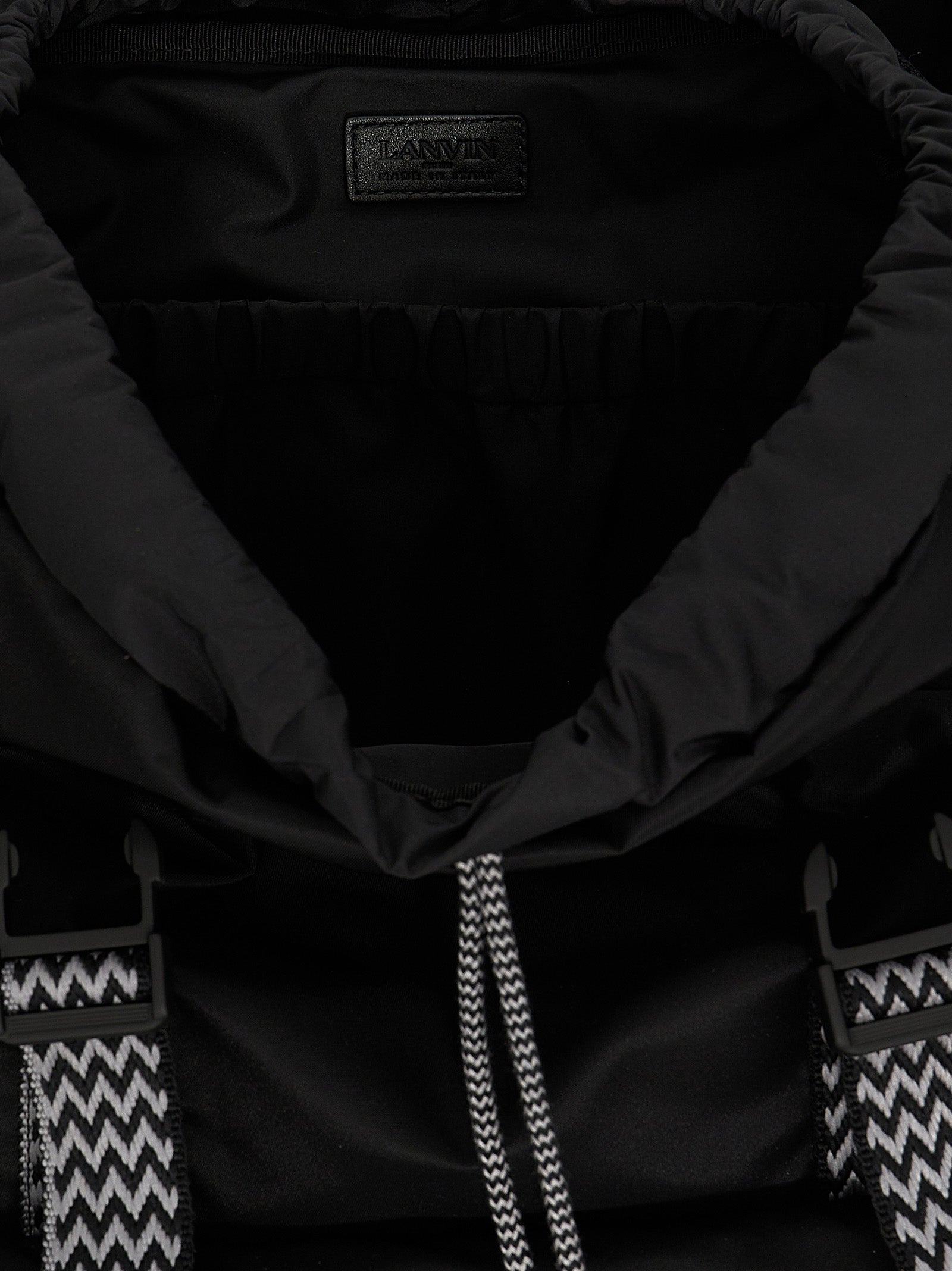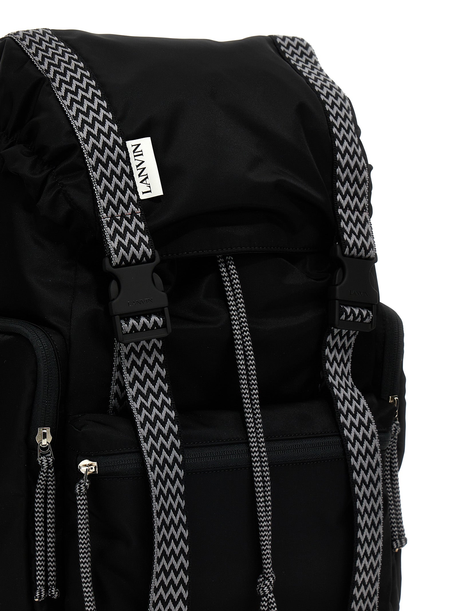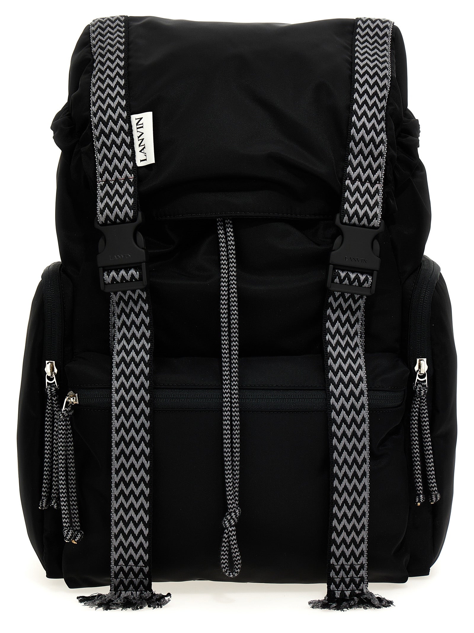 'Curb' ntlon backpack with buckle and inner drawstring closure, outer zip pockets, adjustable shoulder straps.