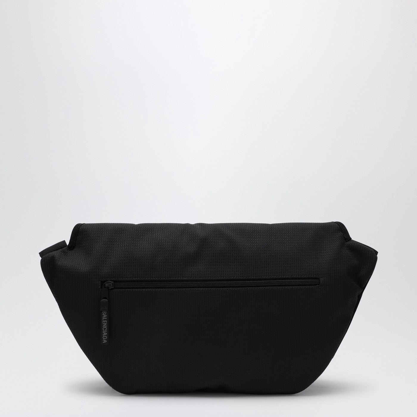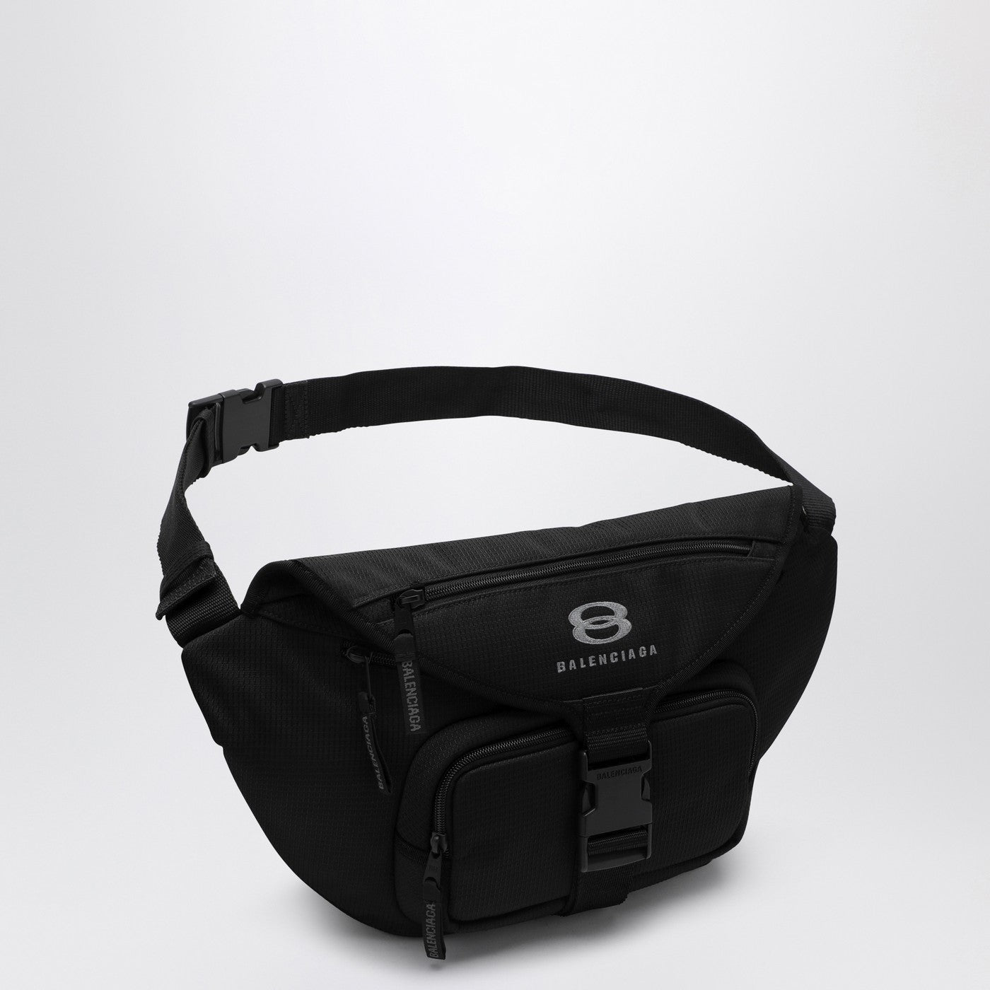 Black nylon-blend Balenciaga fanny pack featuring an adjustable buckle belt, unity sports icon motif with embroidered logo lettering on the front, buckle and flap fastening with one zipped pocket, one front and one rear zipped pocket and one main compartment.