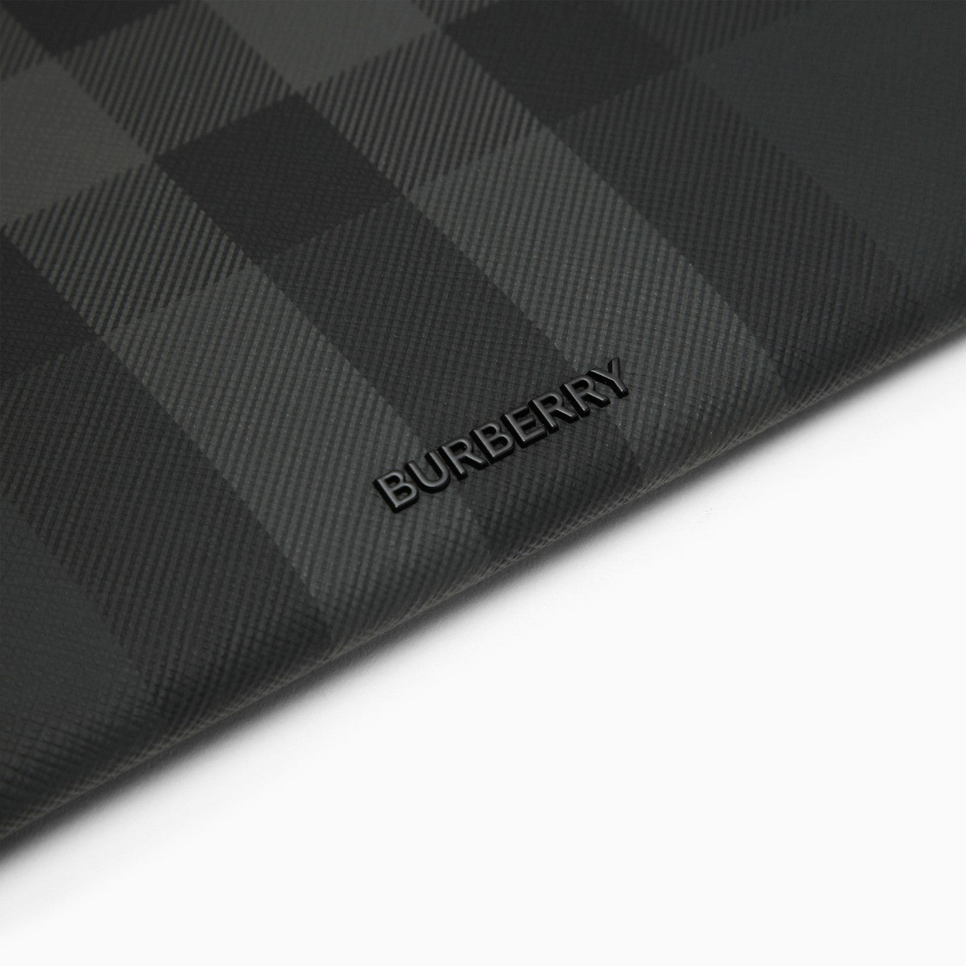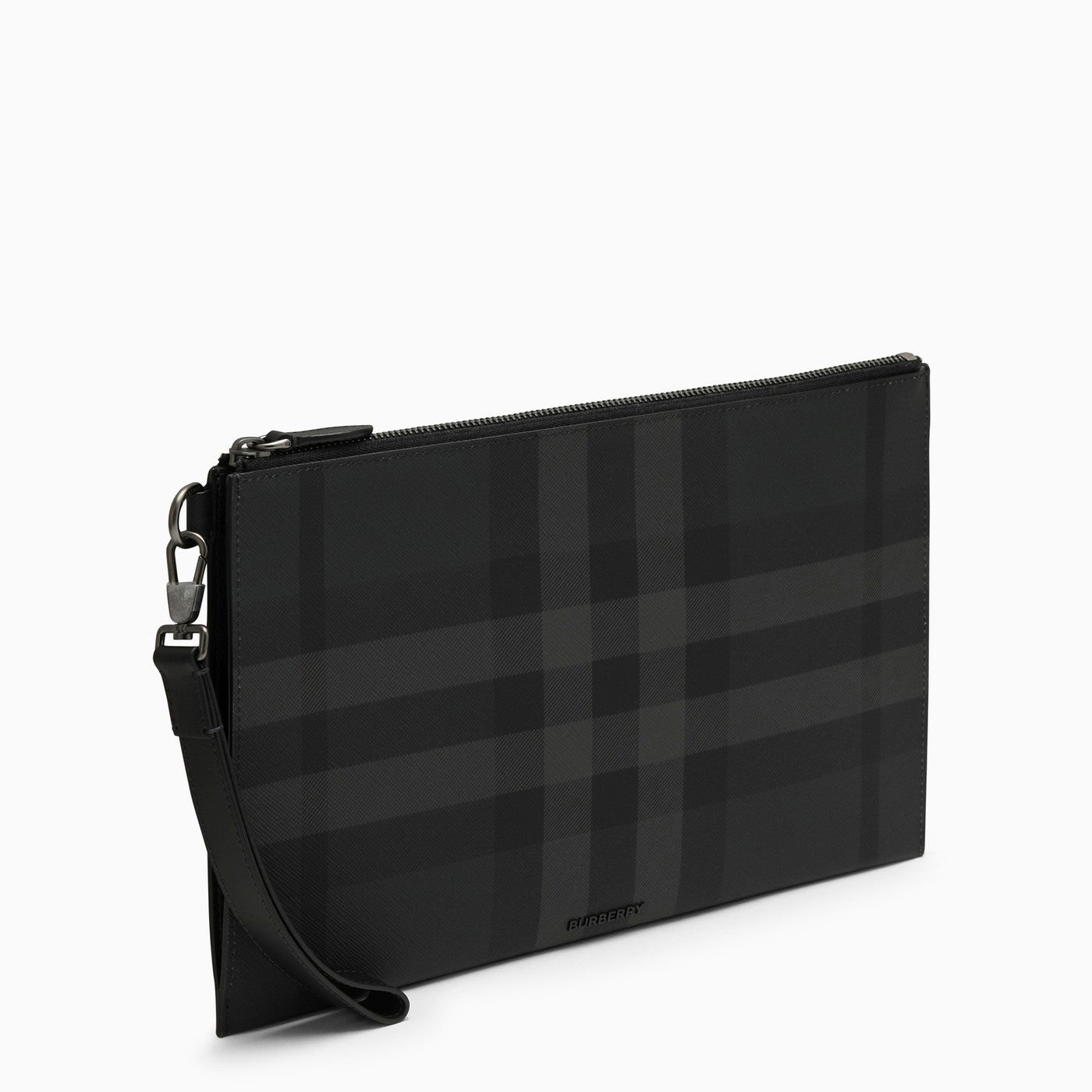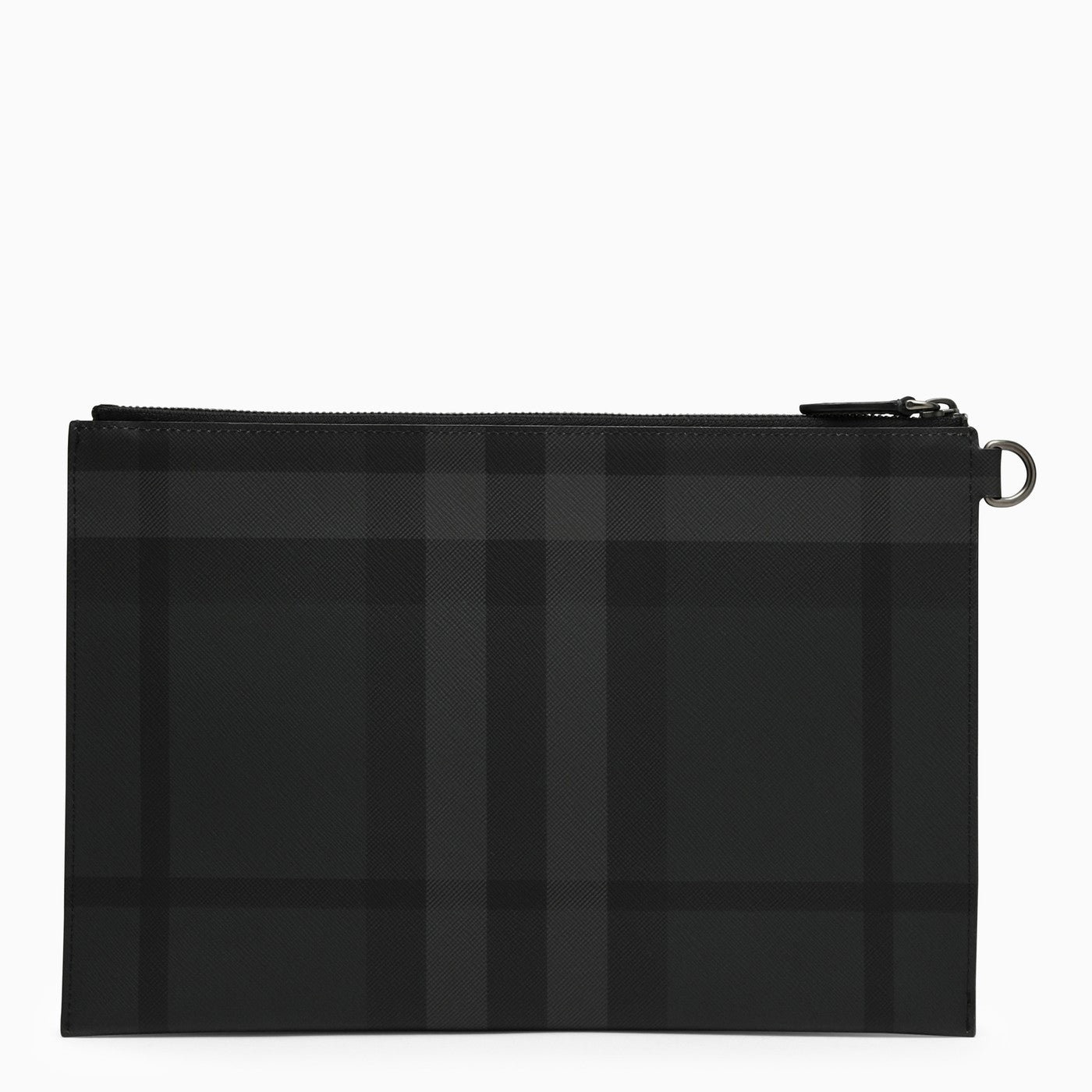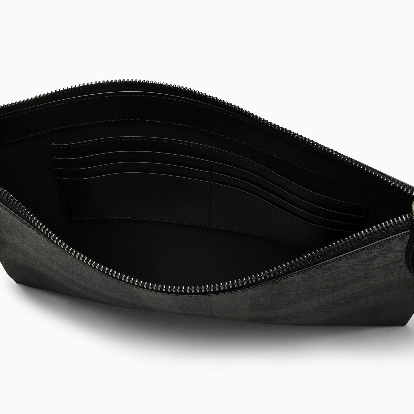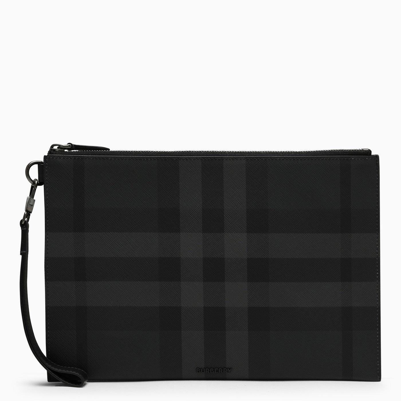 Zipped pouch by Burberry in charcoal grey coated canvas featuring Check pattern a detachable wrist strap, zip fastening and internal card compartment.