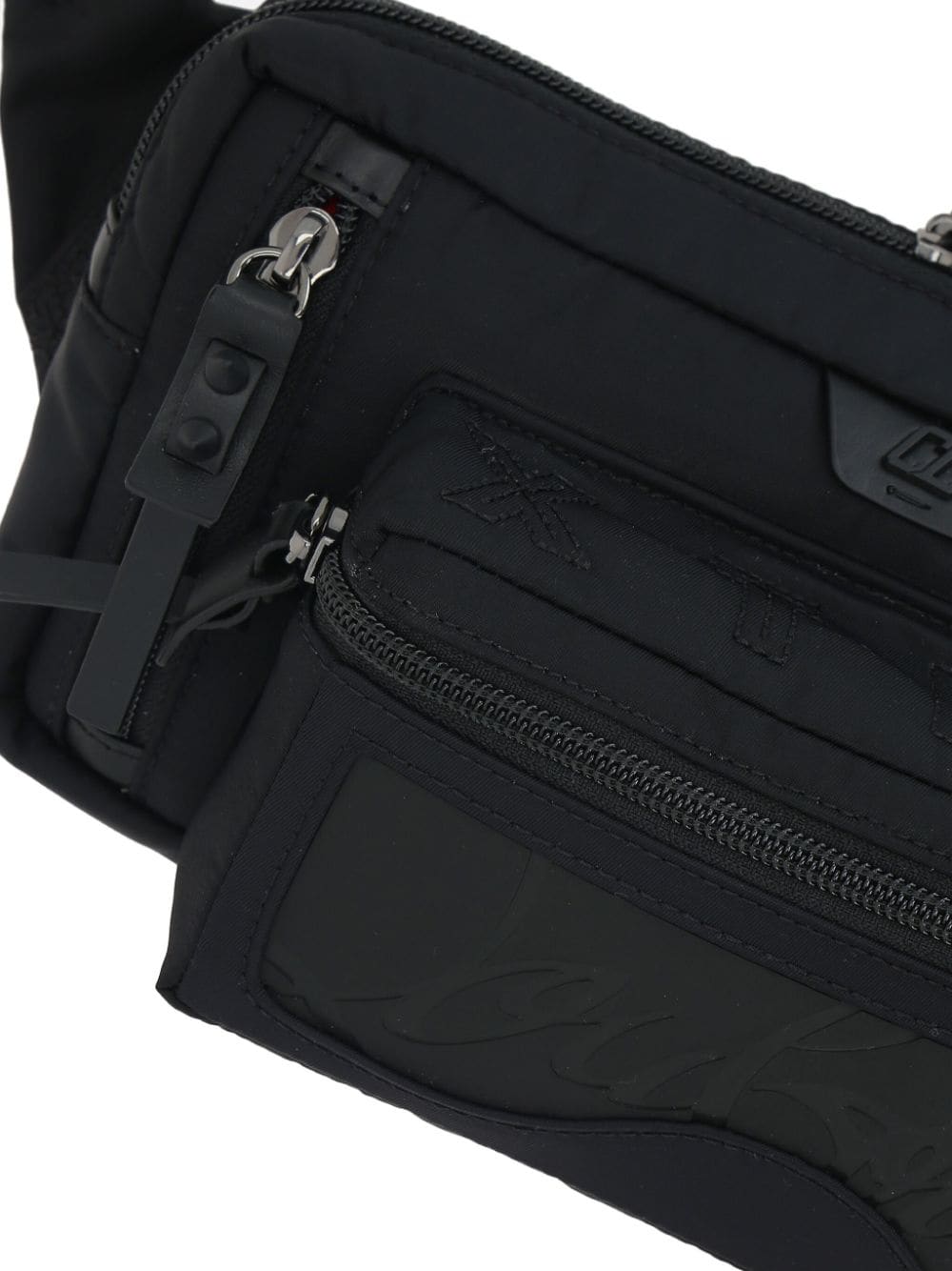 black debossed logo to the front logo-embossed strap logo-buckle detail signature CD spikes on handles nylon/rubber adjustable waist strap top zip fastening multiple zip-fastening pockets