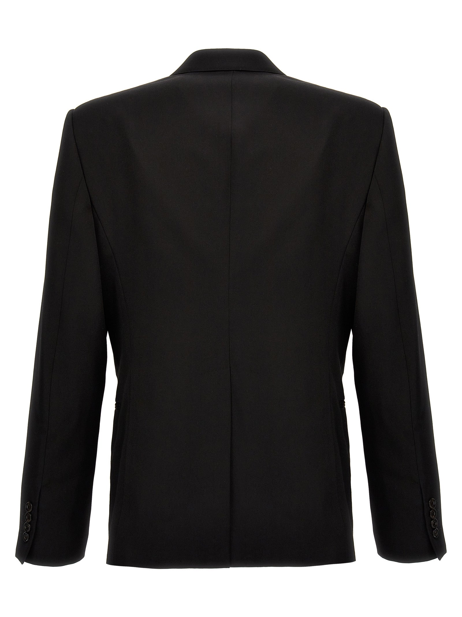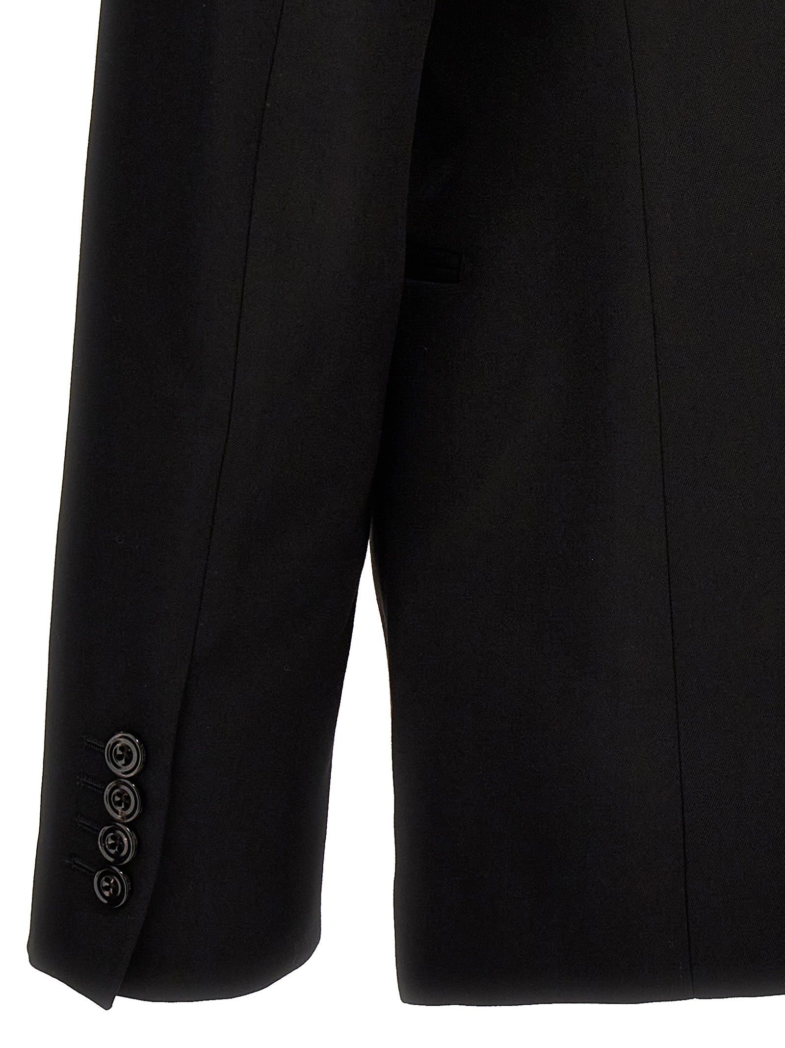 Single-breasted wool blazer with single button closure and tone-on-tone embroidered lapels.