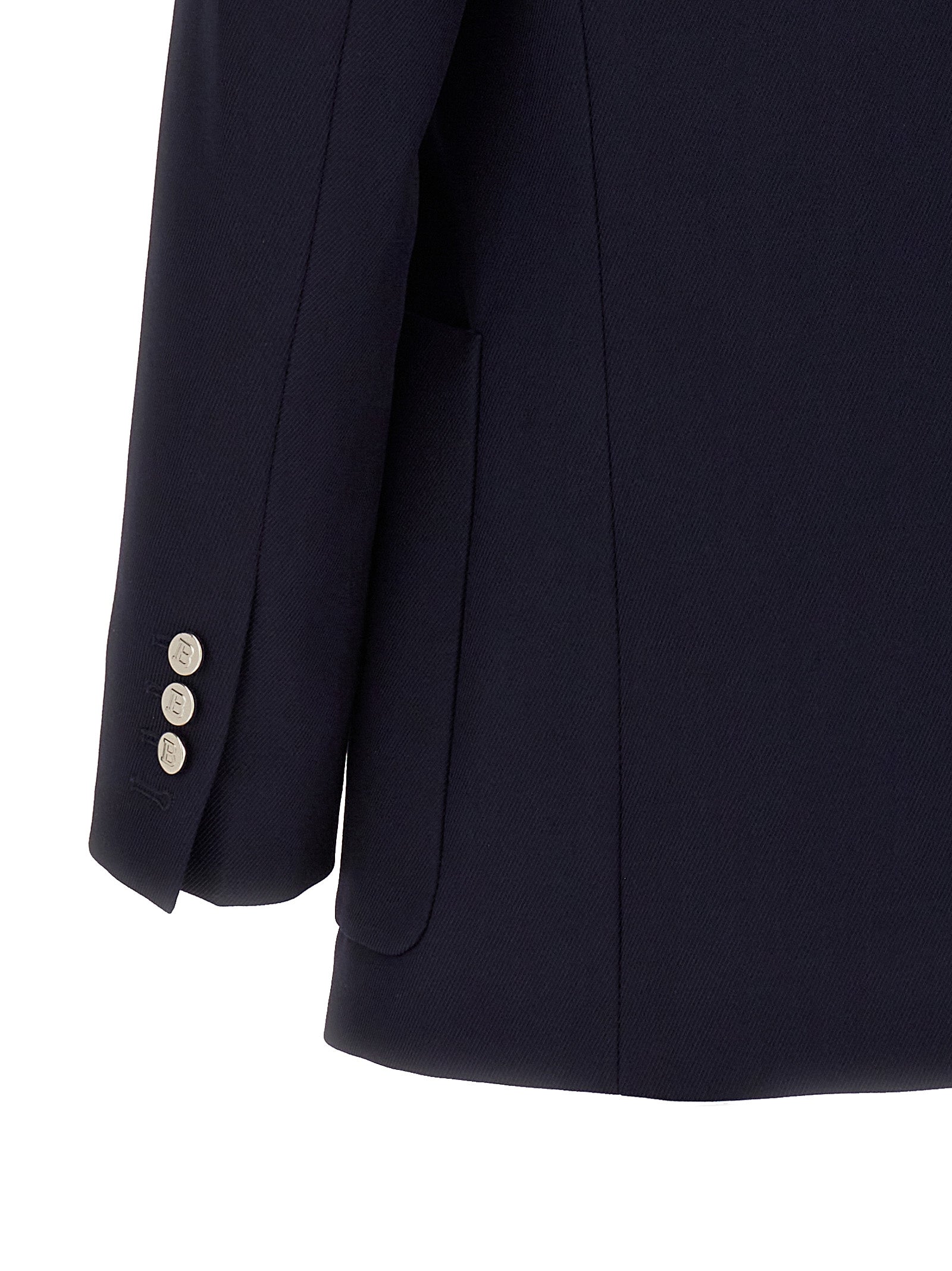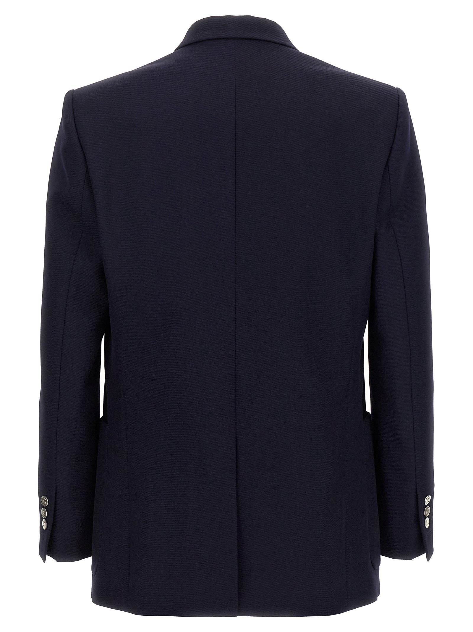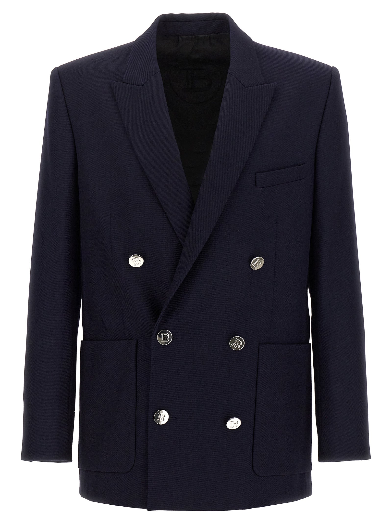 Double-breasted wool blazer with button closure, pockets, padded shoulders, long sleeves, back split.