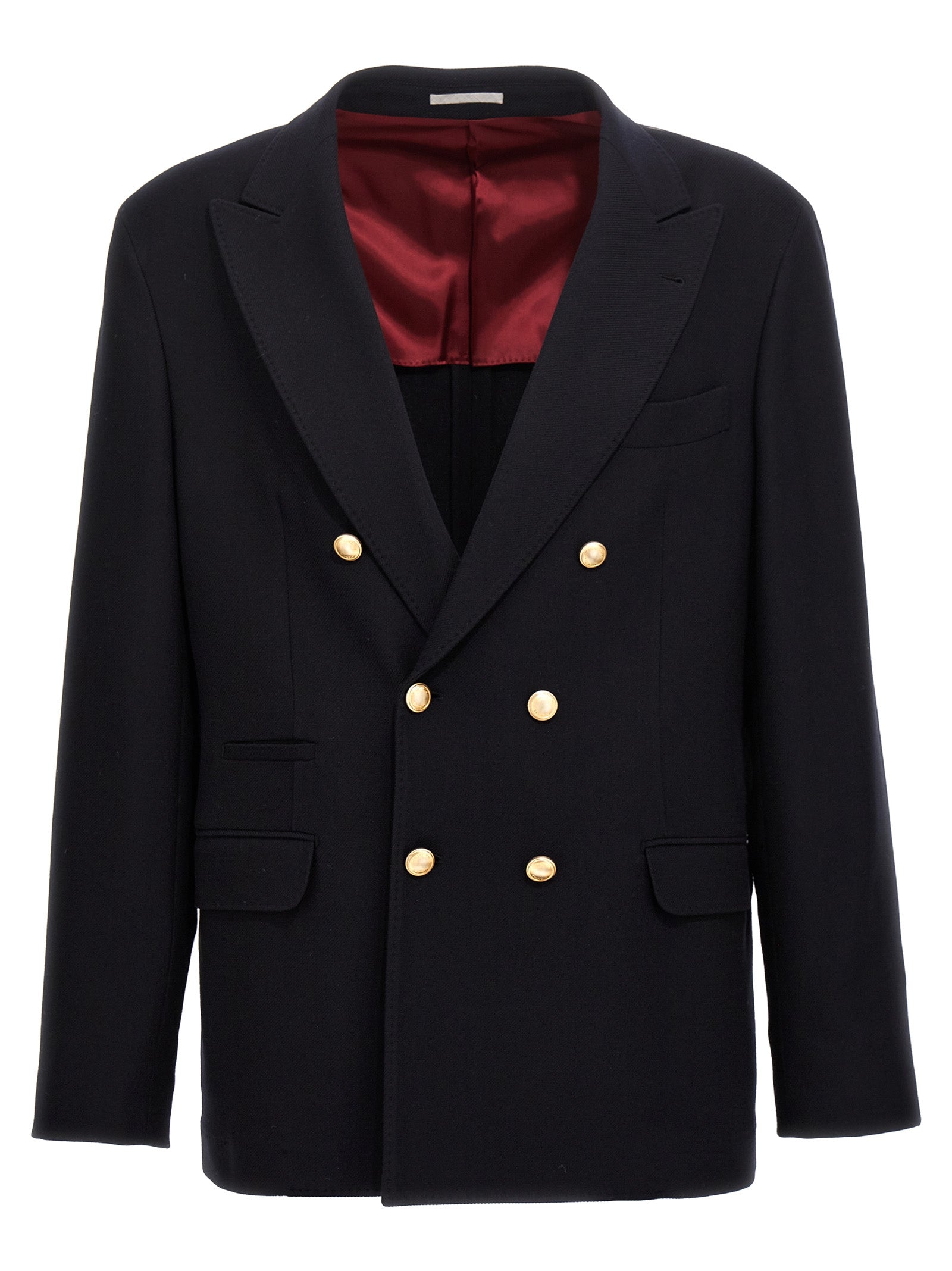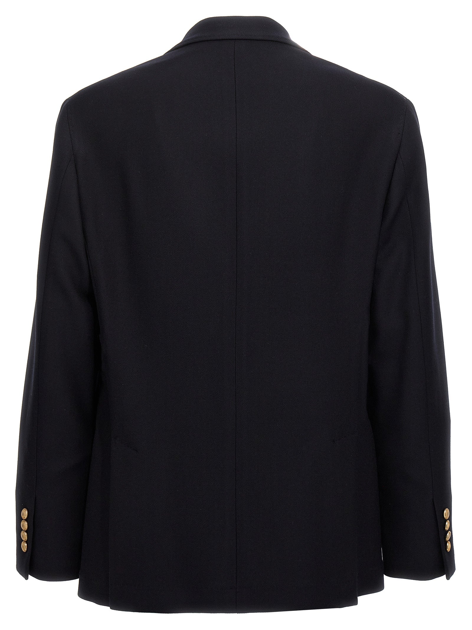 Double-breasted wool blazer with button closure, pockets, long sleeves, back vents.