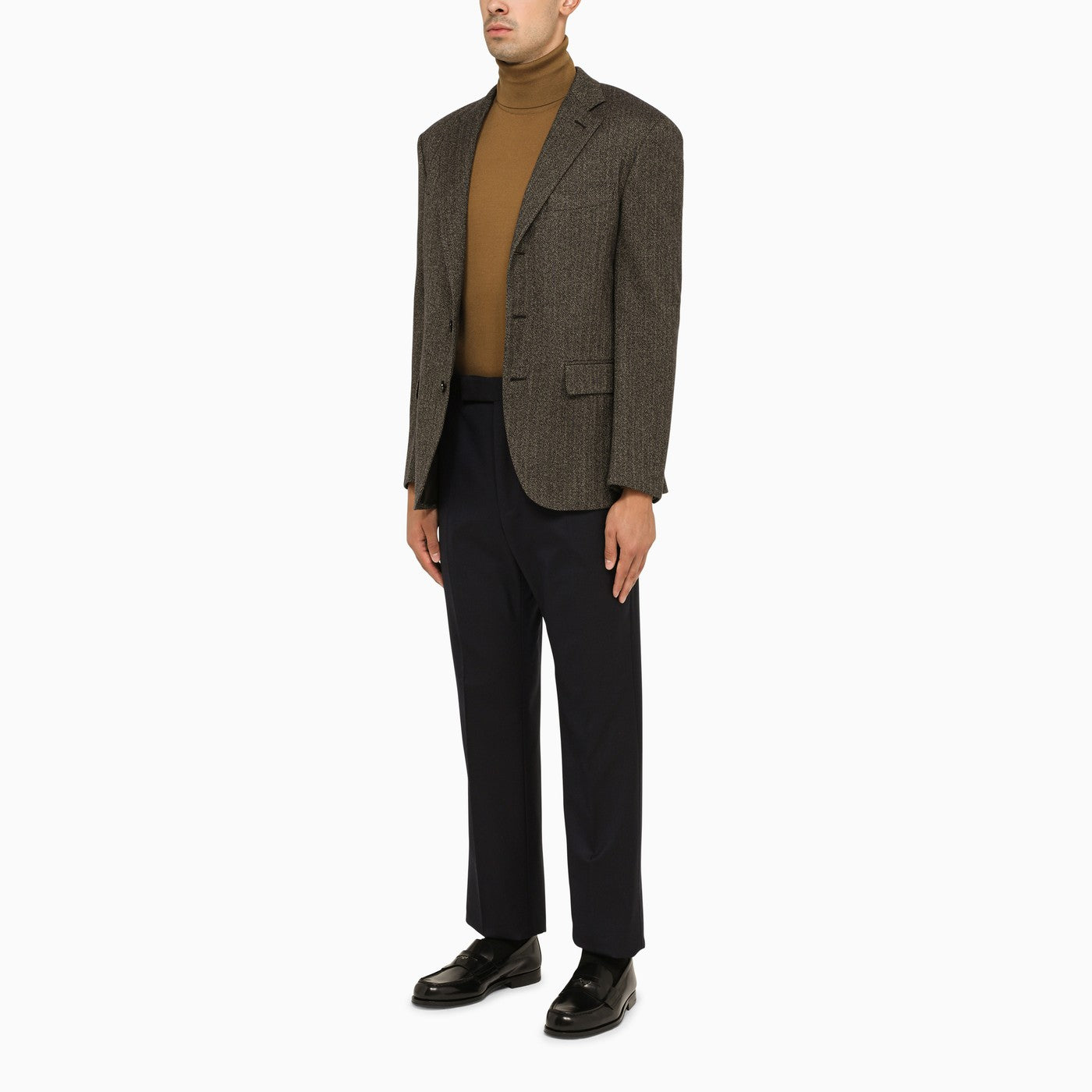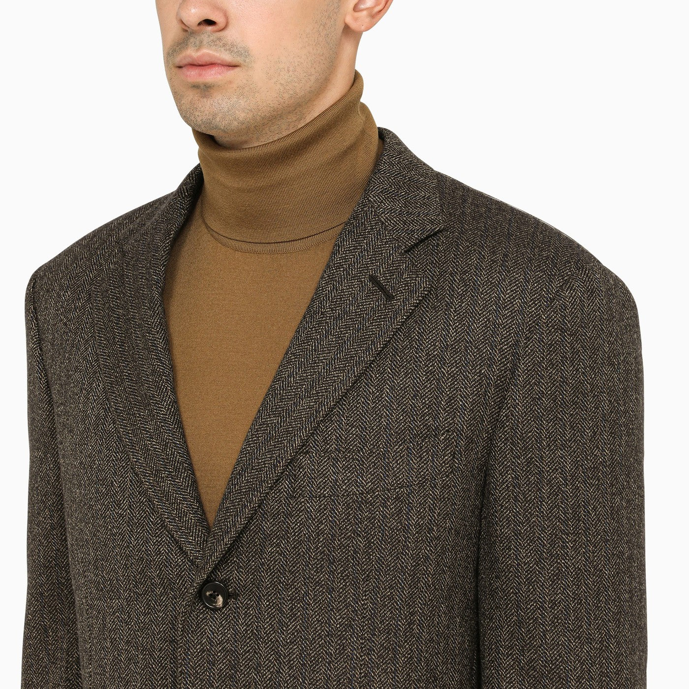 Black melange-effect cashmere single-breasted jacket from Loro Piana featuring a front button placket, two flap pockets and a welt pocket on the chest.