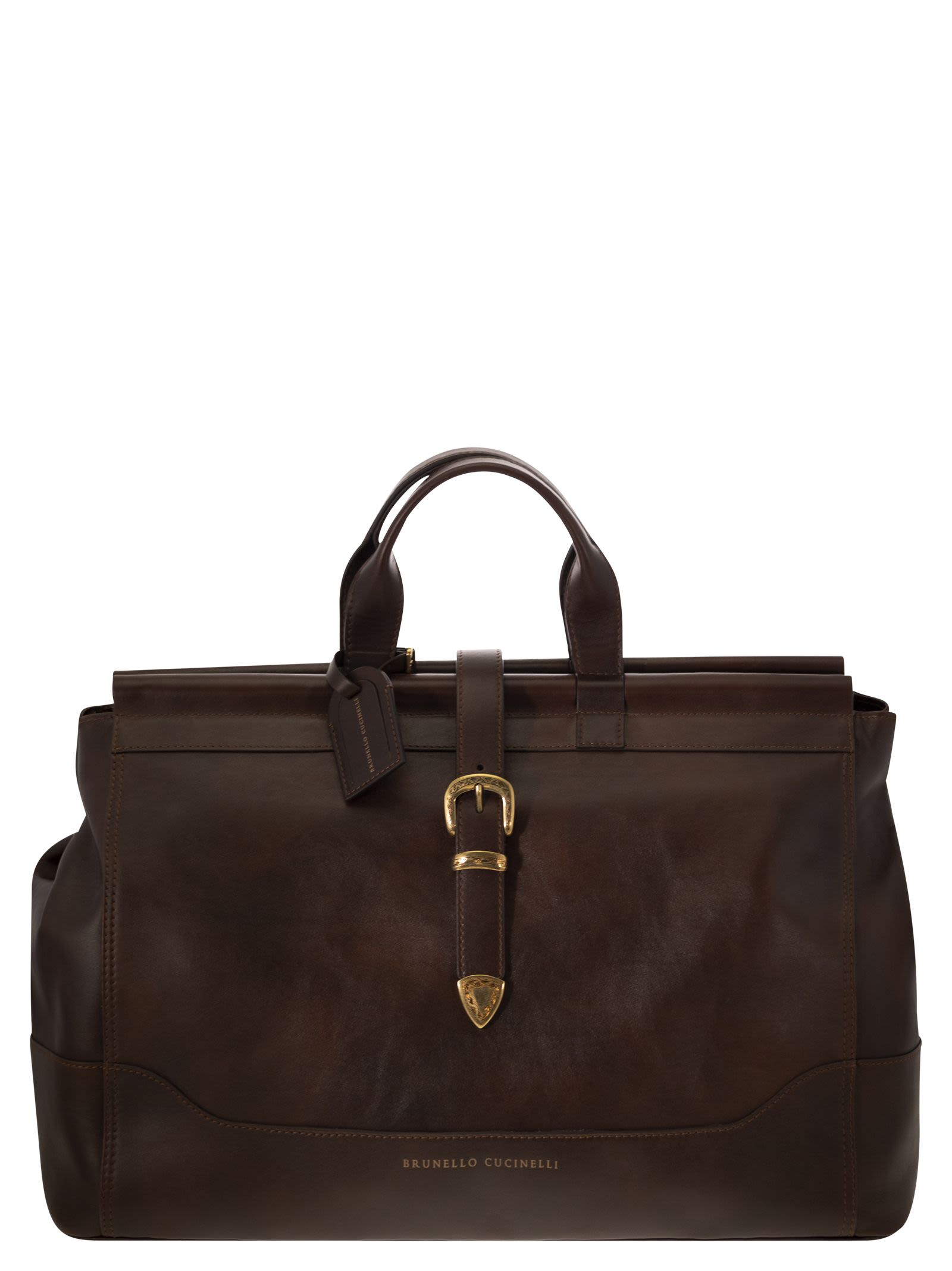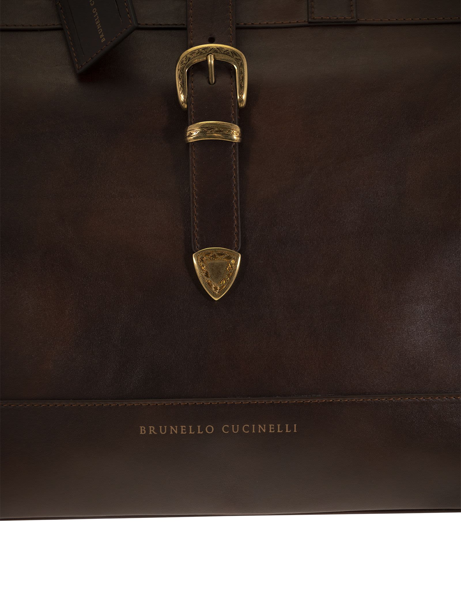 The new calfskin bag draws inspiration from classic briefcase designs. Spacious and refined, the accessory features an adjustable closure with a retro-style inlaid buckle and a capacious internal compartment. The exterior and interior pockets allow you to better organise your space. - Adjustable strap closure - Double handle - Exterior zipped pocket - Water-repellent fabric lining - Inside pocket with zip closure - Open inner compartment DESIGNER ID: MBCIU422 C8457 C.V.