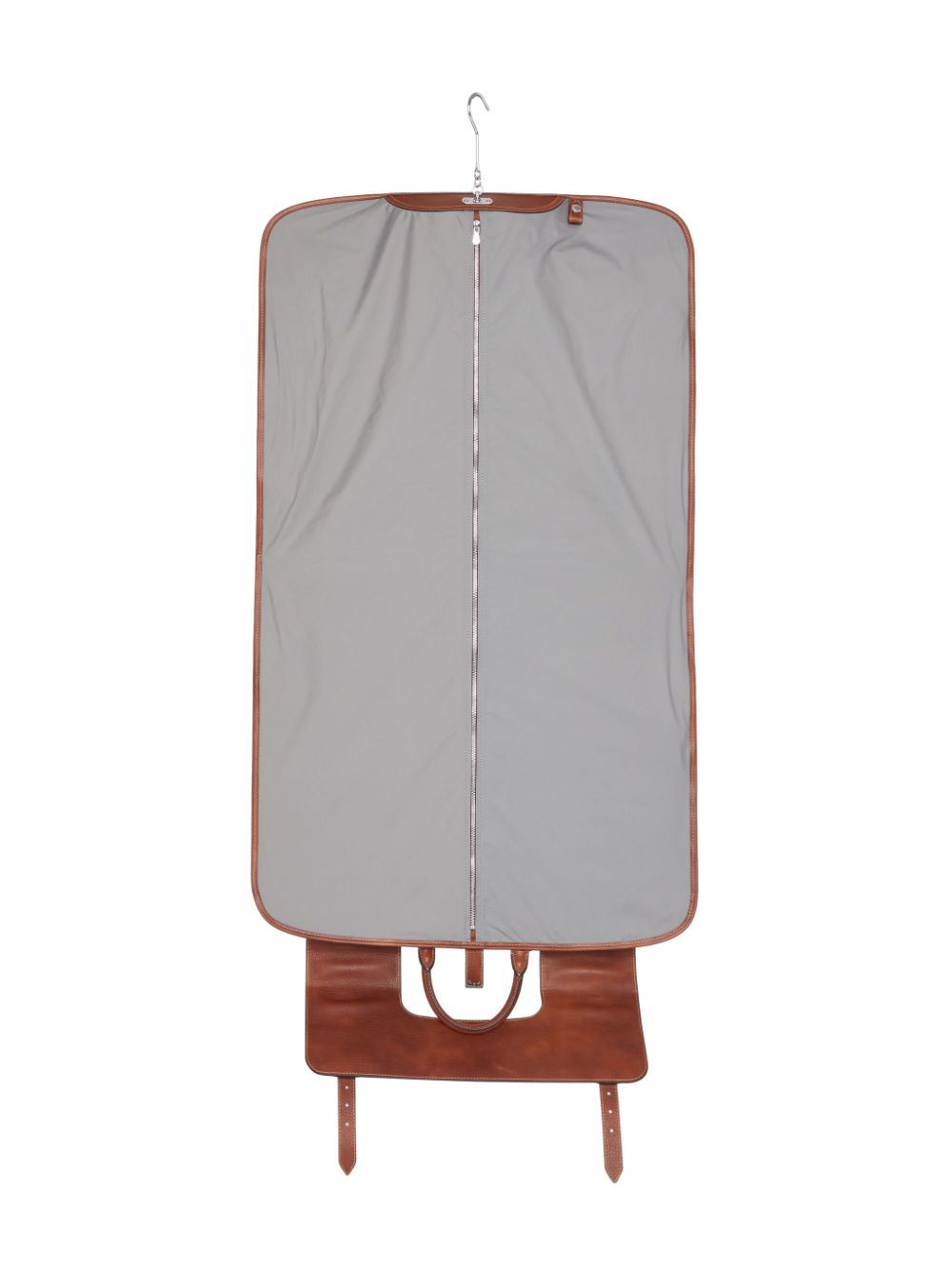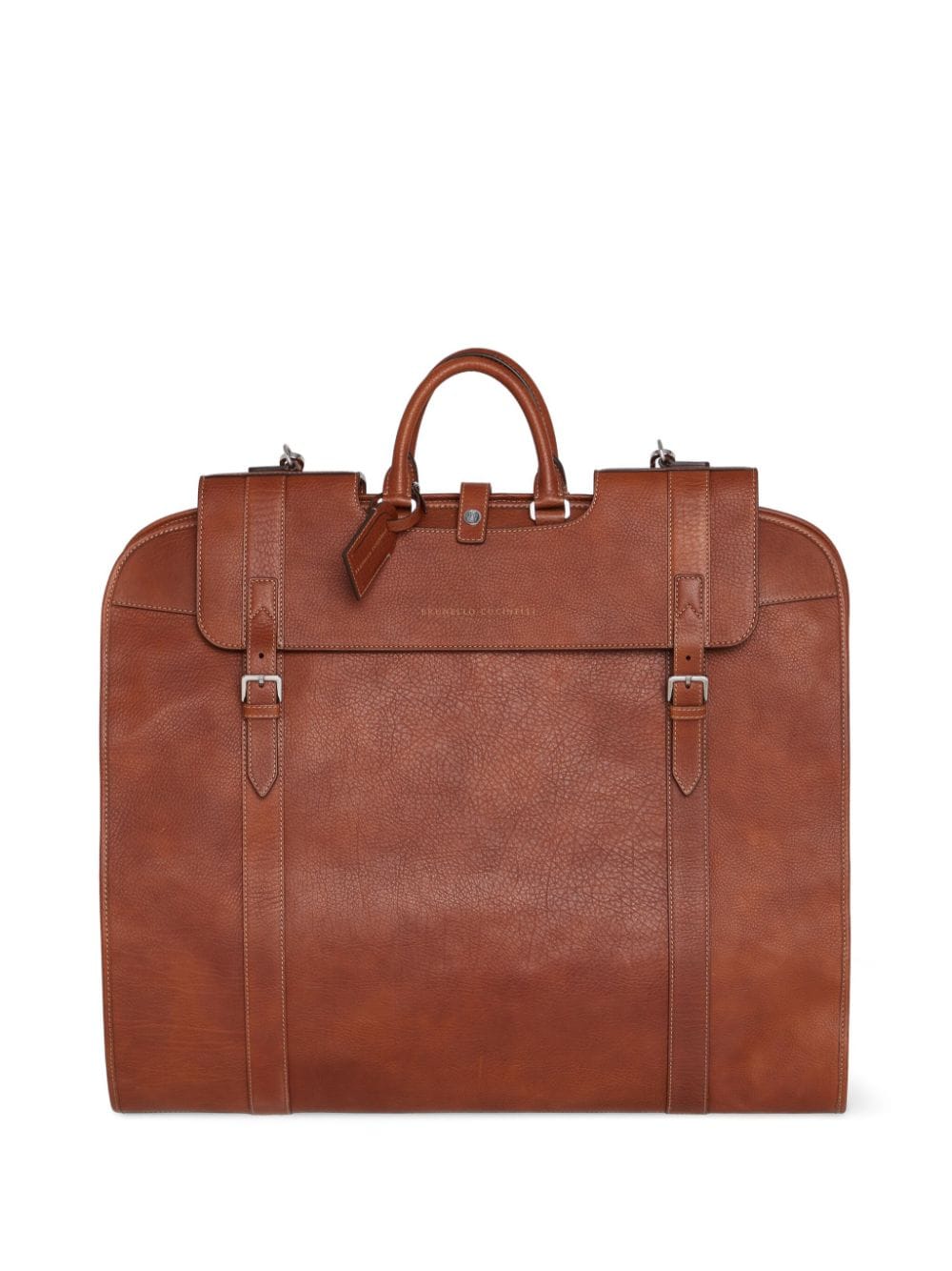chestnut brown calf leather debossed logo to the front luggage tag two rolled top handles foldover design buckle fastening rear slip handle internal zip fastening